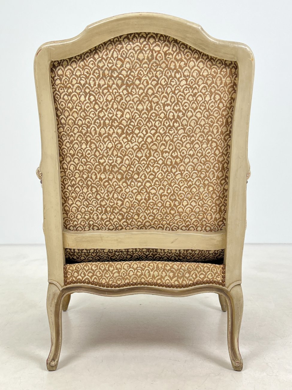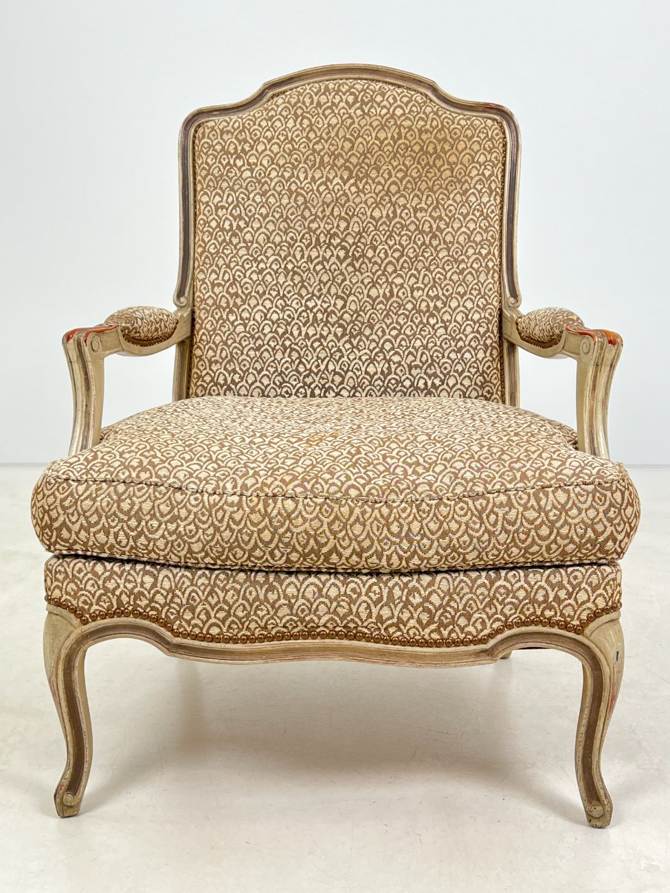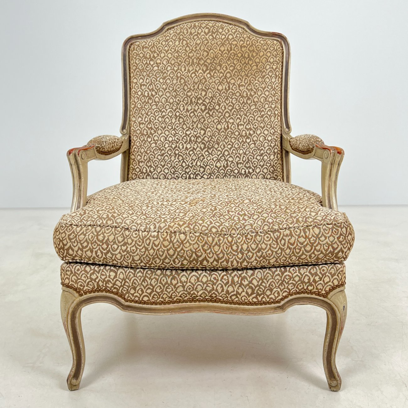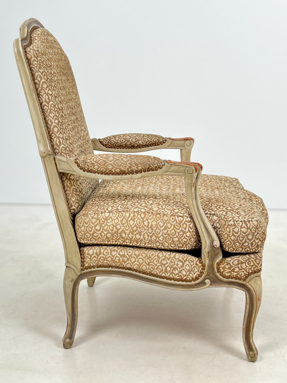 Klasikinis sendinto medinio rėmo krėslas su gobelenu.