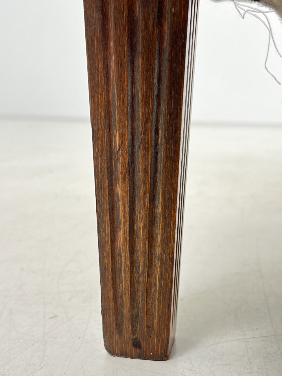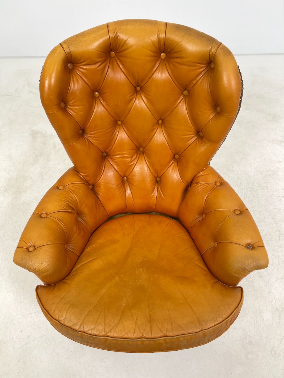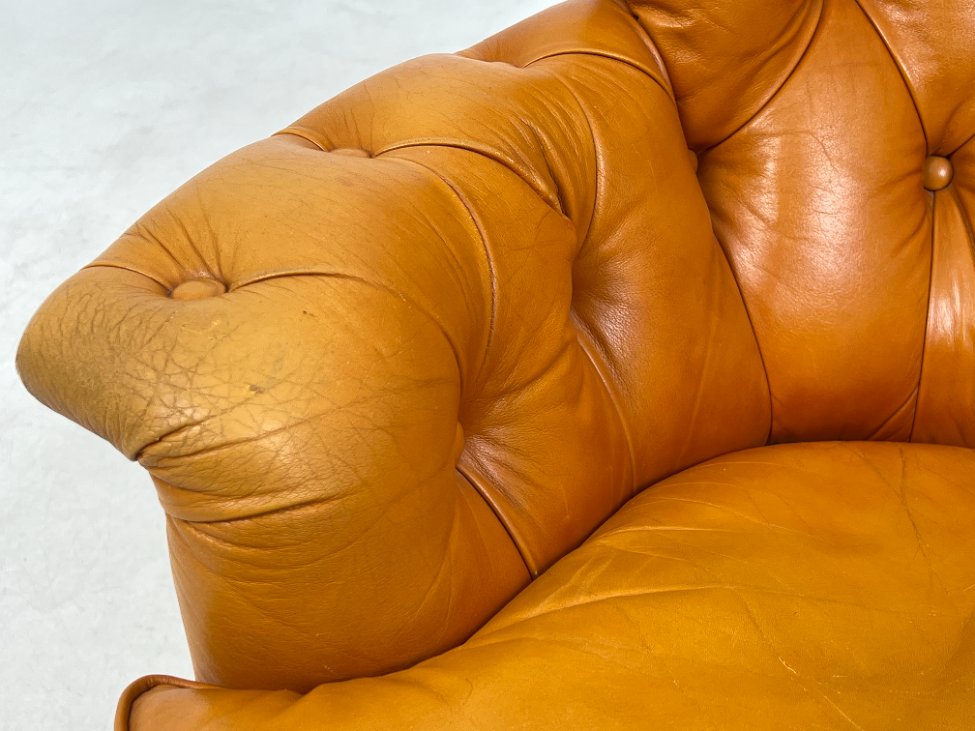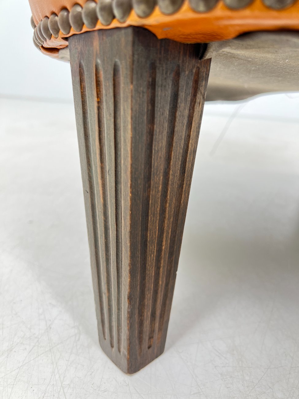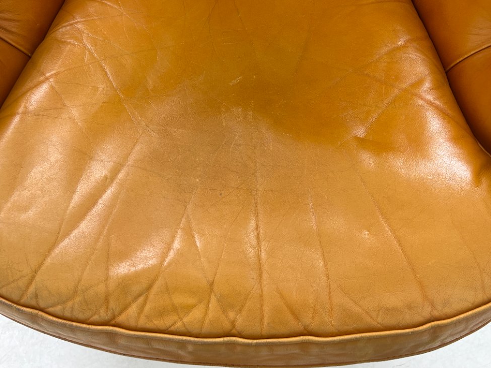 | Papildoma informacija | Sėdimosios dalies aukštis 43 cm. Nugarinėje dalyje yra įdūbimų, yra pabraižymų ant odinės dalies, trūksta sagos kairiajame porankyje, įplyšęs dugno pamušalas, pabraižymai ant kojų. |