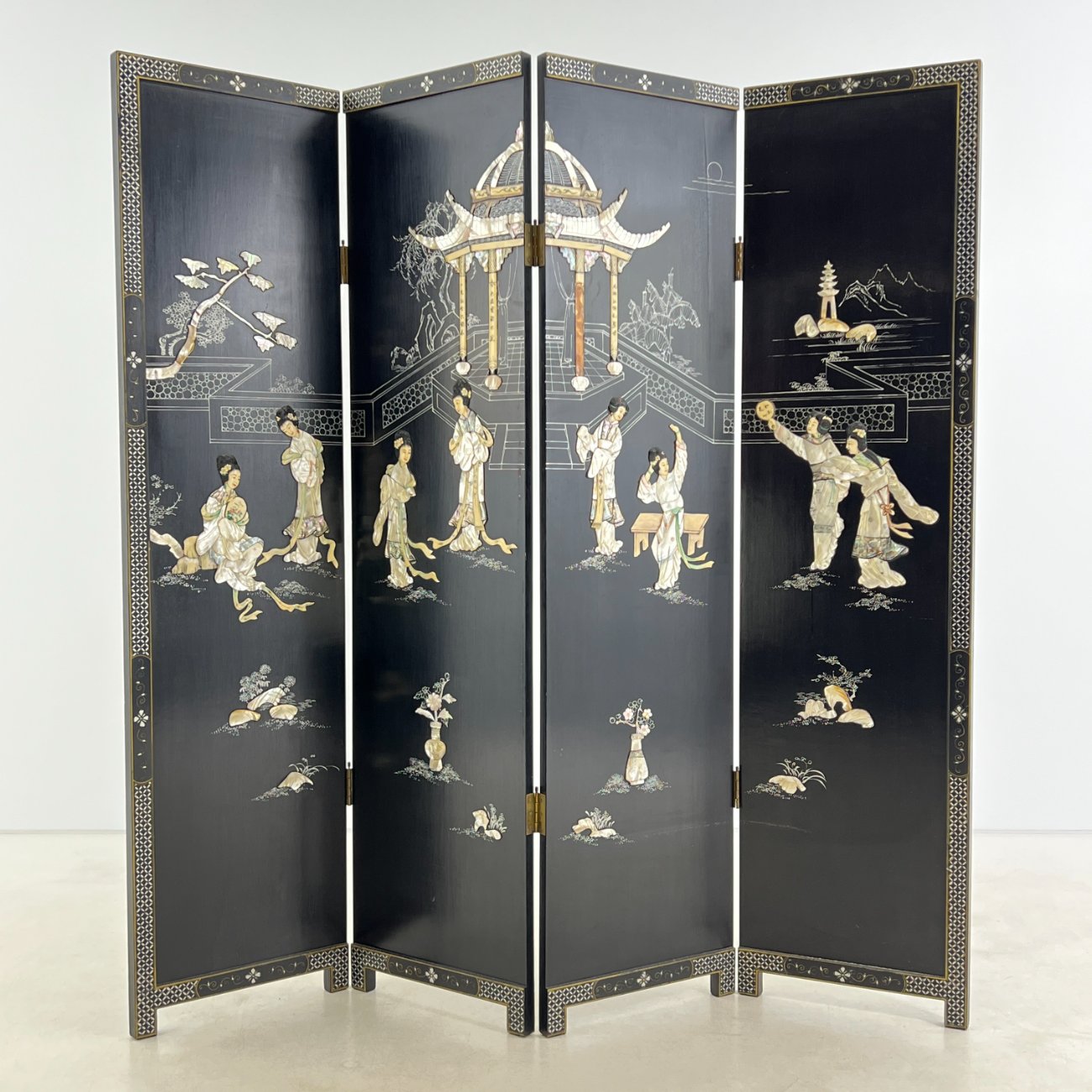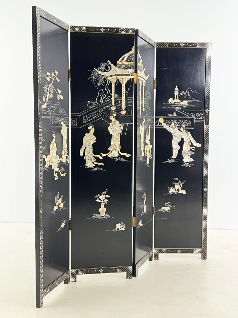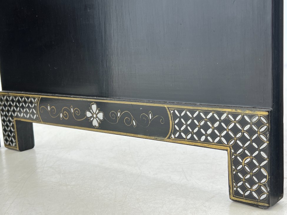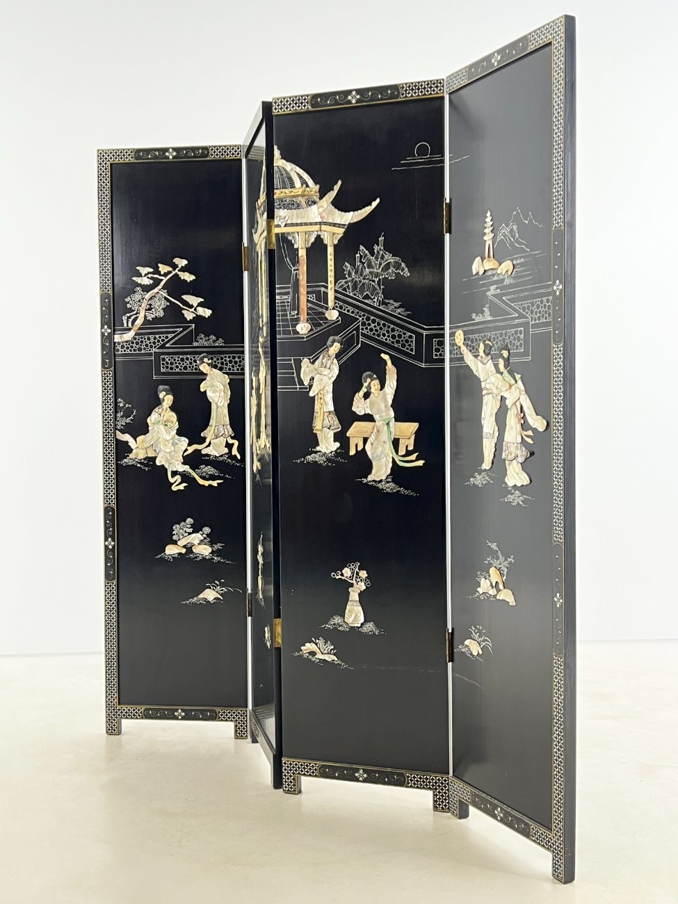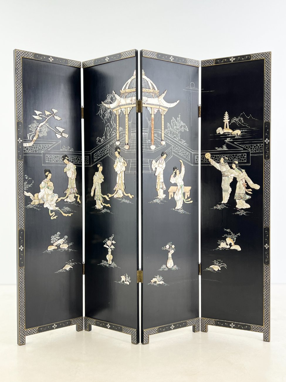 Rytietiška medinė širma su natūralaus akmens dekoracijomis.
