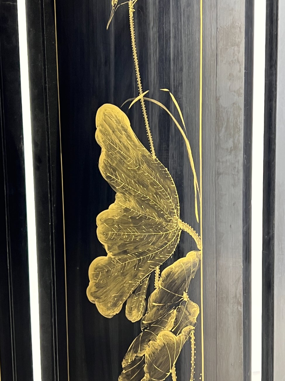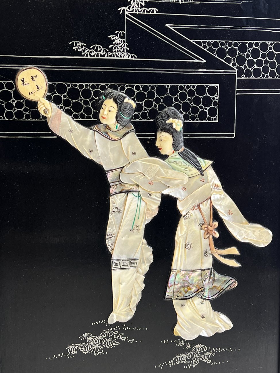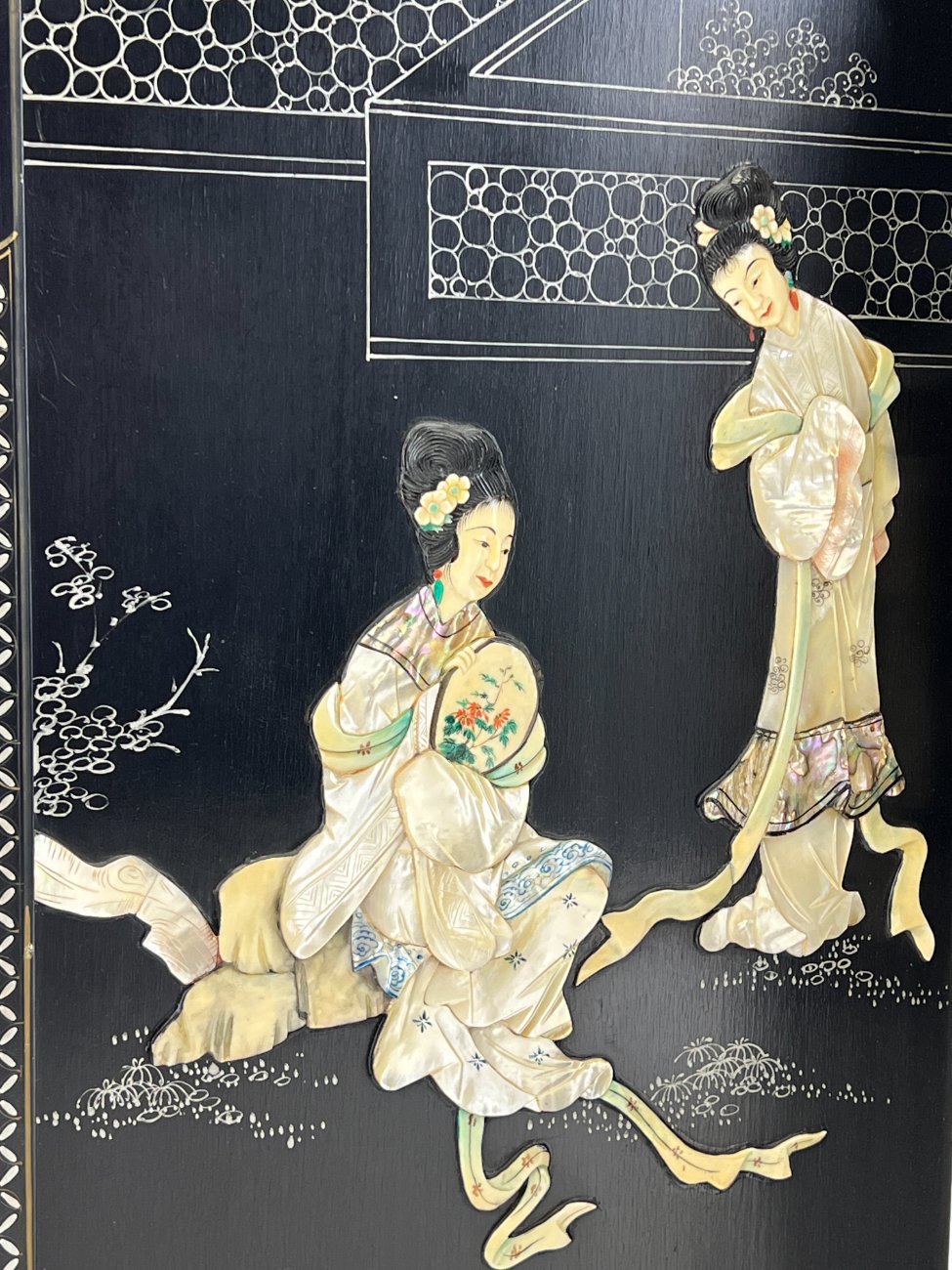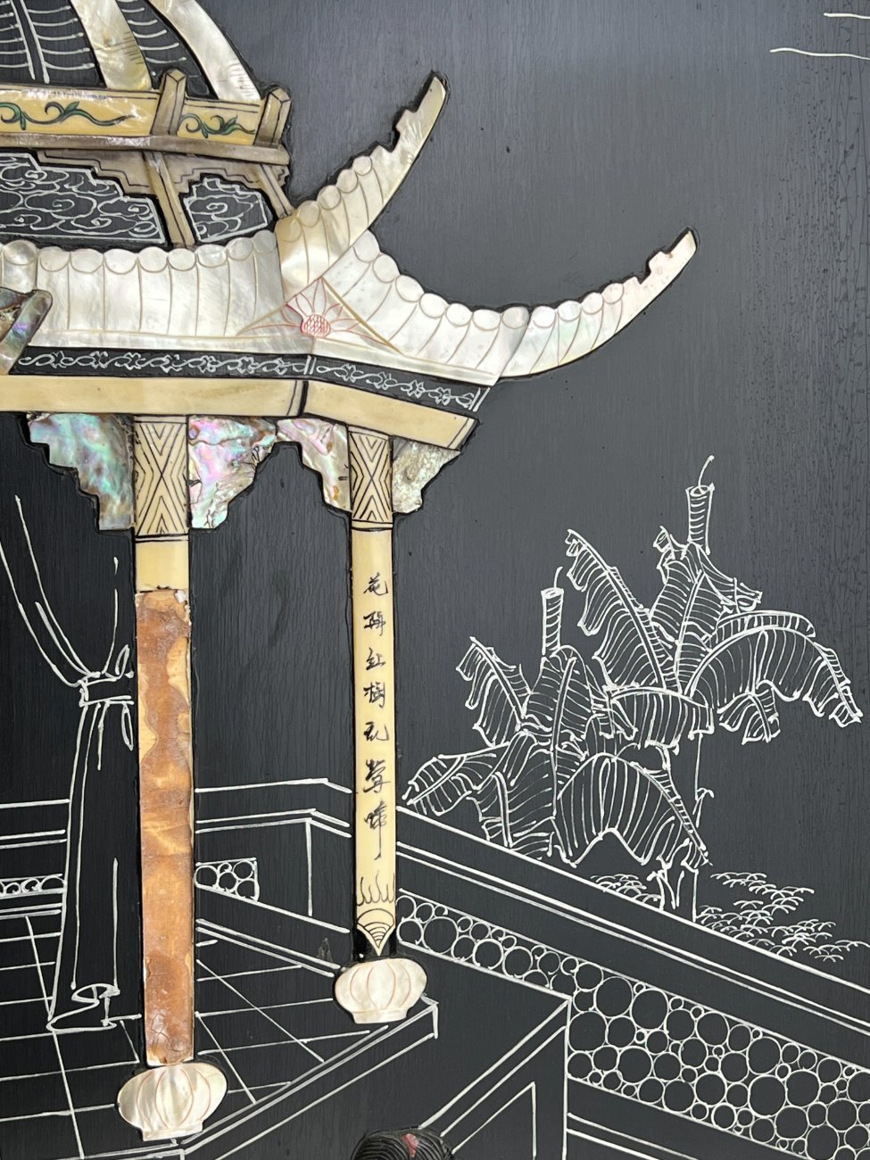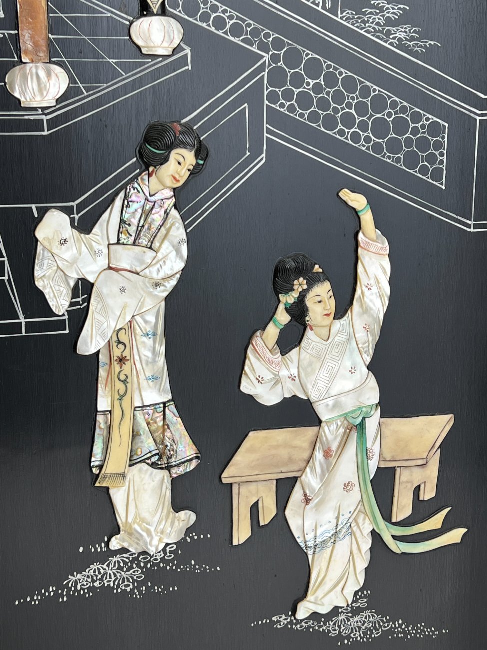 Rytietiška medinė širma su natūralaus akmens dekoracijomis.