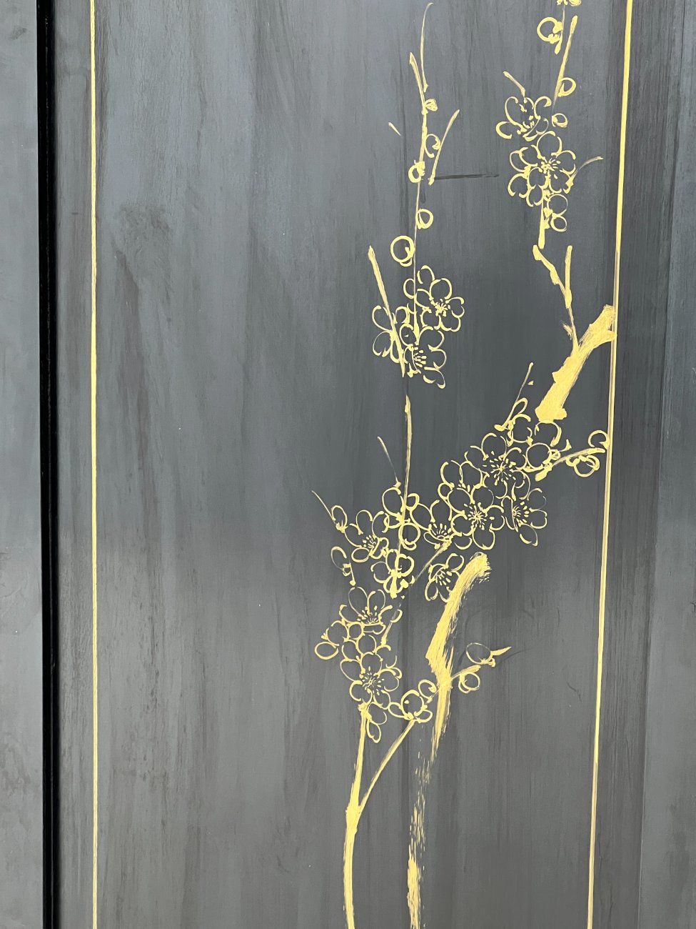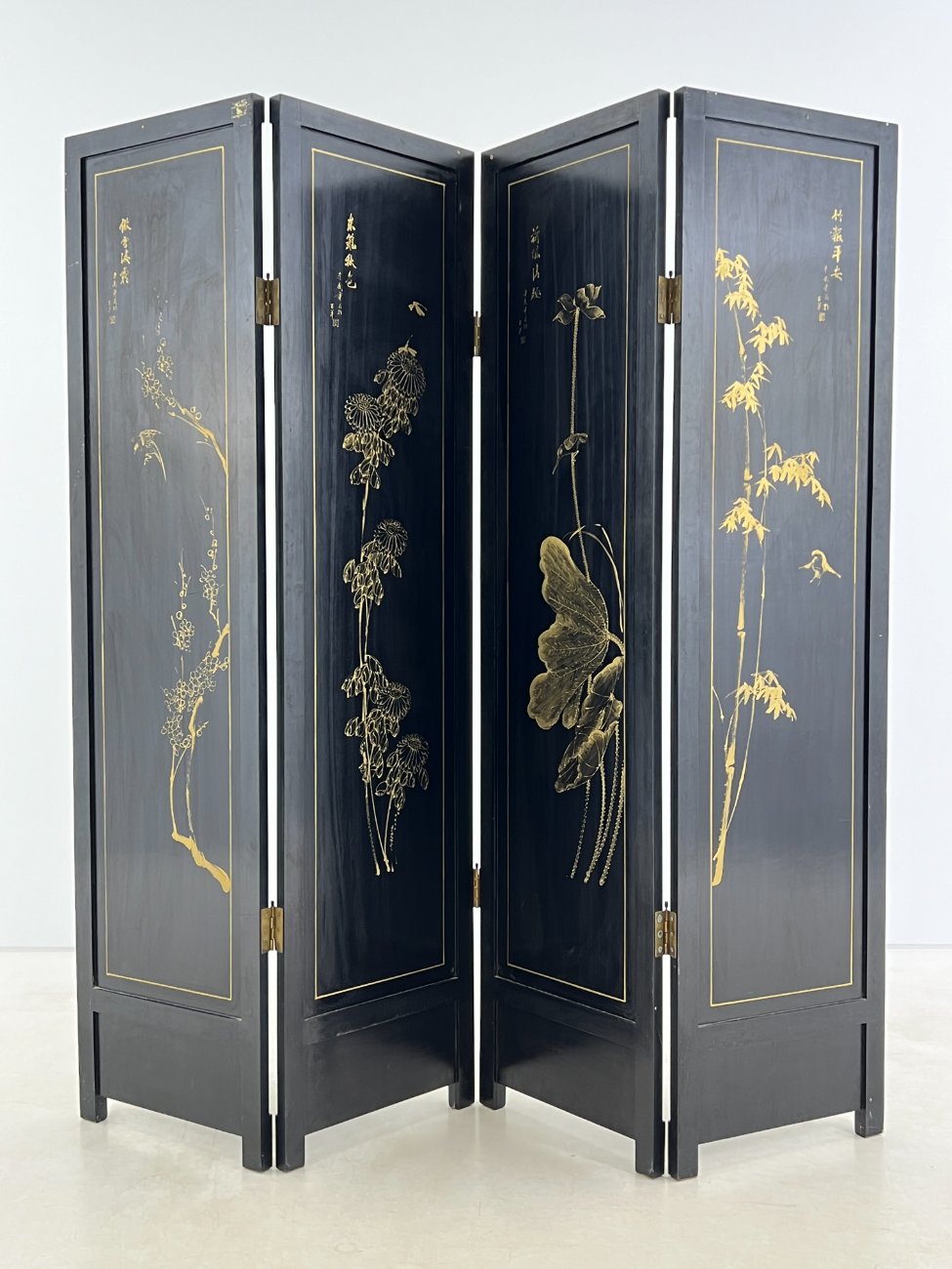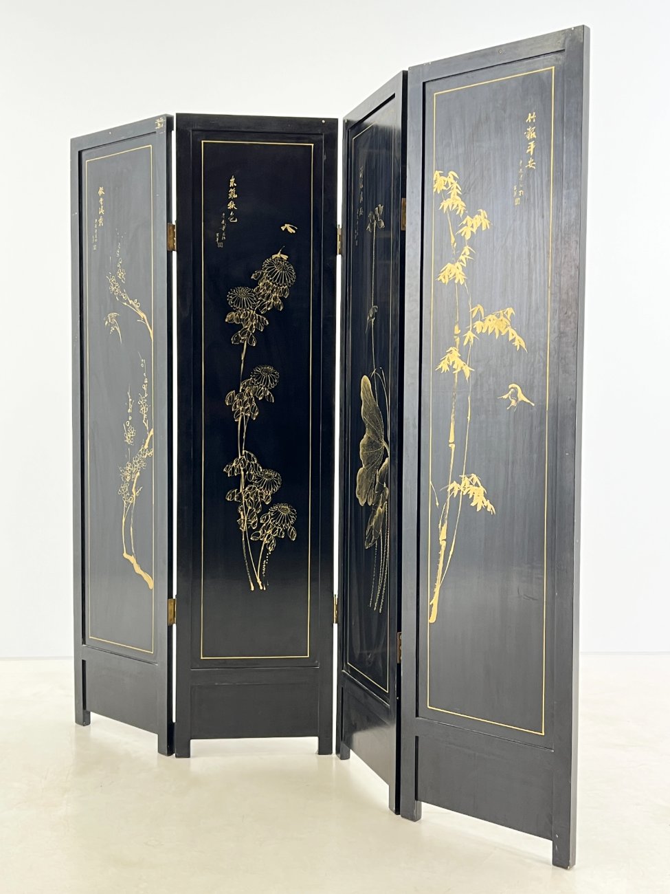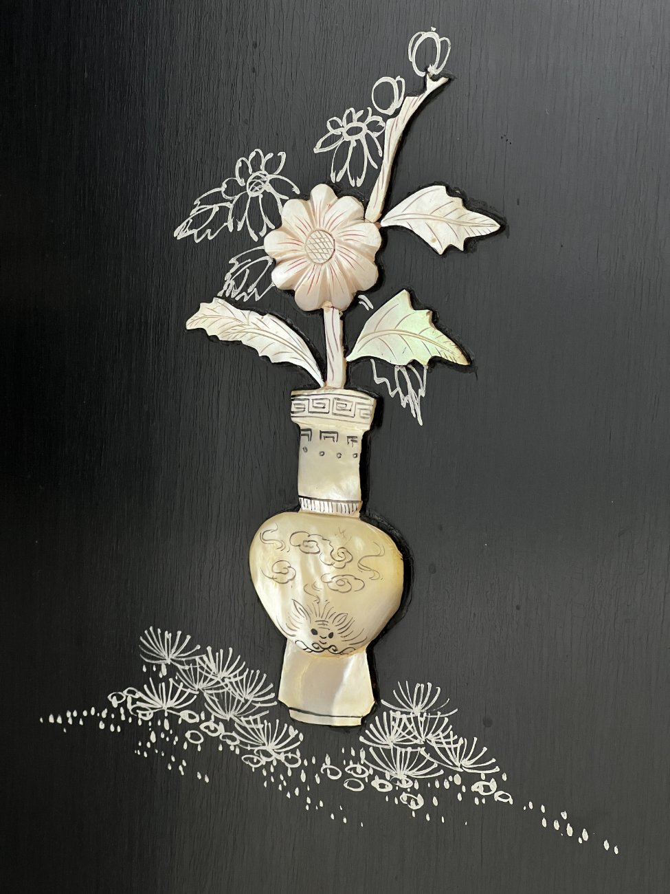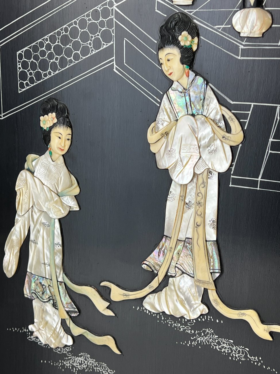Rytietiška medinė širma su natūralaus akmens dekoracijomis.
