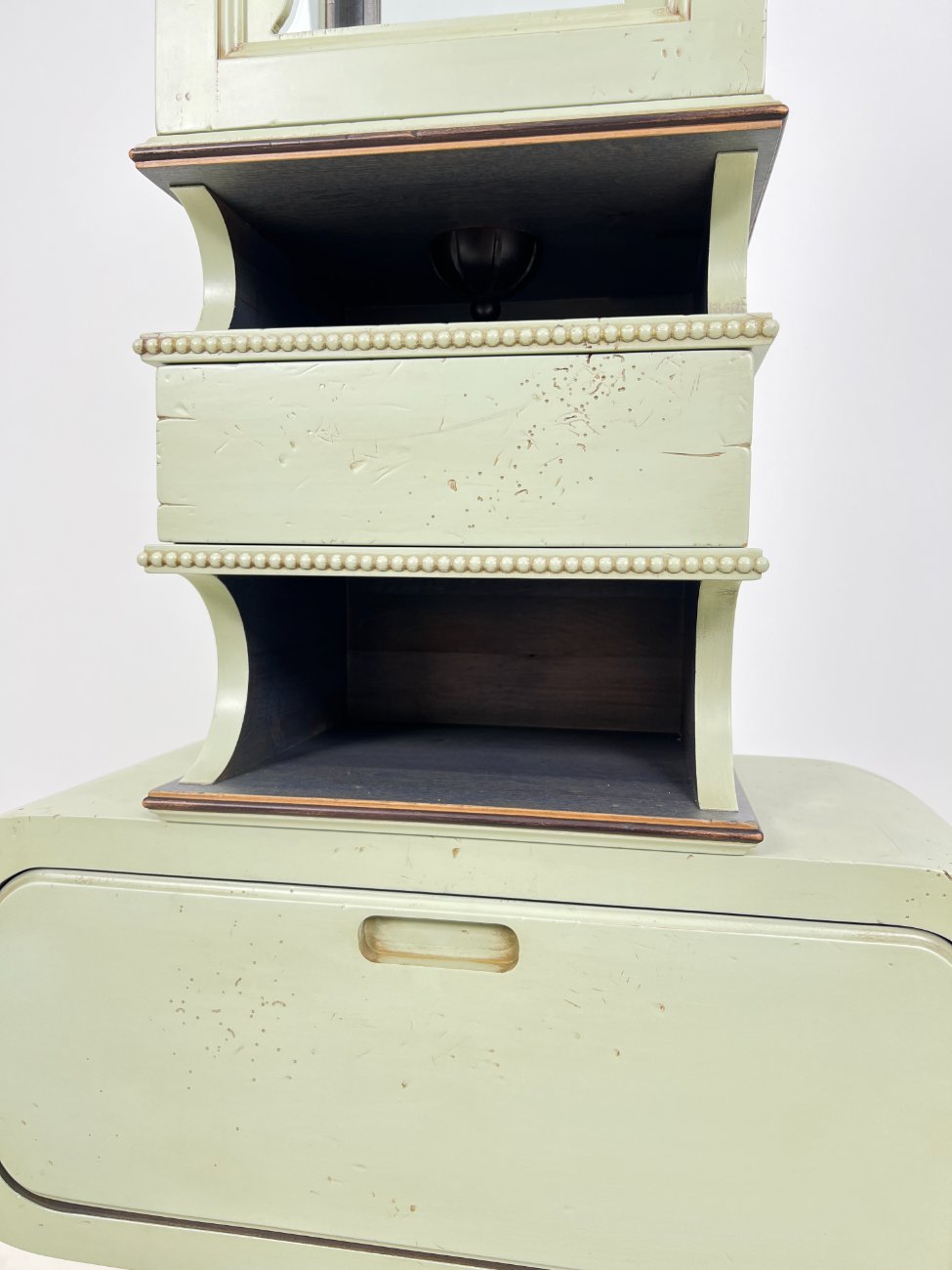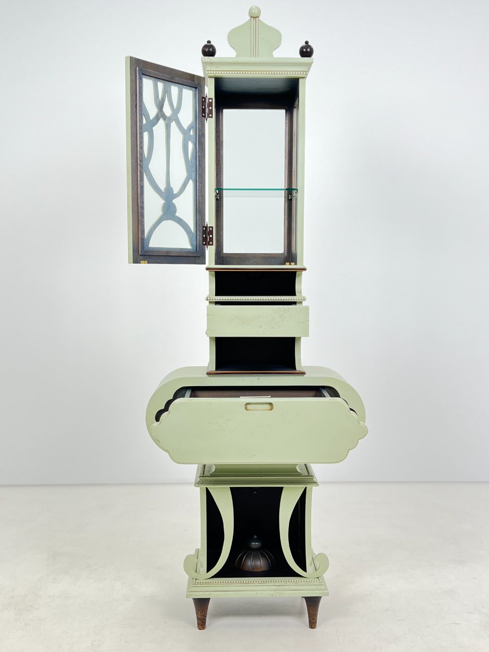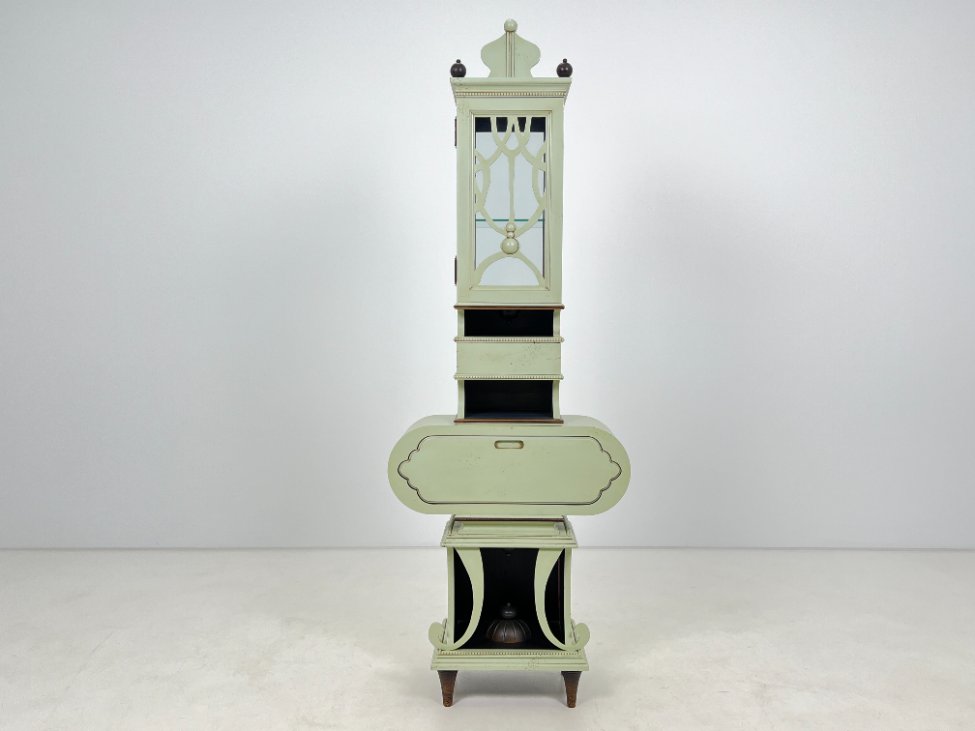 Art nouveau medinė indauja su stalčiais, raitytomis detalėmis 33x71x203 cm
