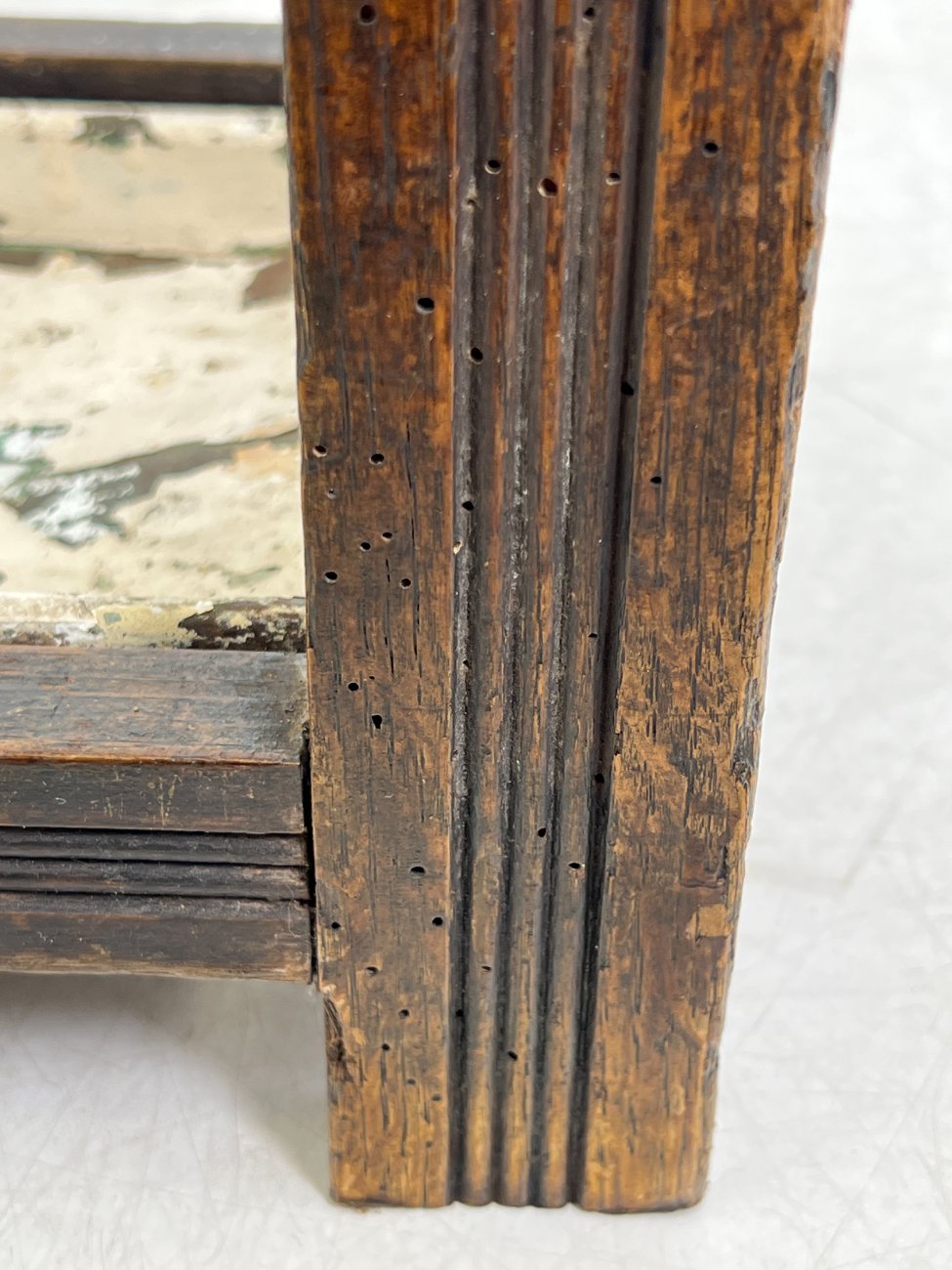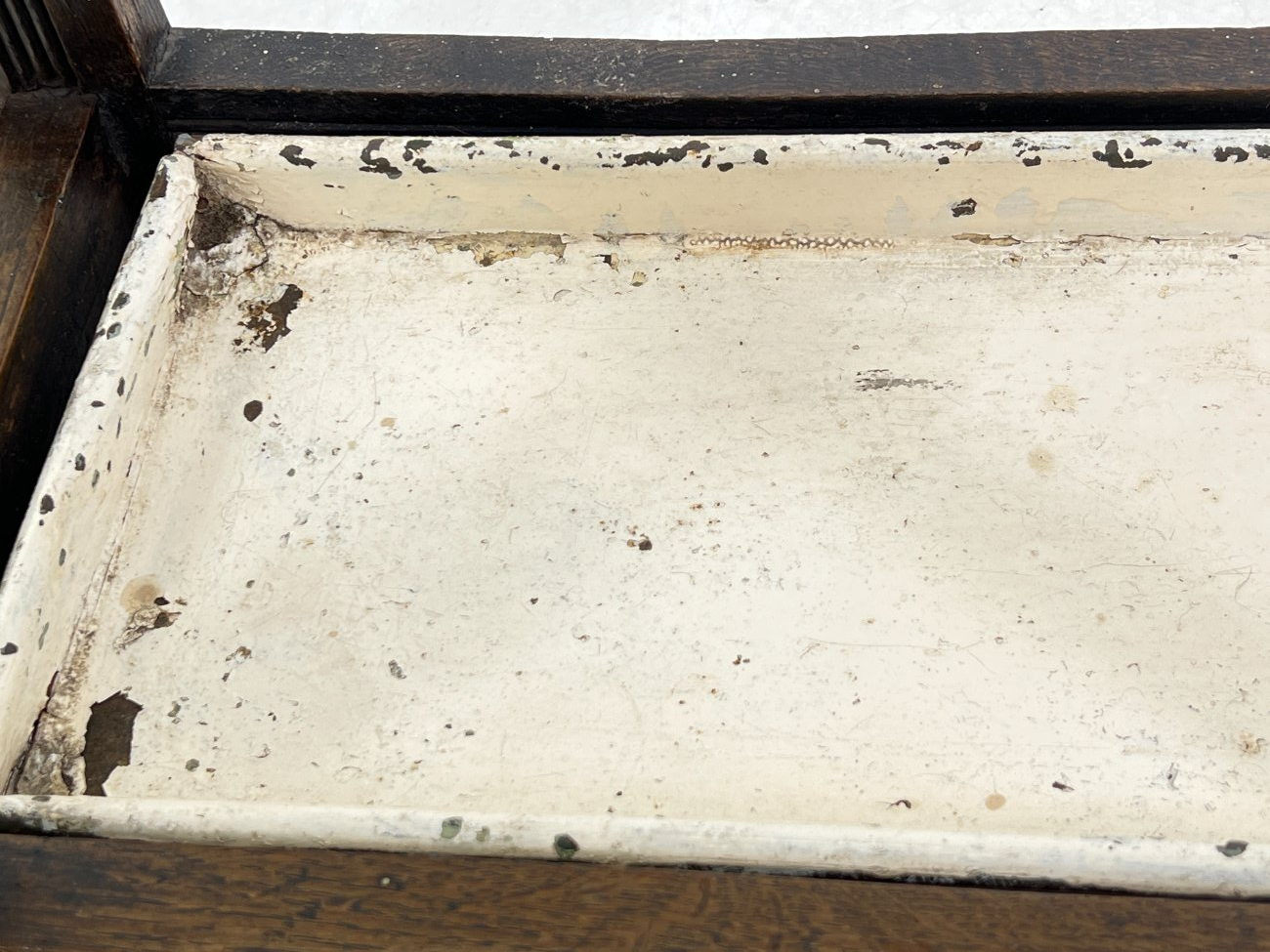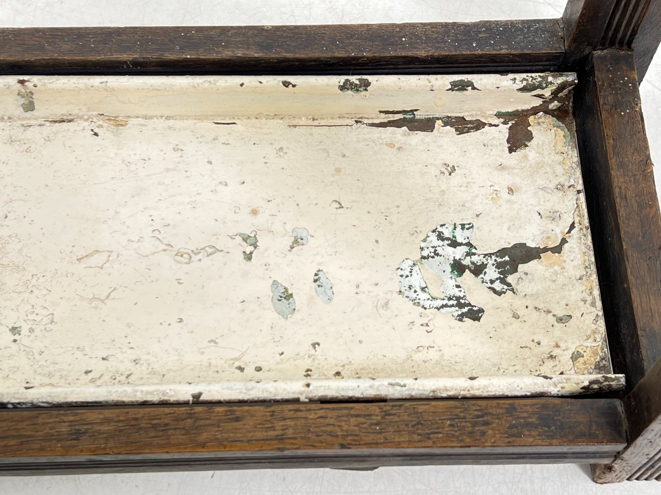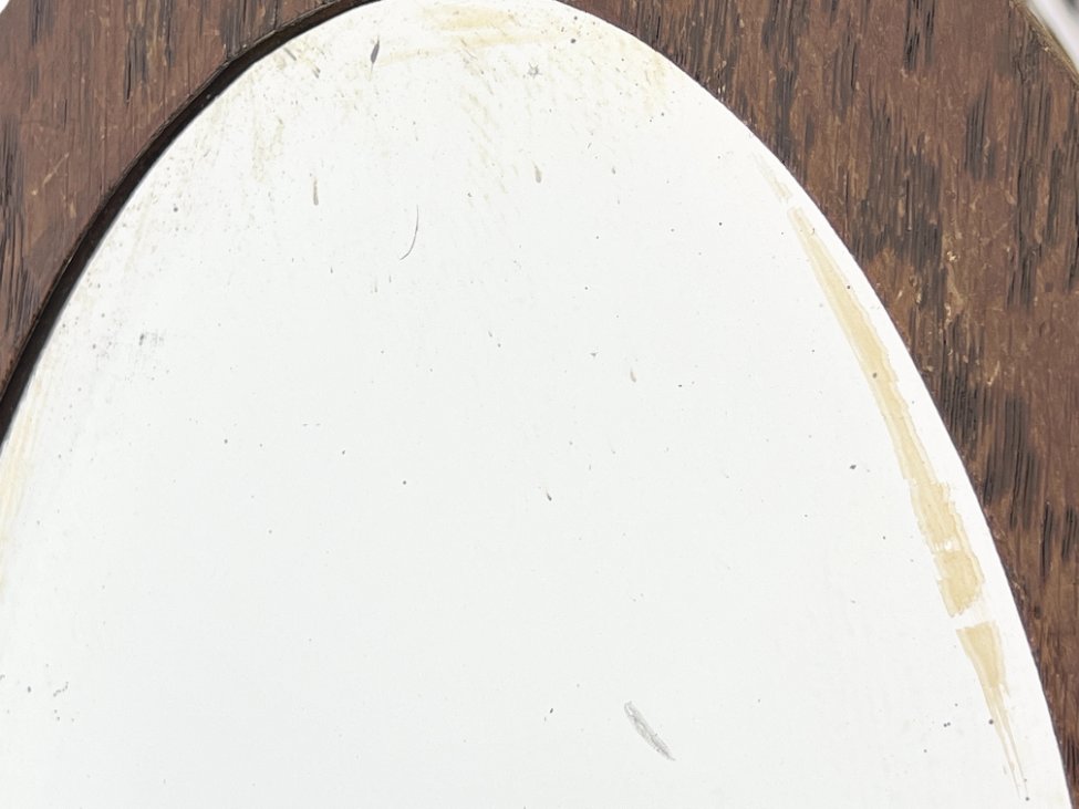 | Papildoma informacija | Deformuotas skėtinės dugnas, turi dažų pažeidimų. Pakitusi kojų apačių spalva. Per visą paviršių vietomis yra įmušimų ir pabraižymų. Ant veidrodžio matosi senėjimo dėmės. Yra kinivarpų pažeidimų. |