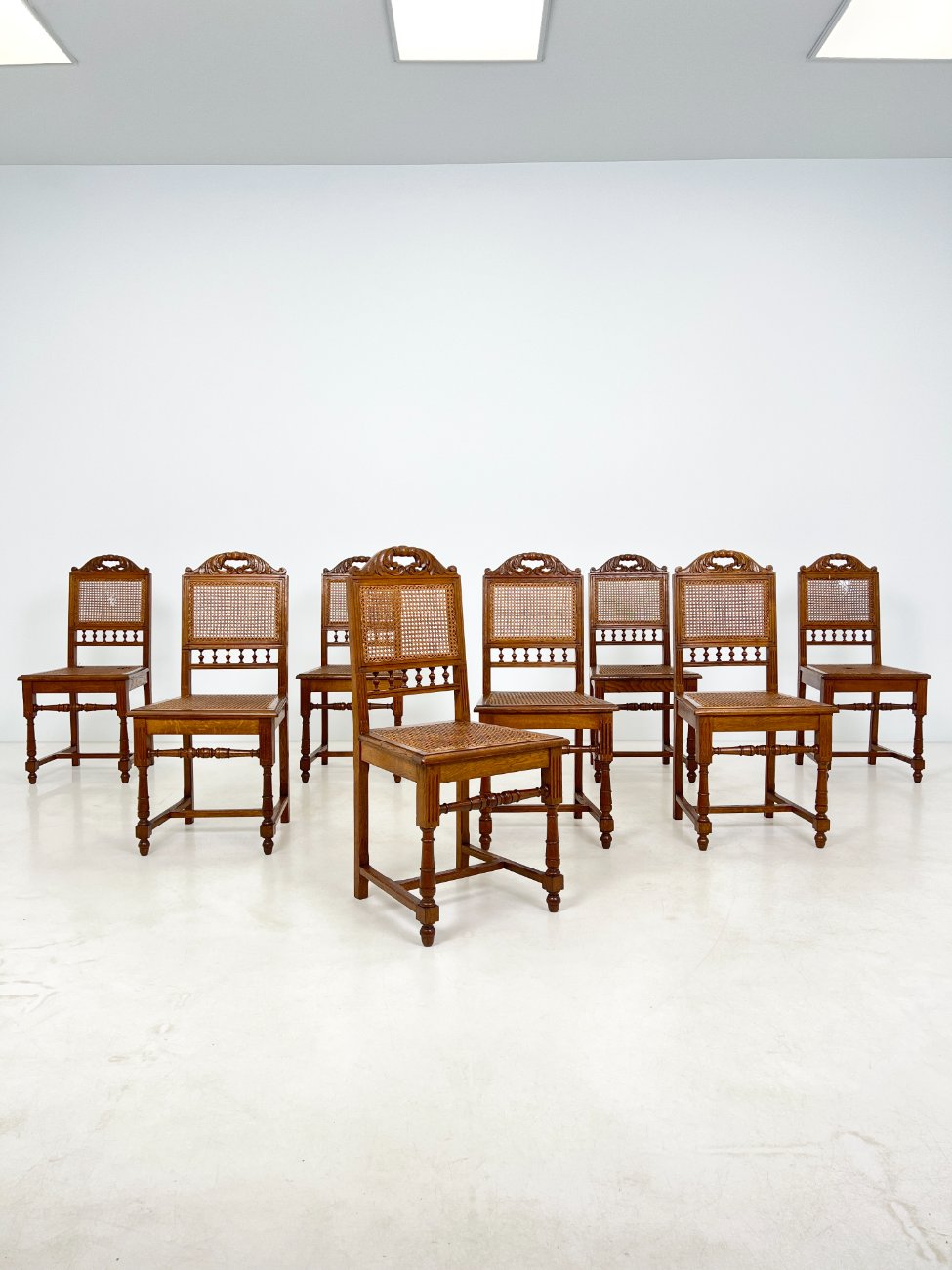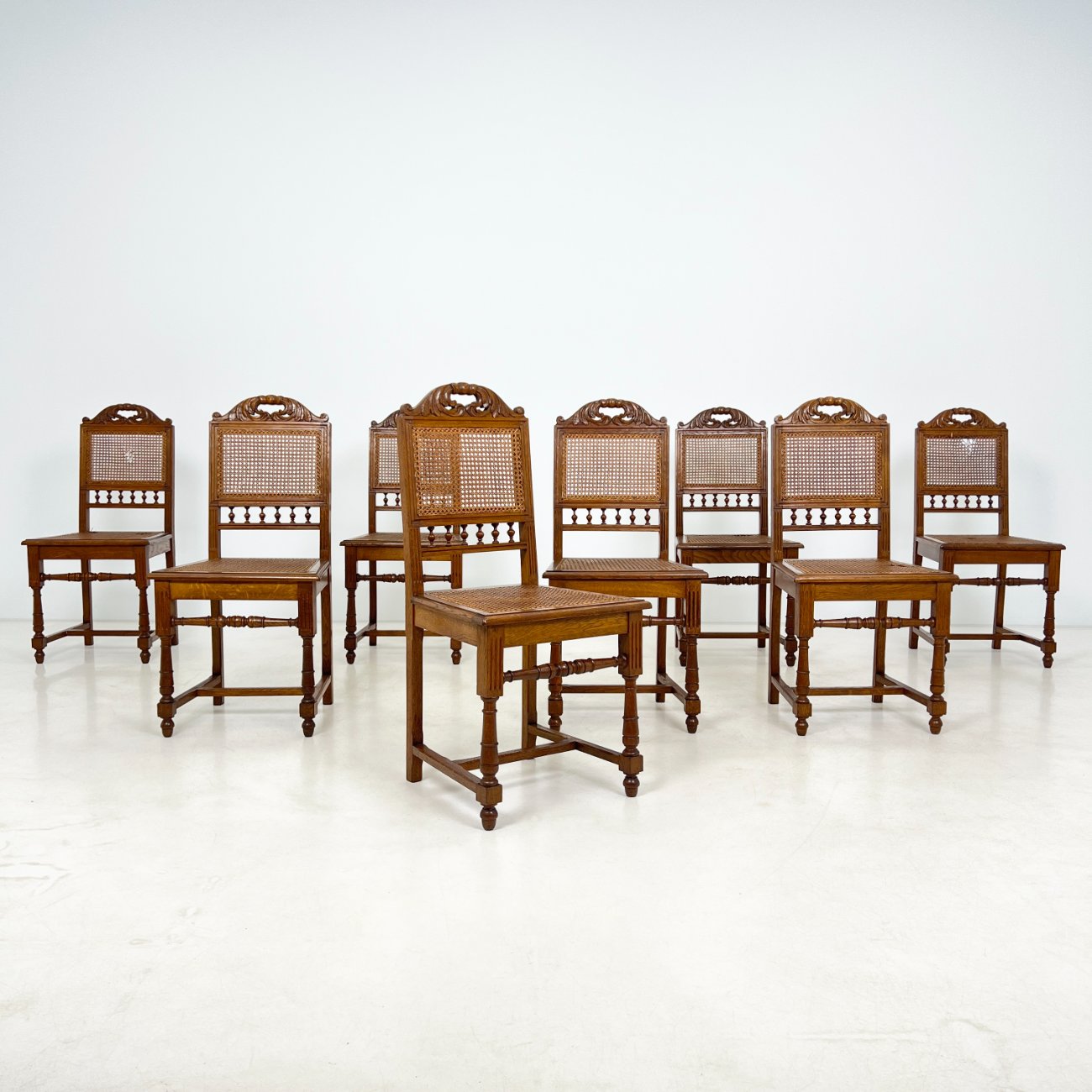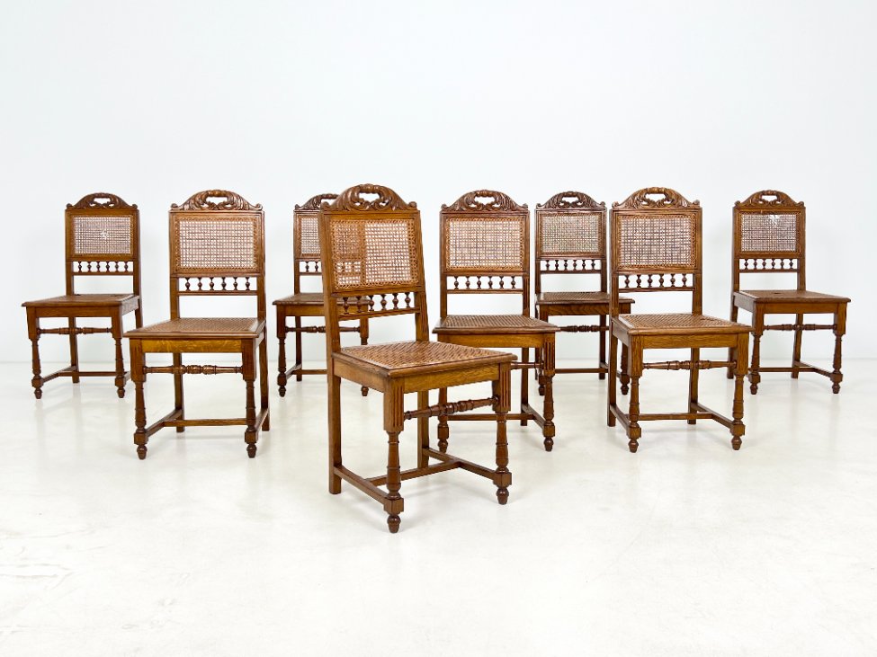 Ąžuolinės drožinėtos kėdės su ratanu 8 vnt. komplektas.