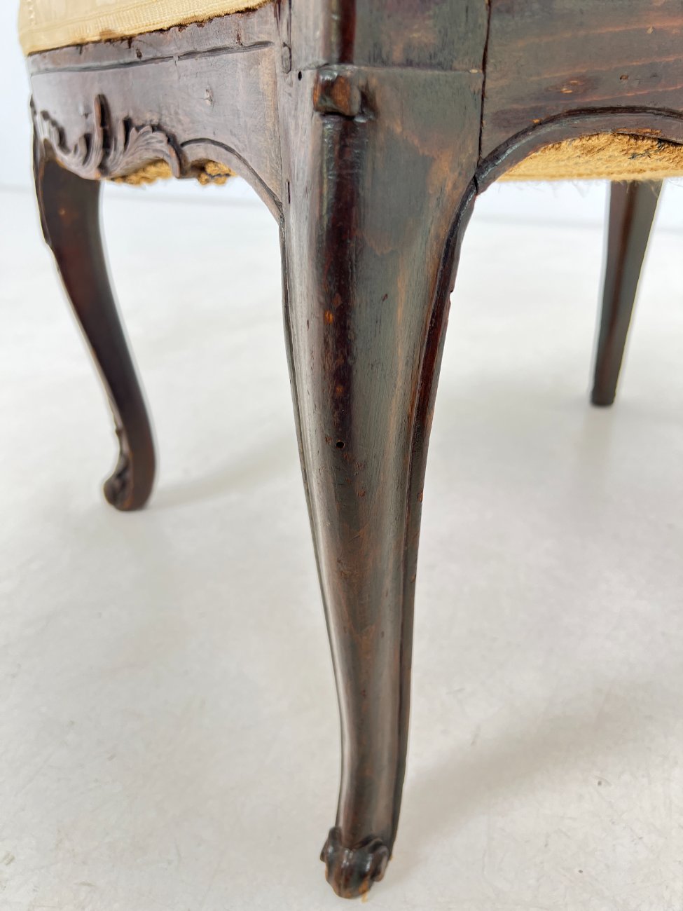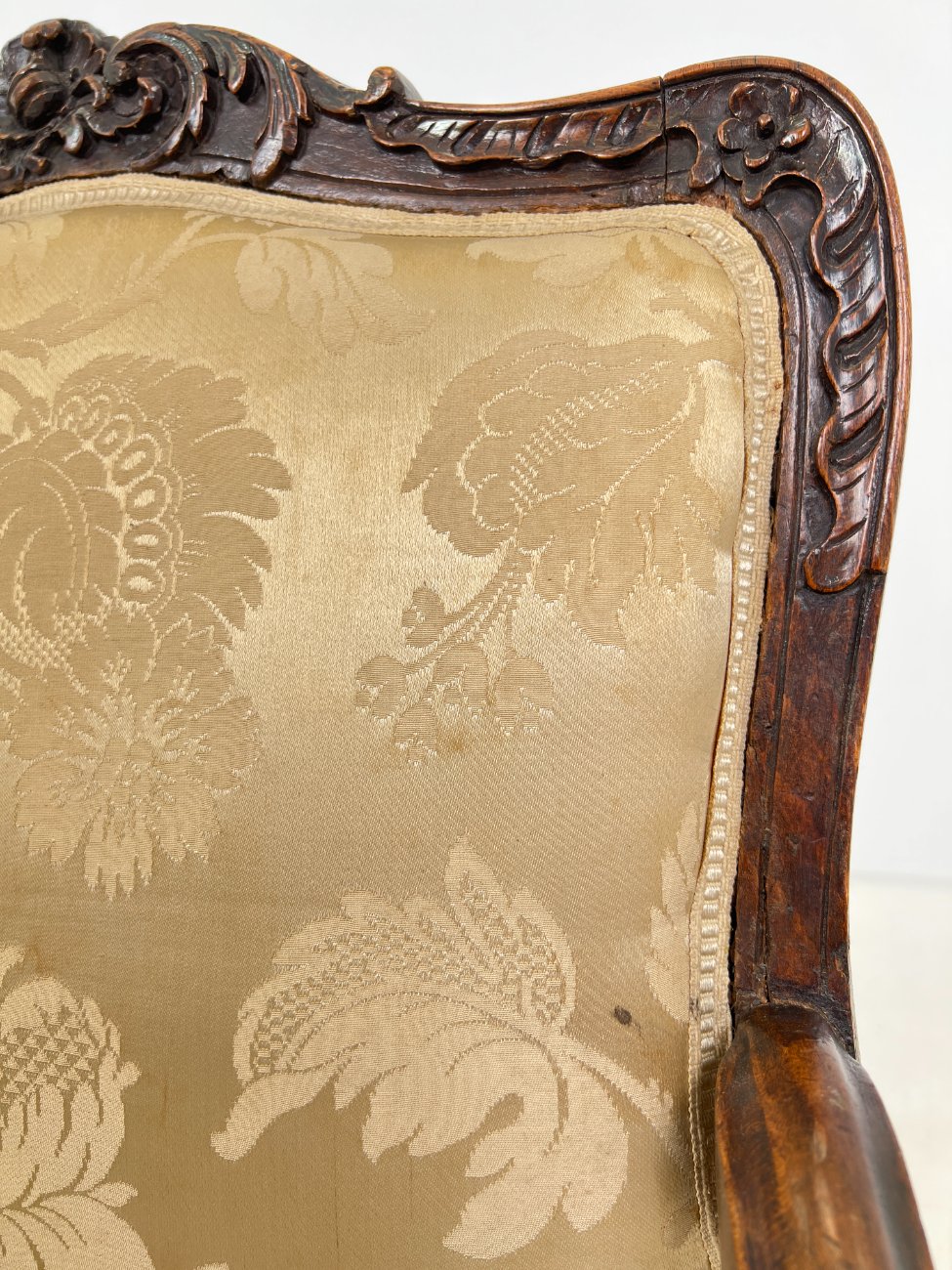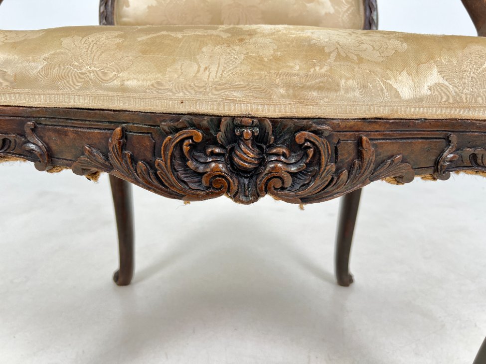 Barokinio stiliaus ąžuolinis krėslas su šviesiu gobelenu.