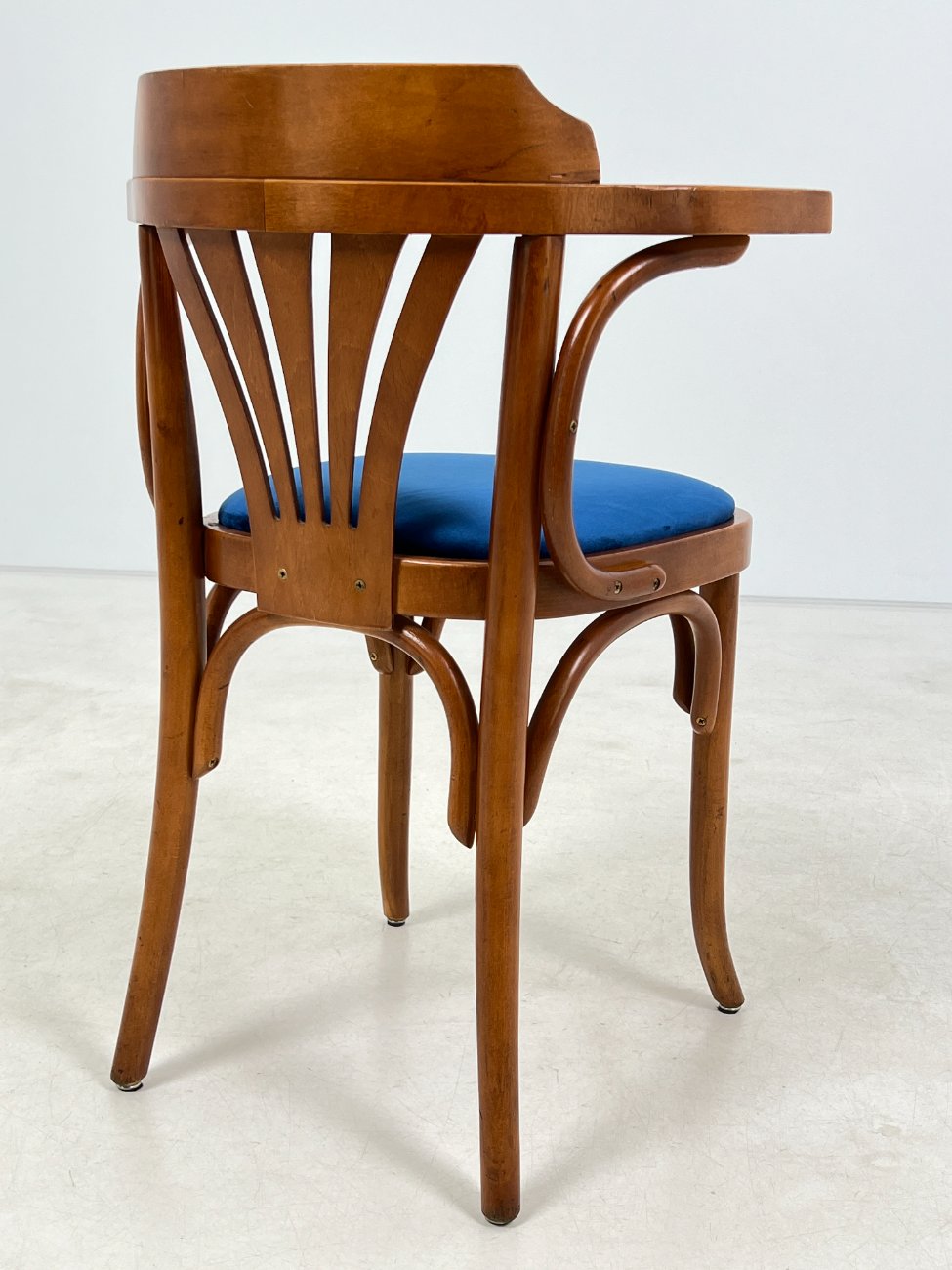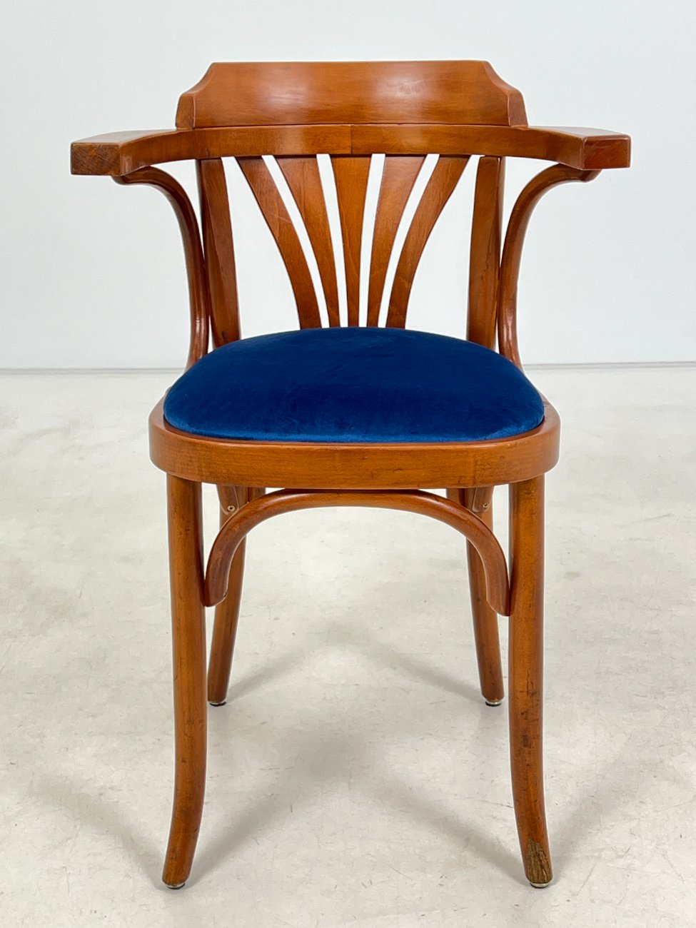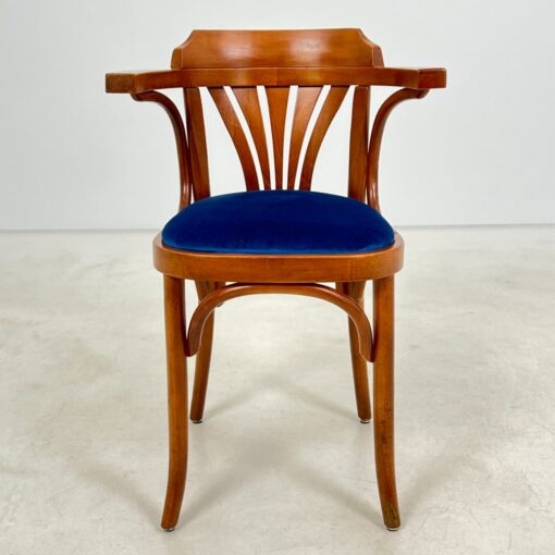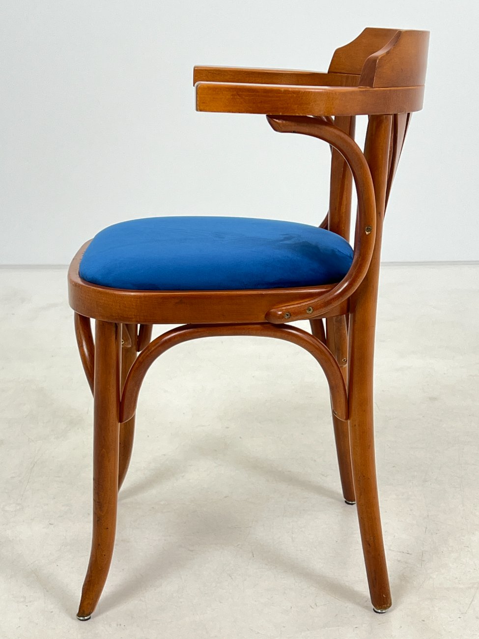 Medinis Thonet stiliaus krėslas mėlynos spalvos gobeleno sėdimąja dalimi.