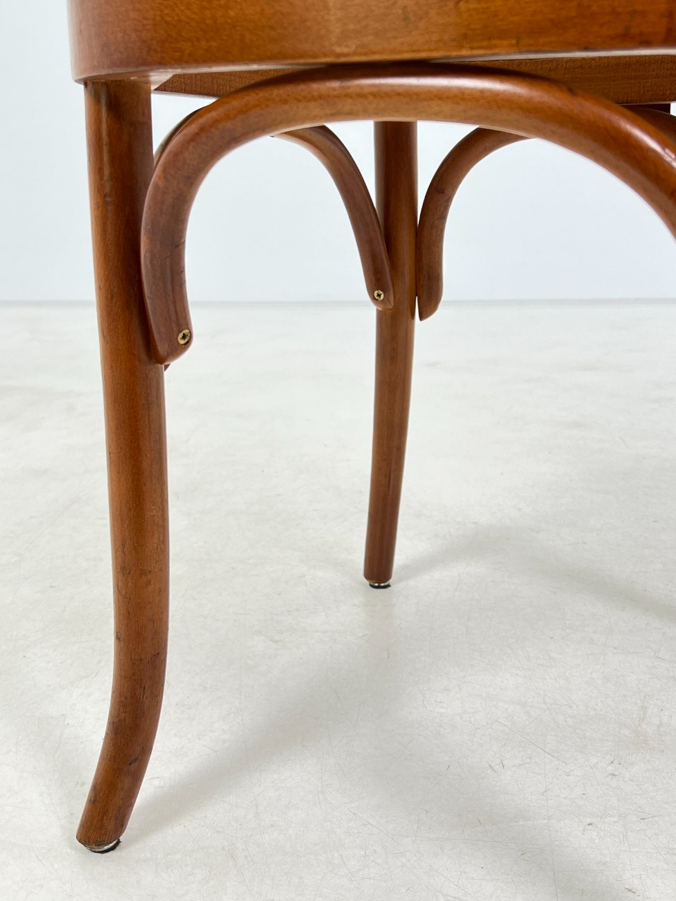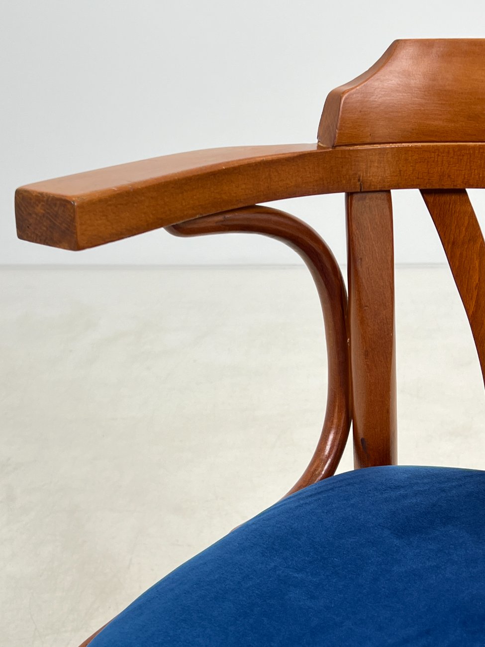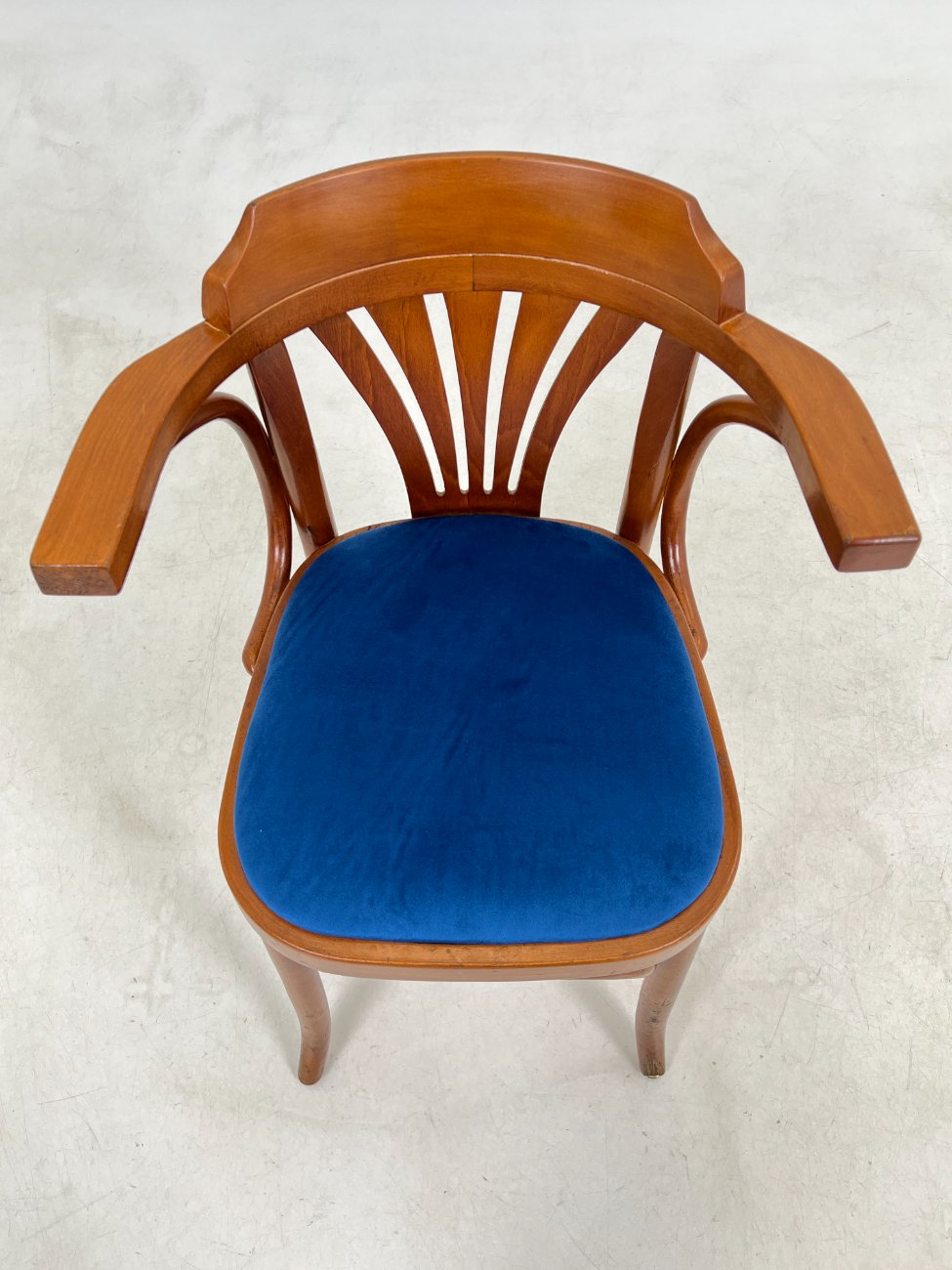 Medinis Thonet stiliaus krėslas mėlynos spalvos gobeleno sėdimąja dalimi.