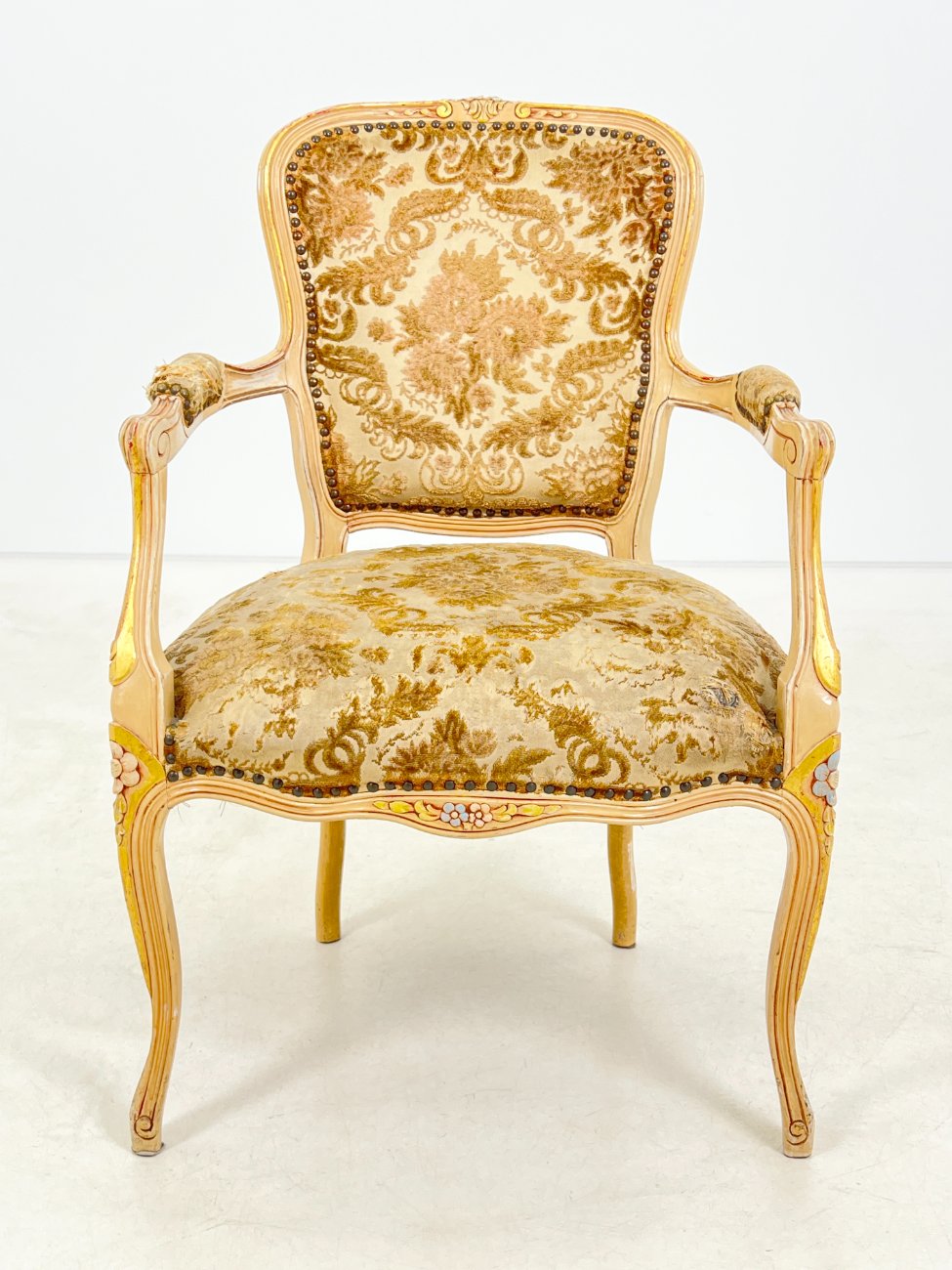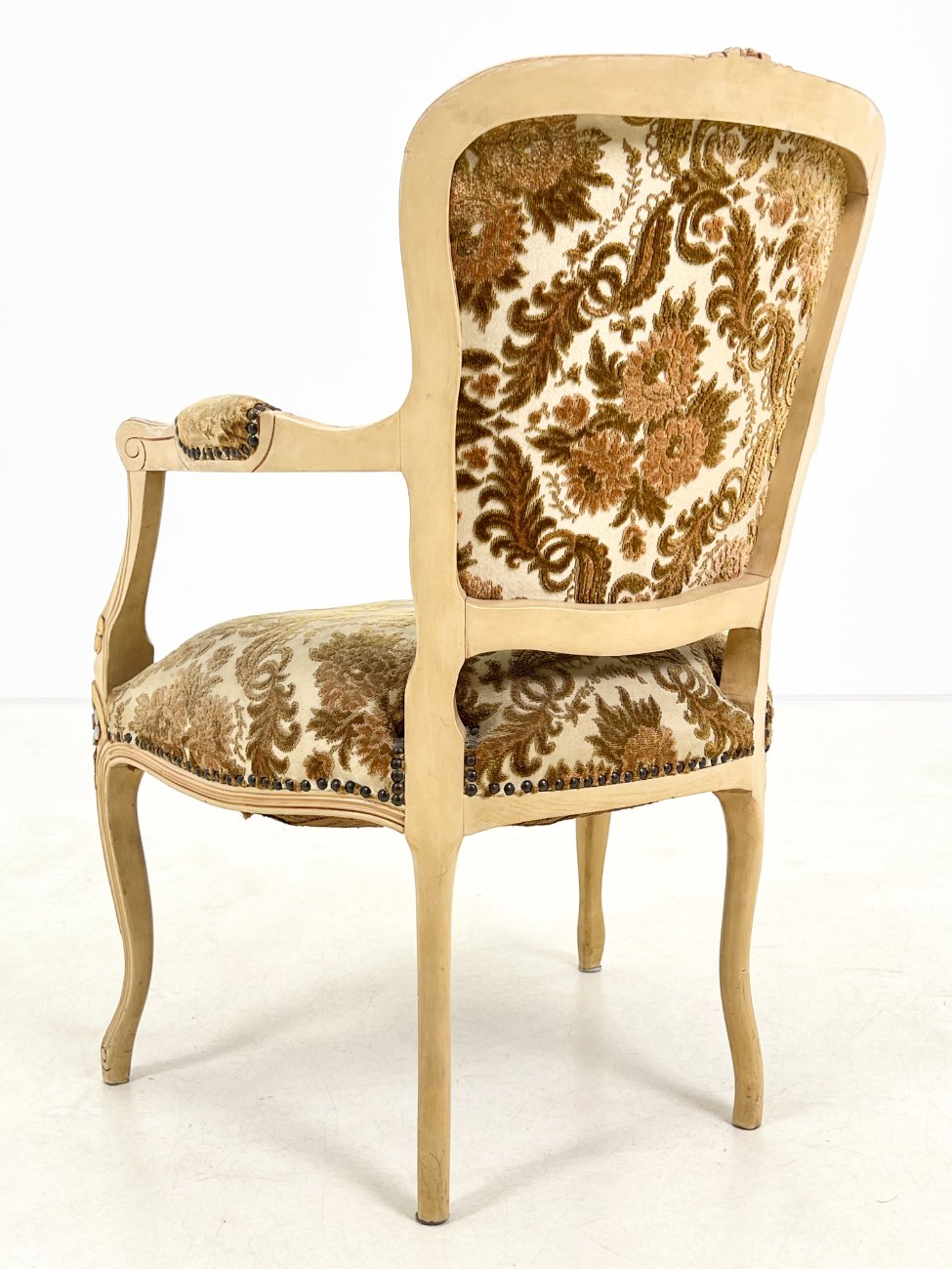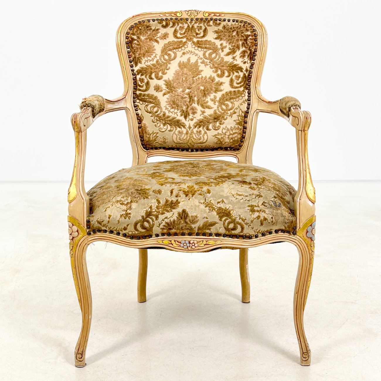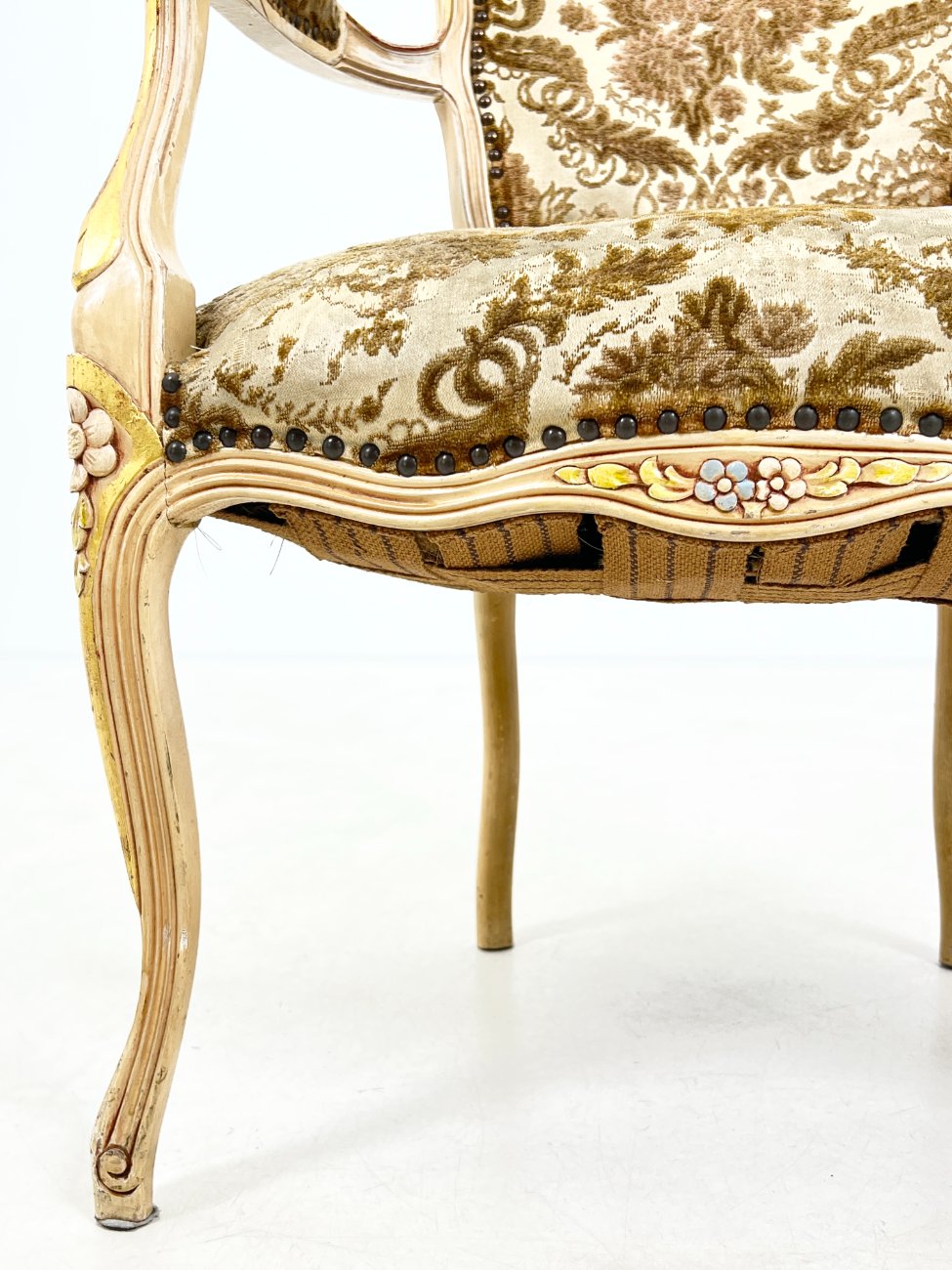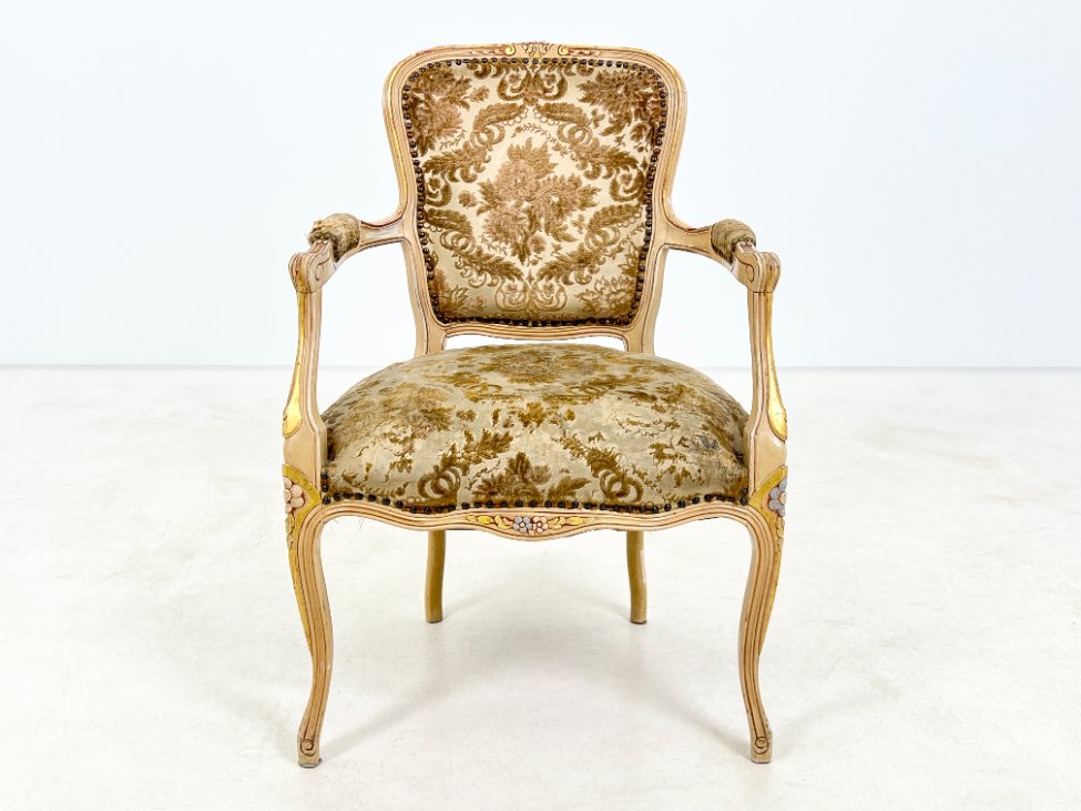 Provanso stiliaus medinis krėslas su augalų motyvų gobelenu.