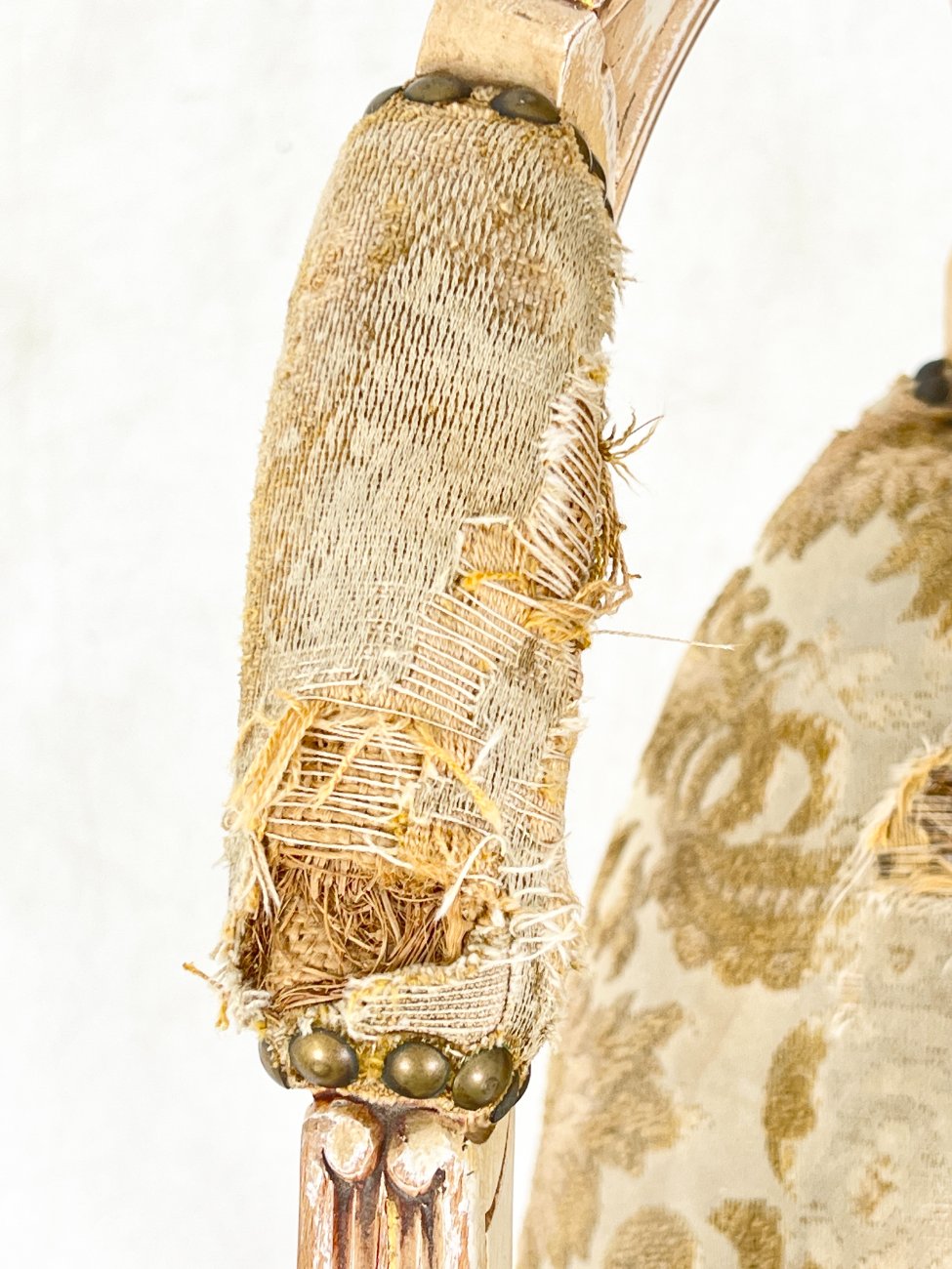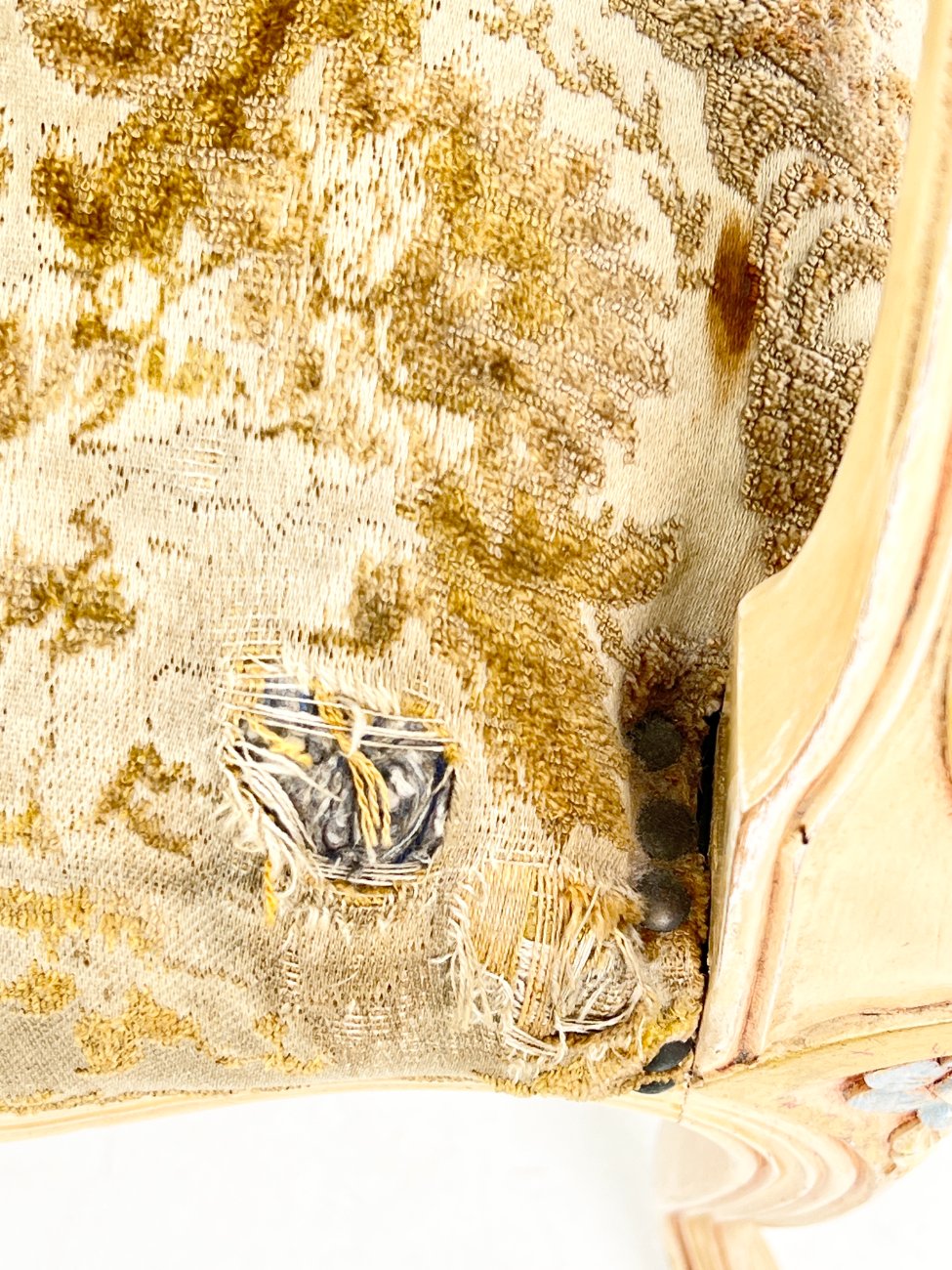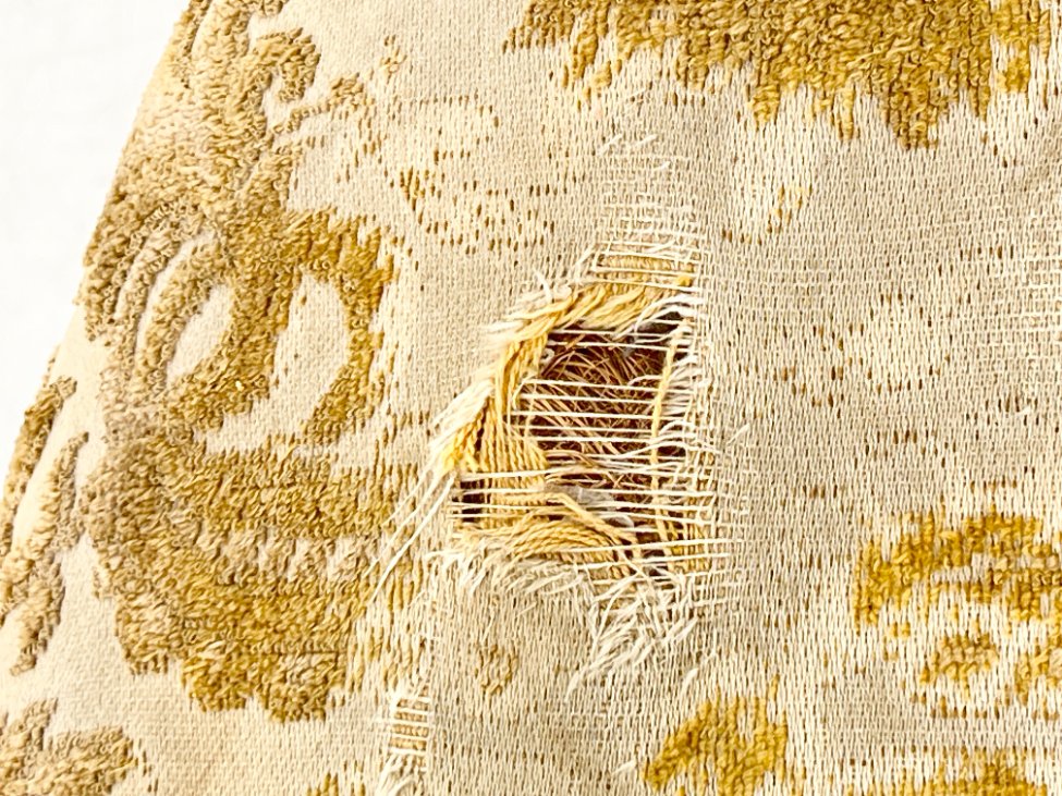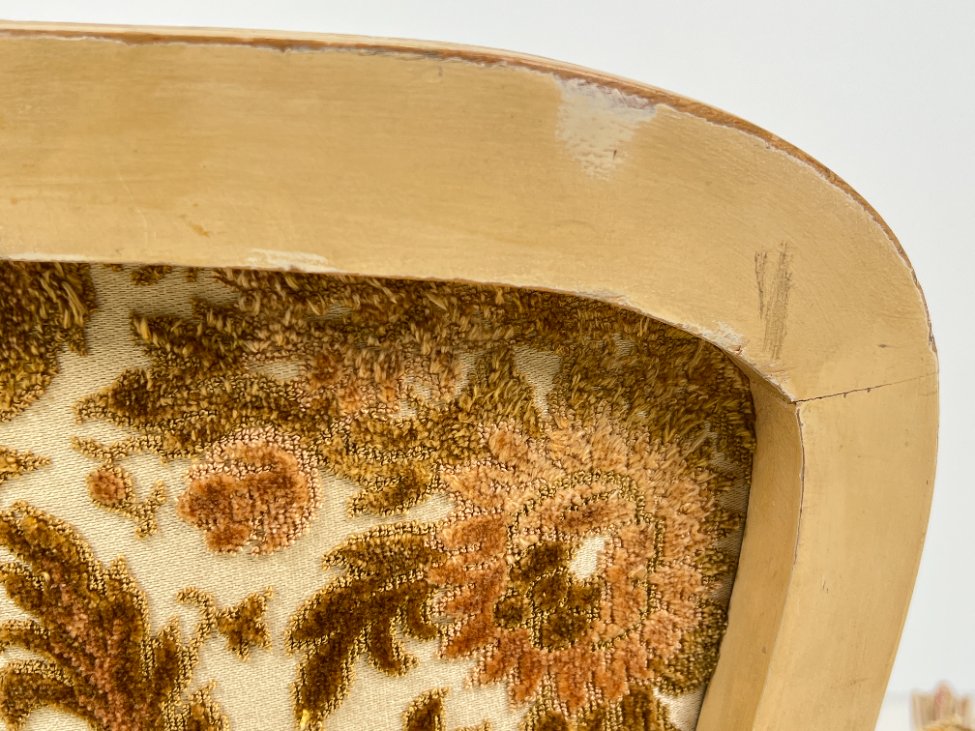 | Papildoma informacija | Sėdimosios dalies aukštis 45 cm. Sėdimojoje dalyje ir porankiuose gobelenas išsidėvėjęs ir suplyšęs. Ant rėmo ir kojų yra pabraižymų. |