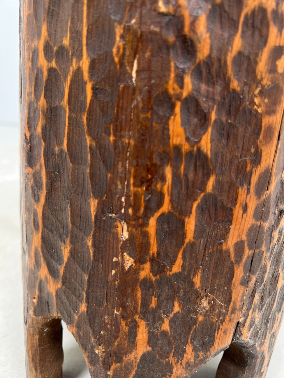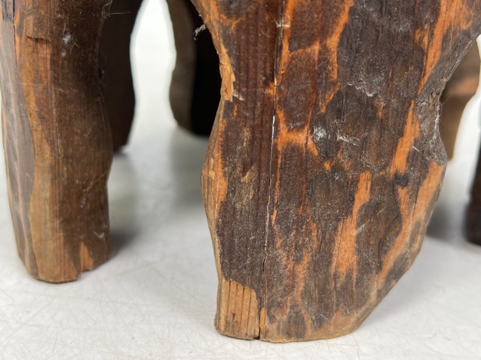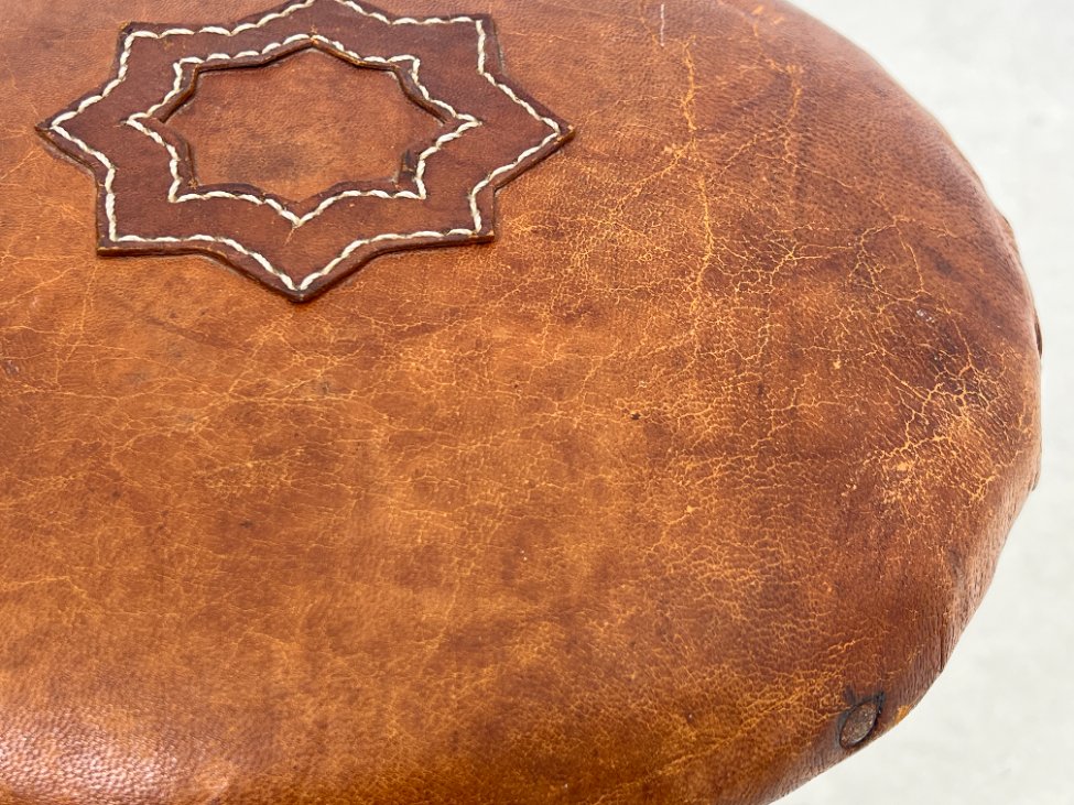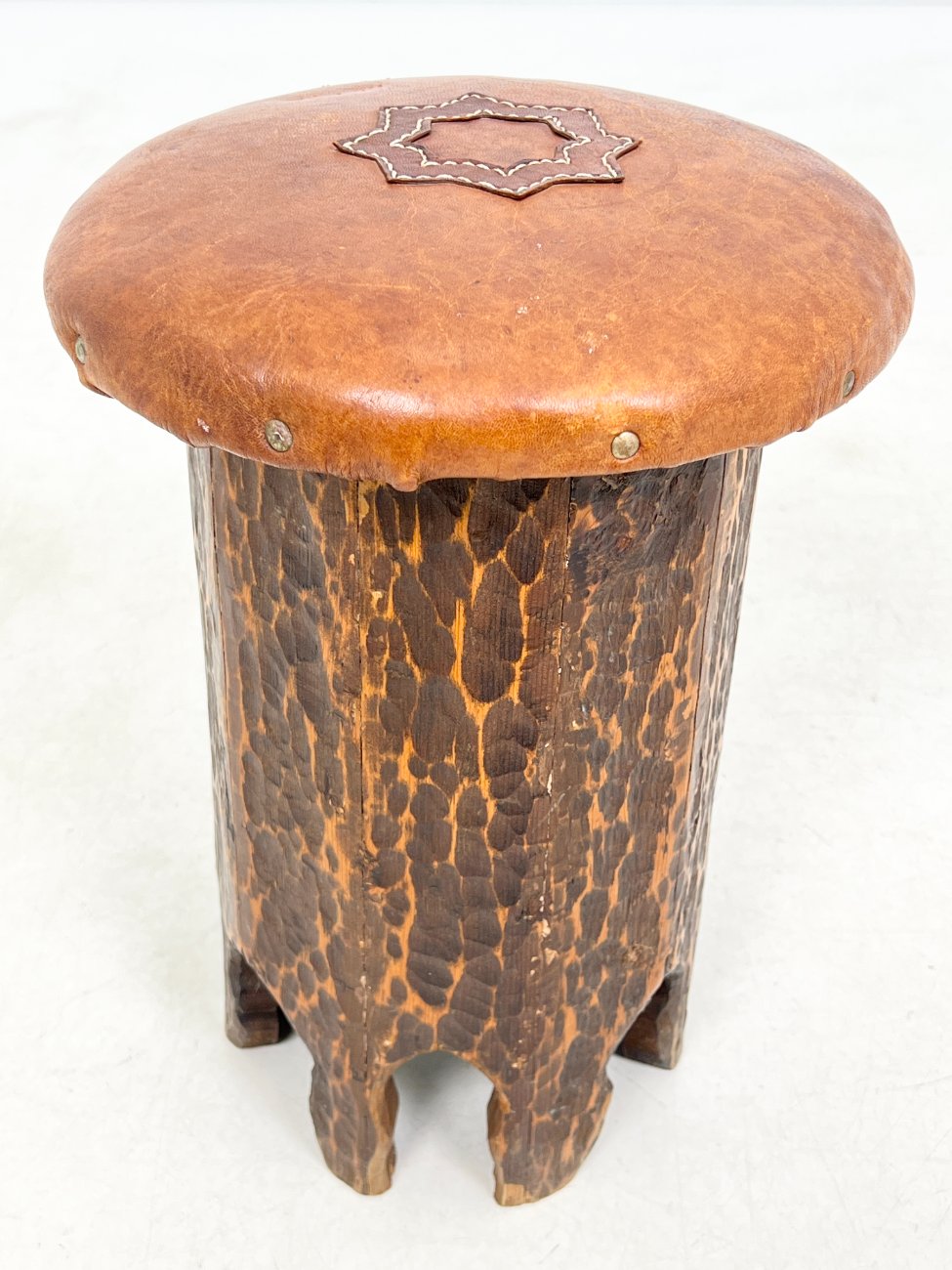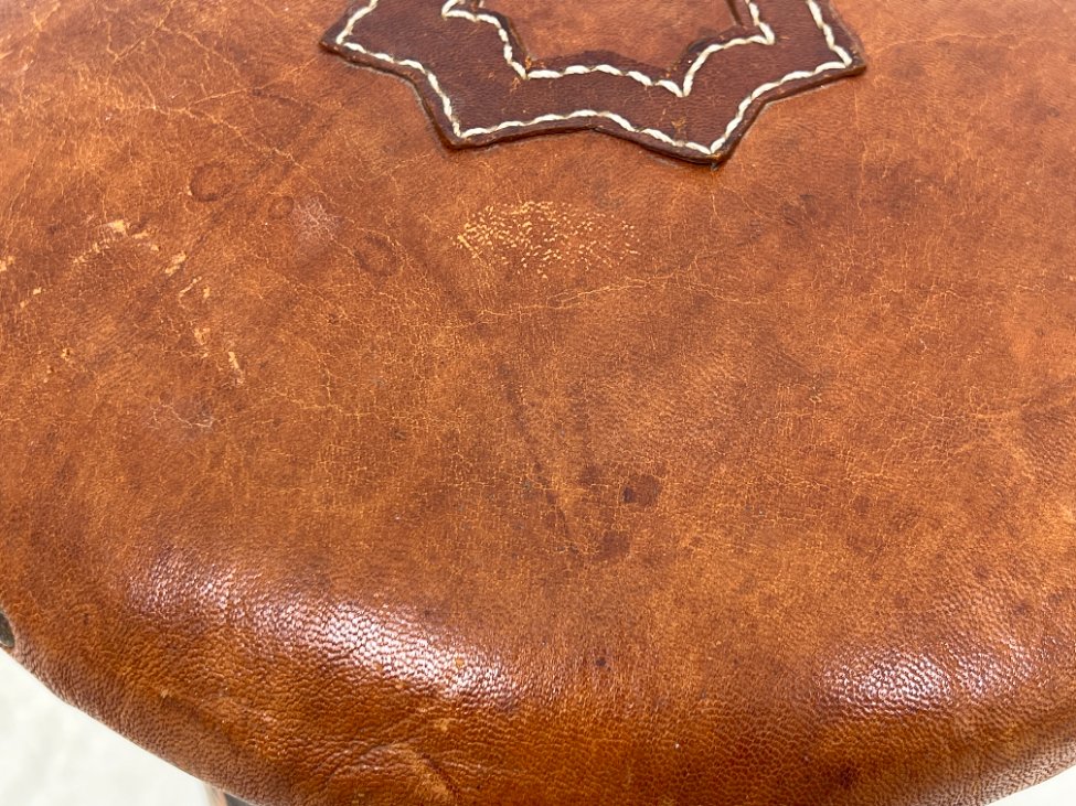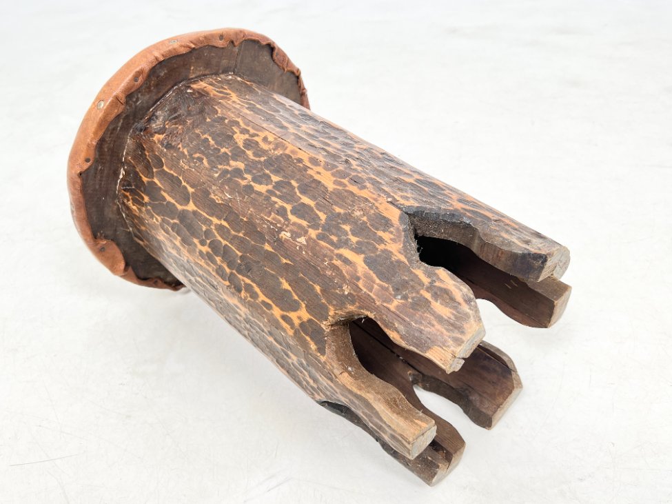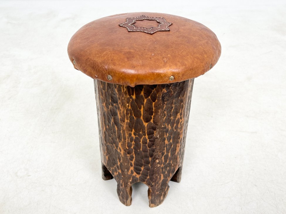 Pušies medžio taburetė su odine sėdimąja dalimi.