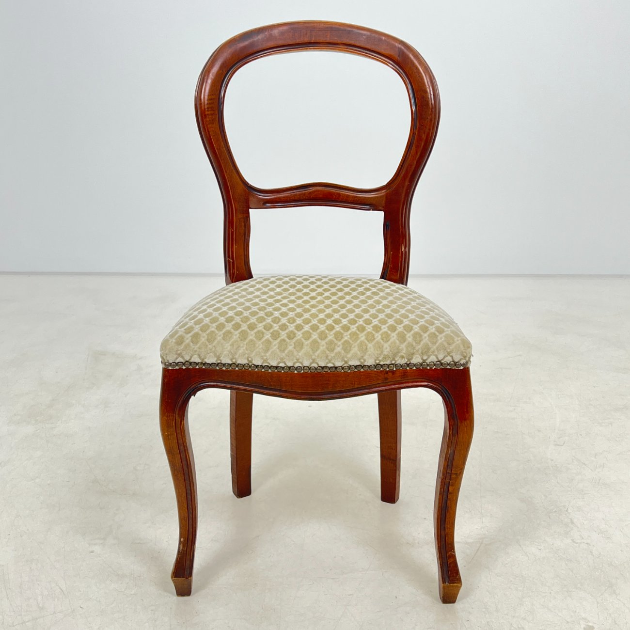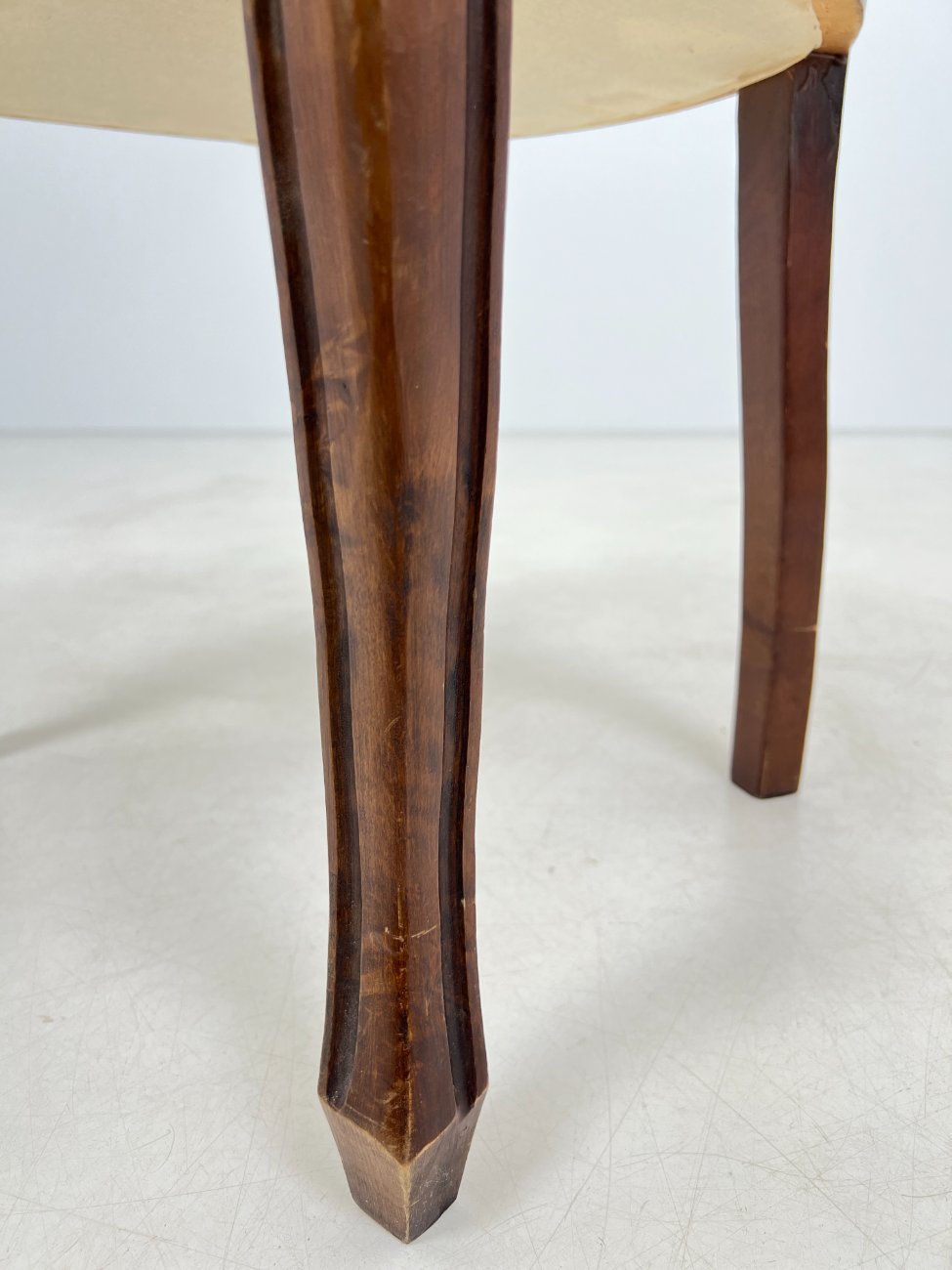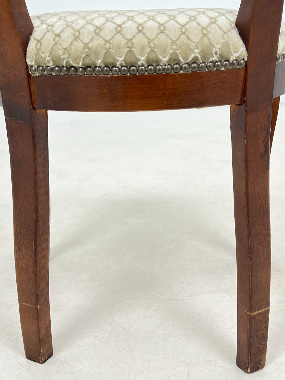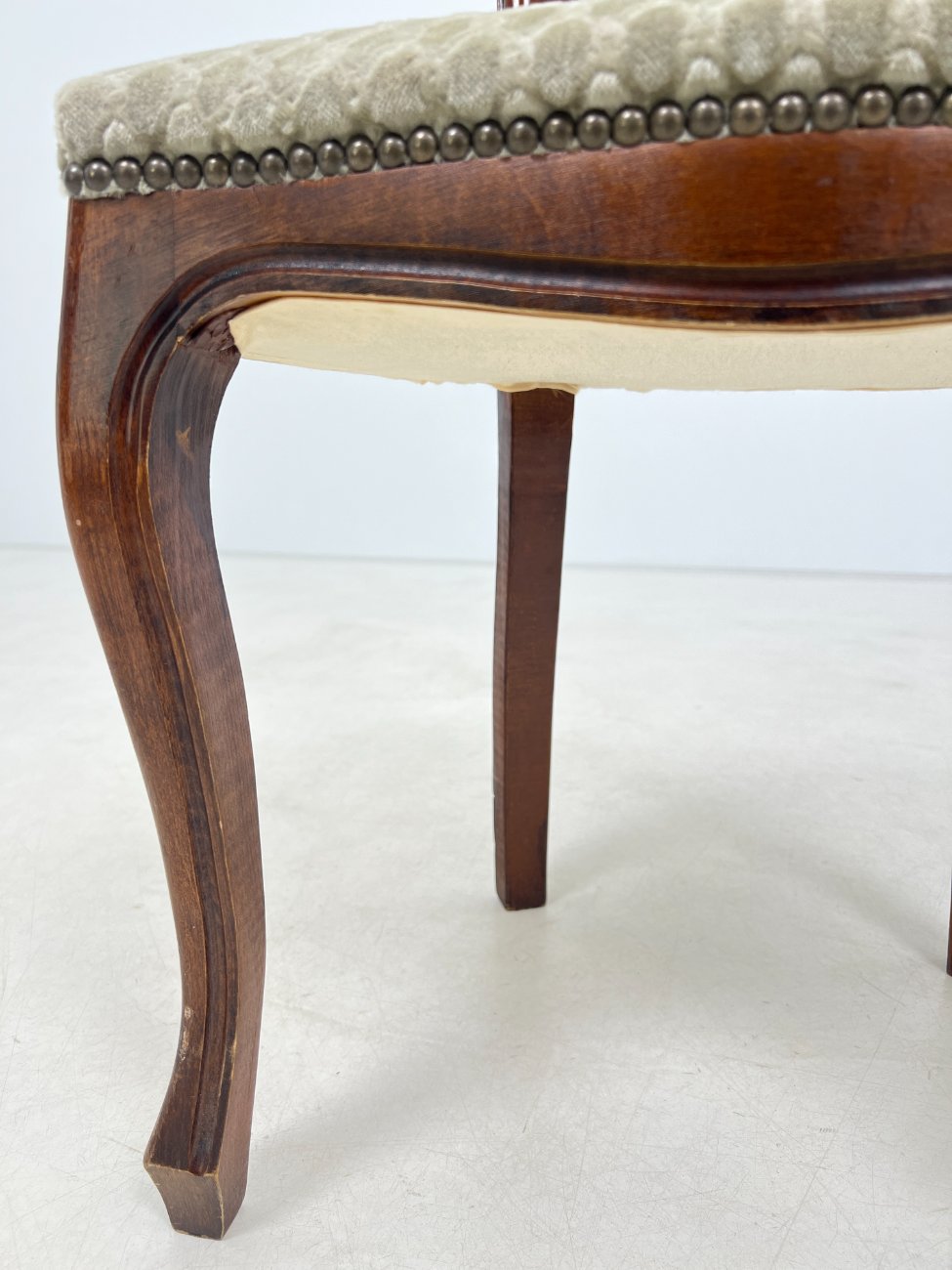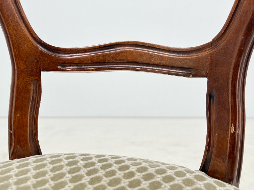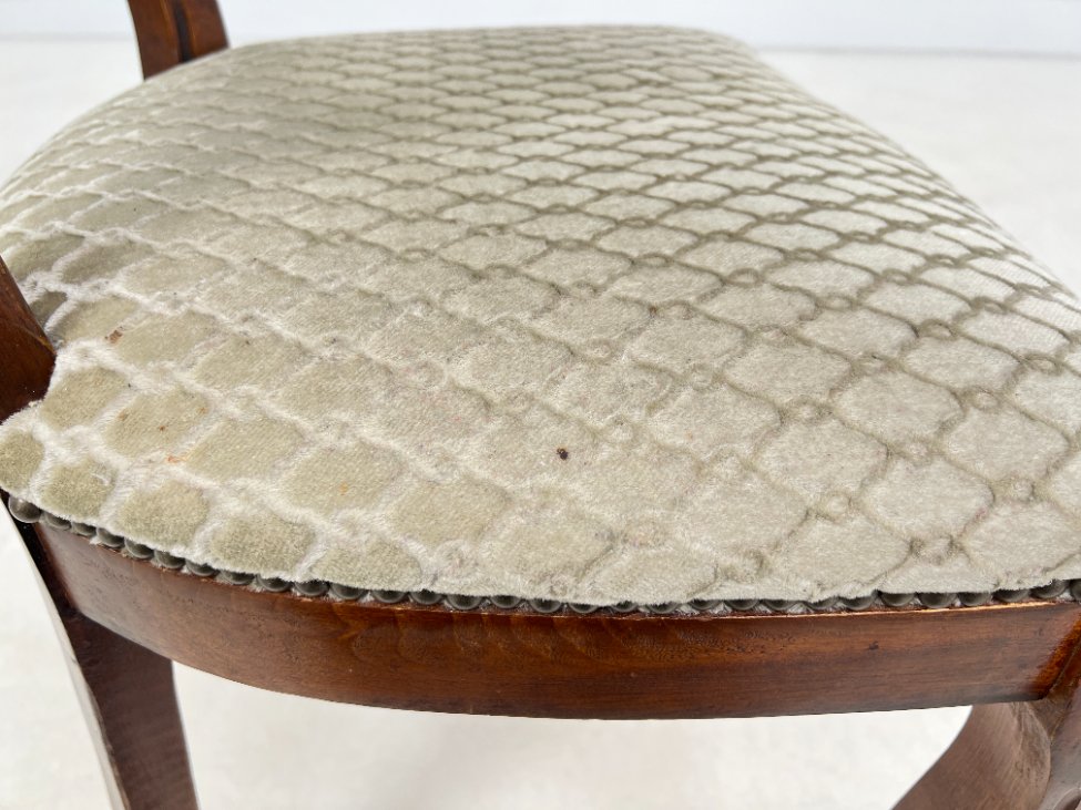 | Papildoma informacija | Sėdimosios dalies aukštis 48 cm. Ant gobeleno yra dėmelių. Vietomis nežymiai pabraižytas rėmas. Vertikaliai įskilusi galinės dešinės kojos apačia |