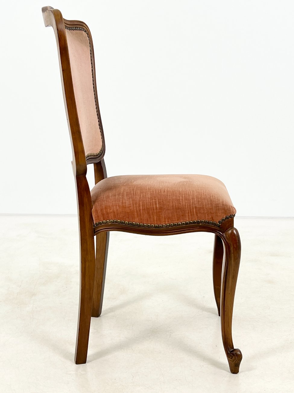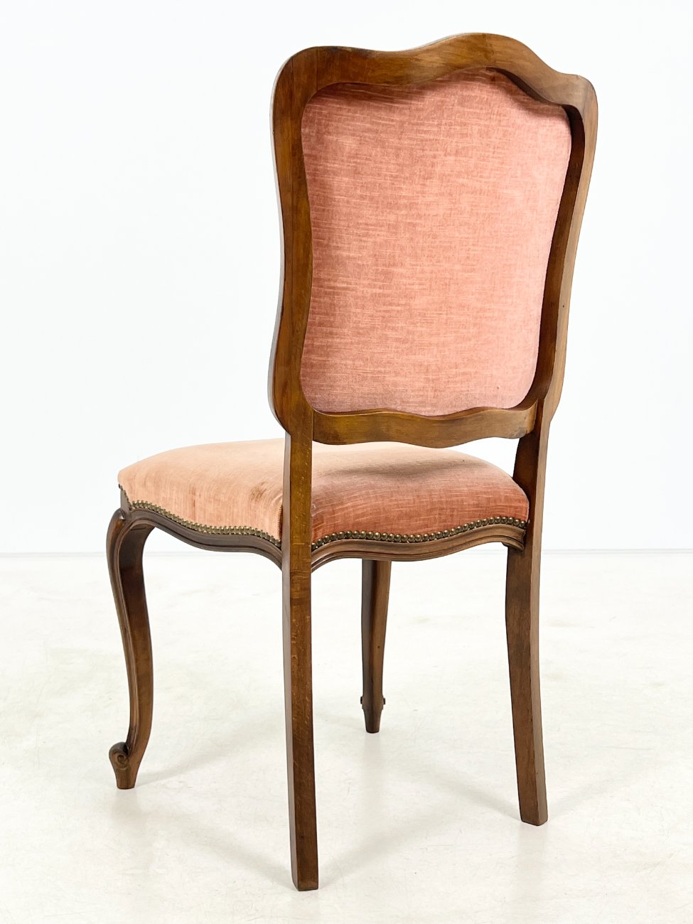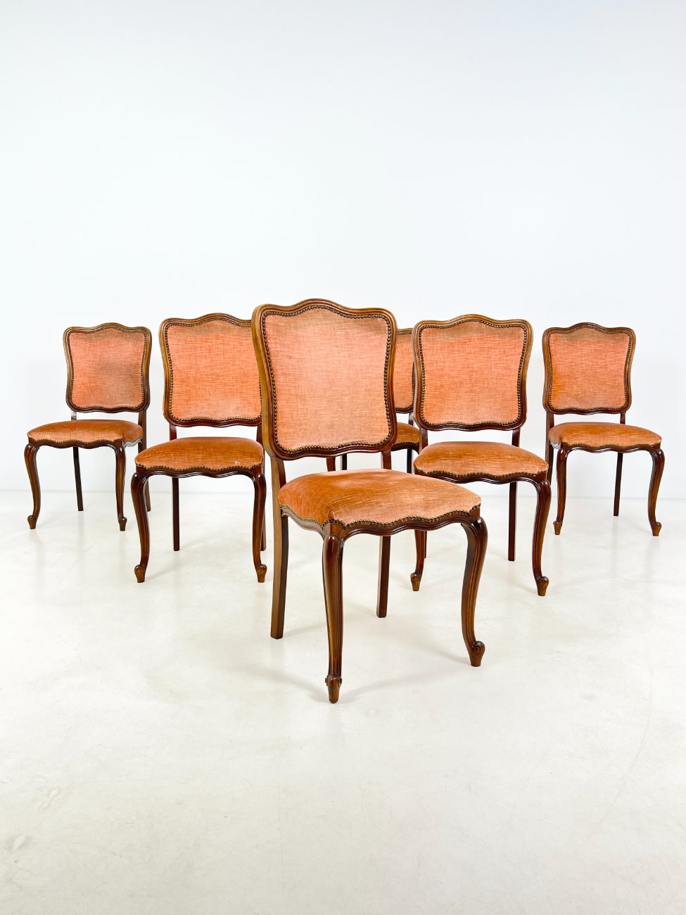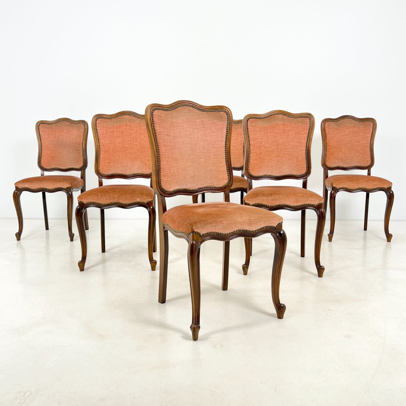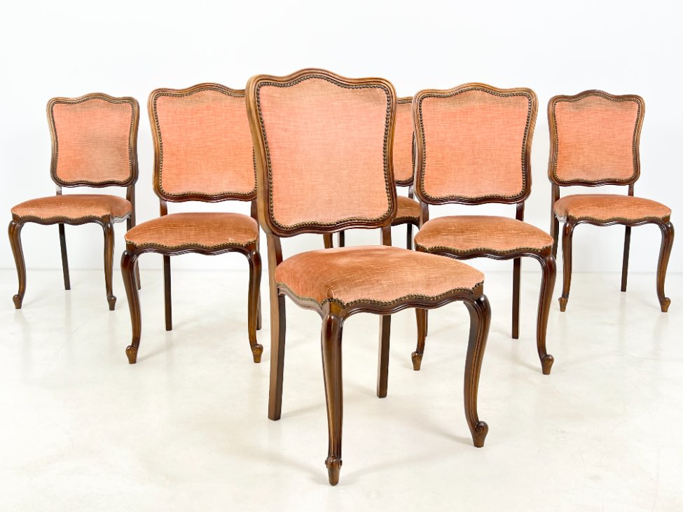 Riešutmedžio kėdės su rausvos spalvos gobelenu 6 vnt. komplektas.