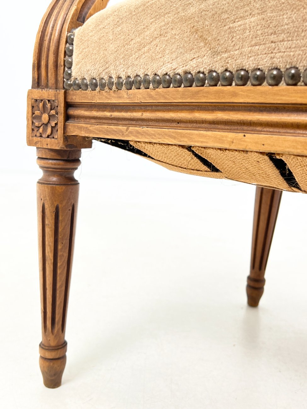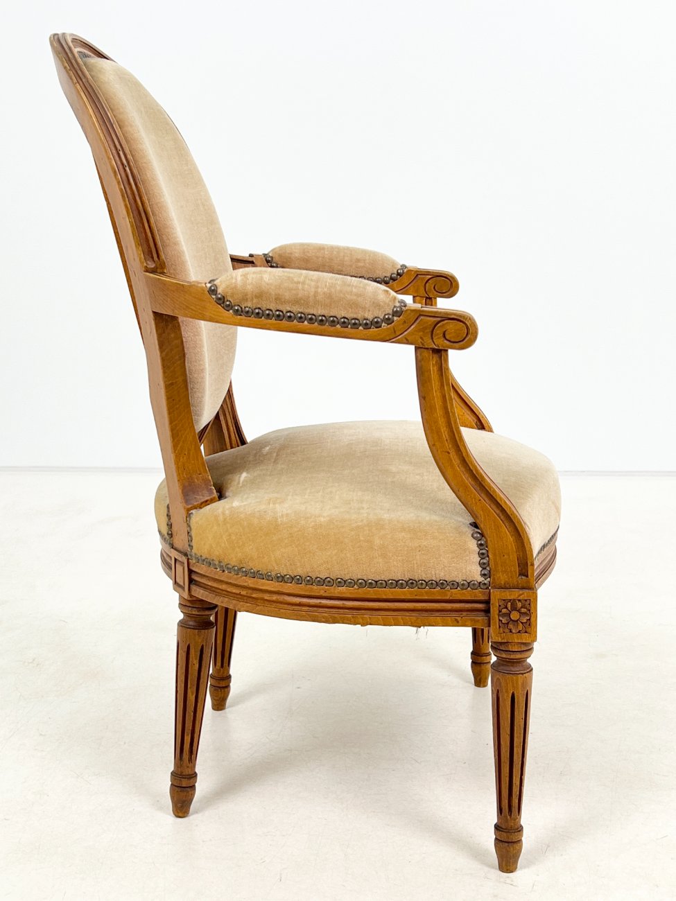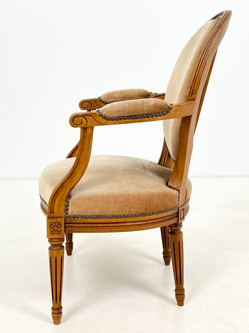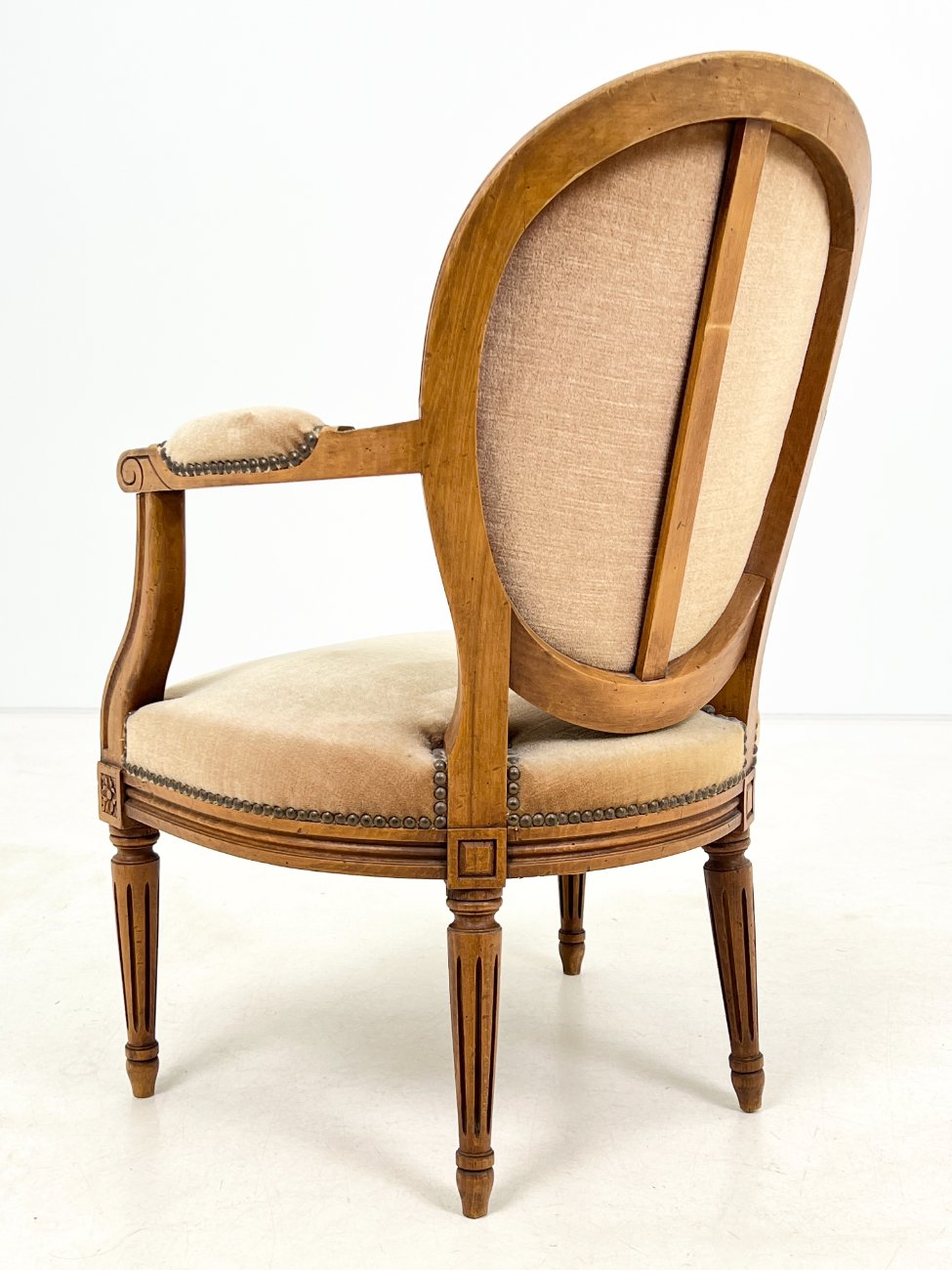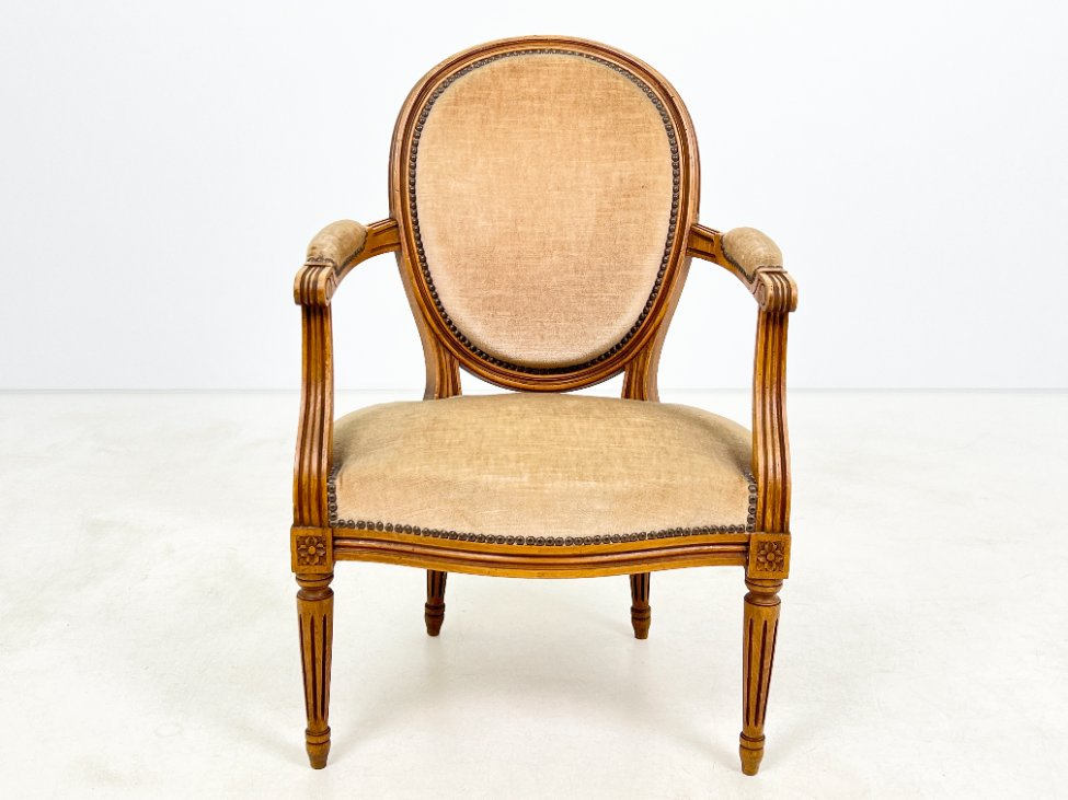 Riešutmedžio krėslas su šviesiai rudos spalvos gobelenu.