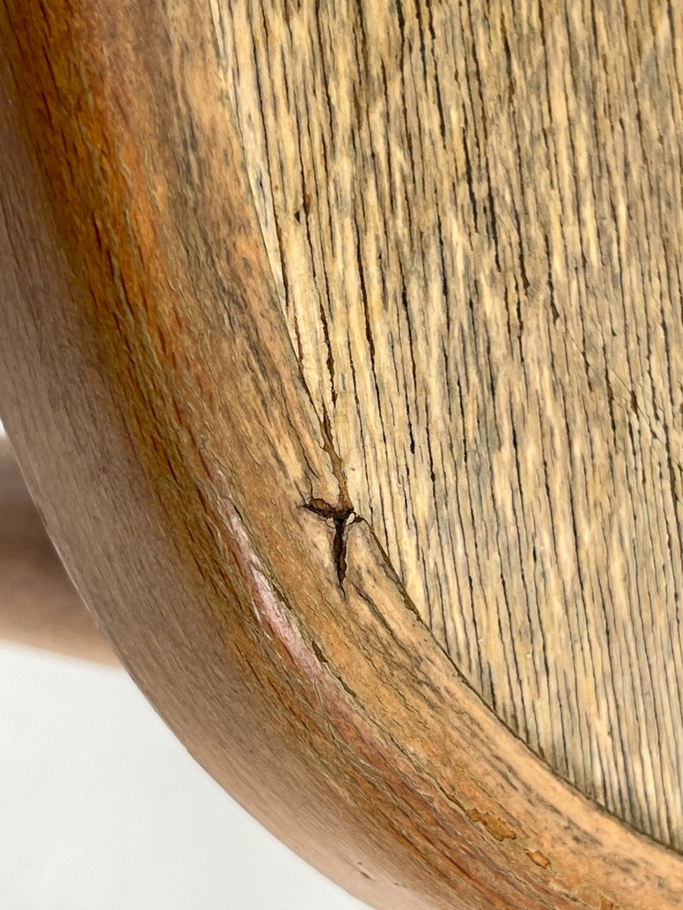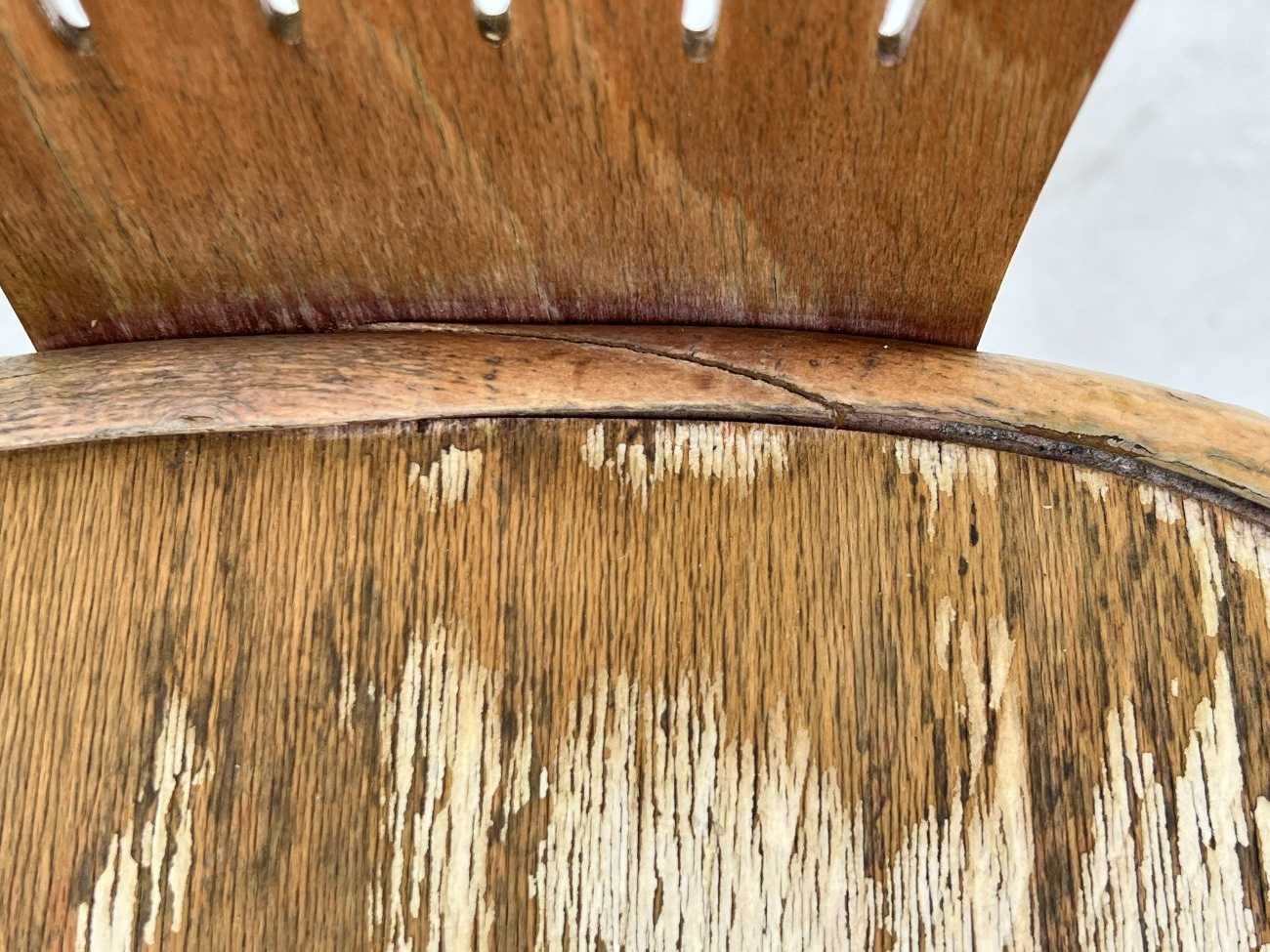 | Papildoma informacija | Matomos naudojimo žymės, per visą paviršių yra pabraižymų ir įmušimų, vietomis yra spalvos pakitimų ir viršutinio lako sluoksnio pasidėvėjimų. Vienoje vietoje įskilęs sėdimosios dalies rėmas., Sėdimosios dalies aukštis 46 cm. |
