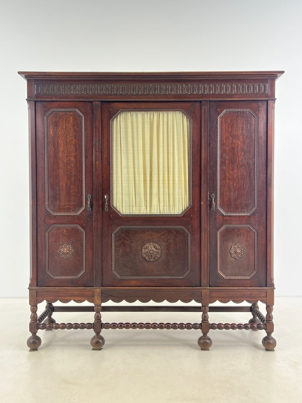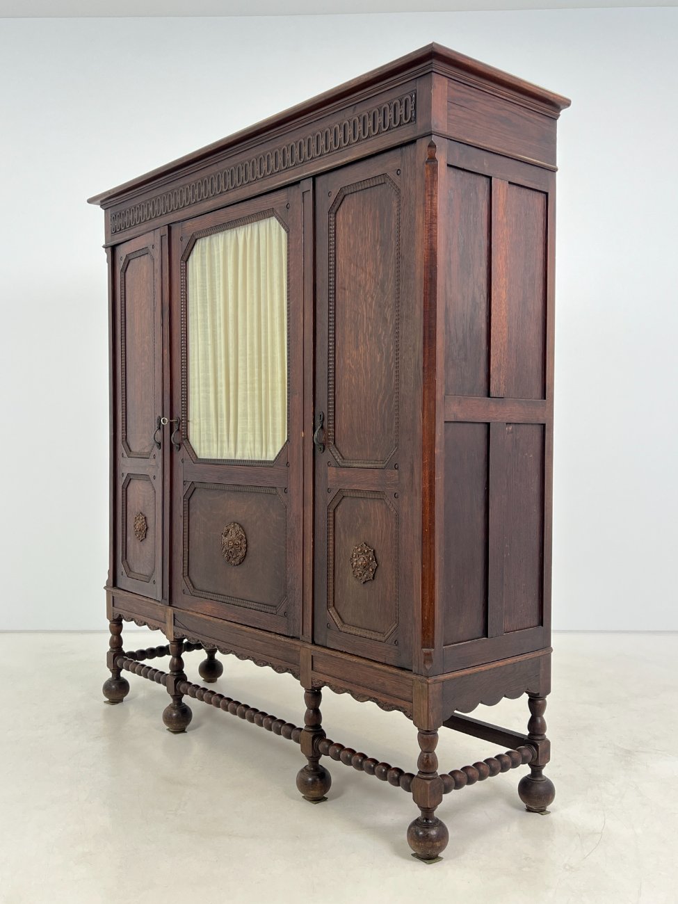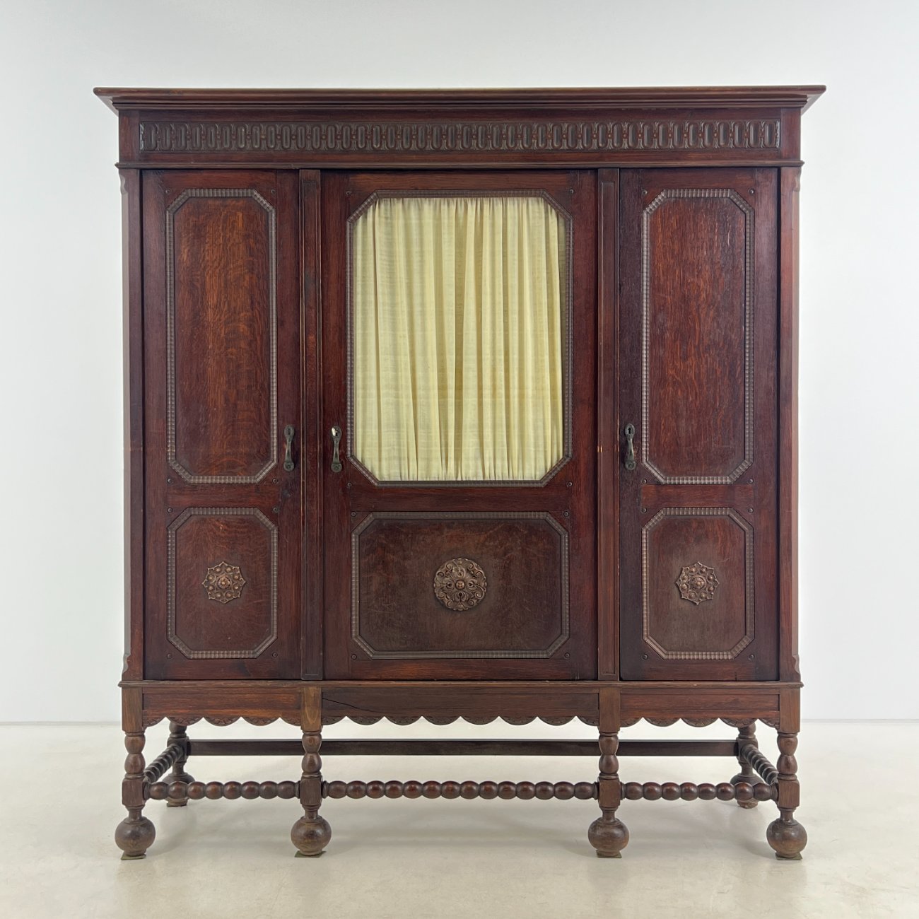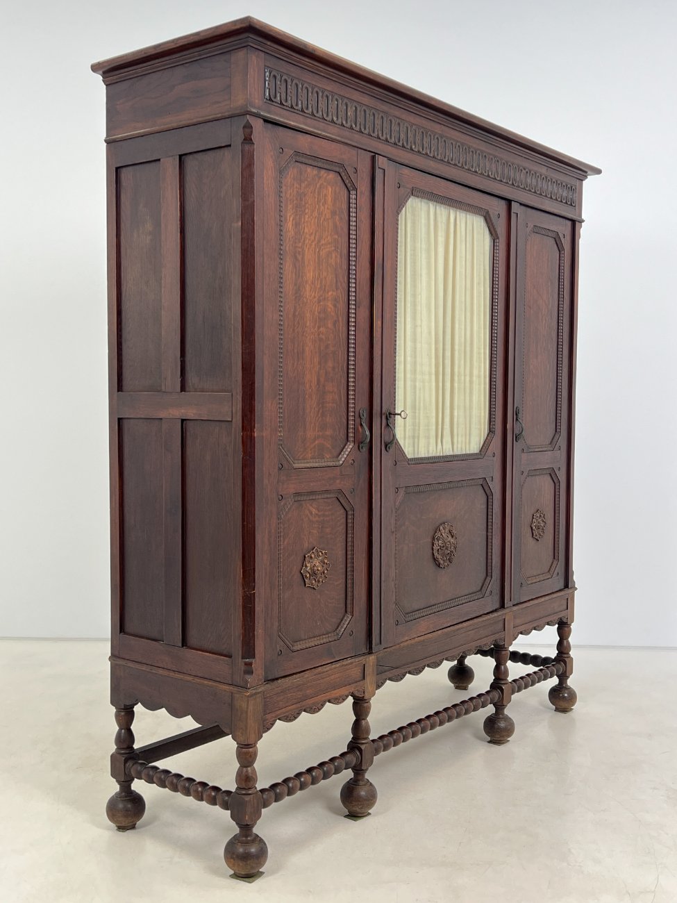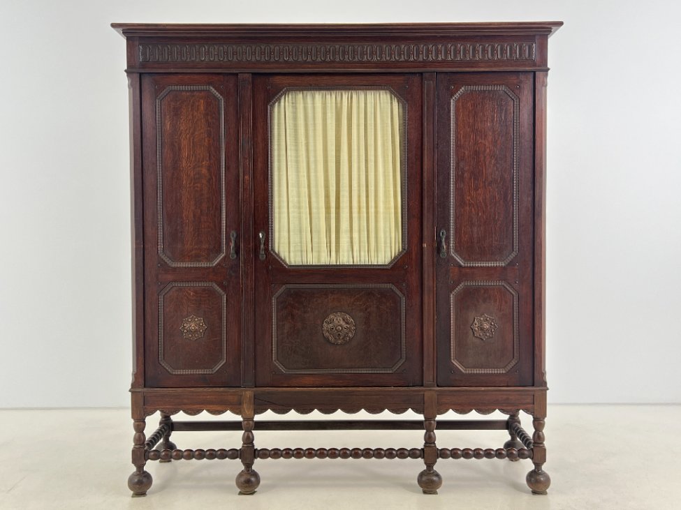 Ąžuolinė drožinėta trijų durų knygų spinta.