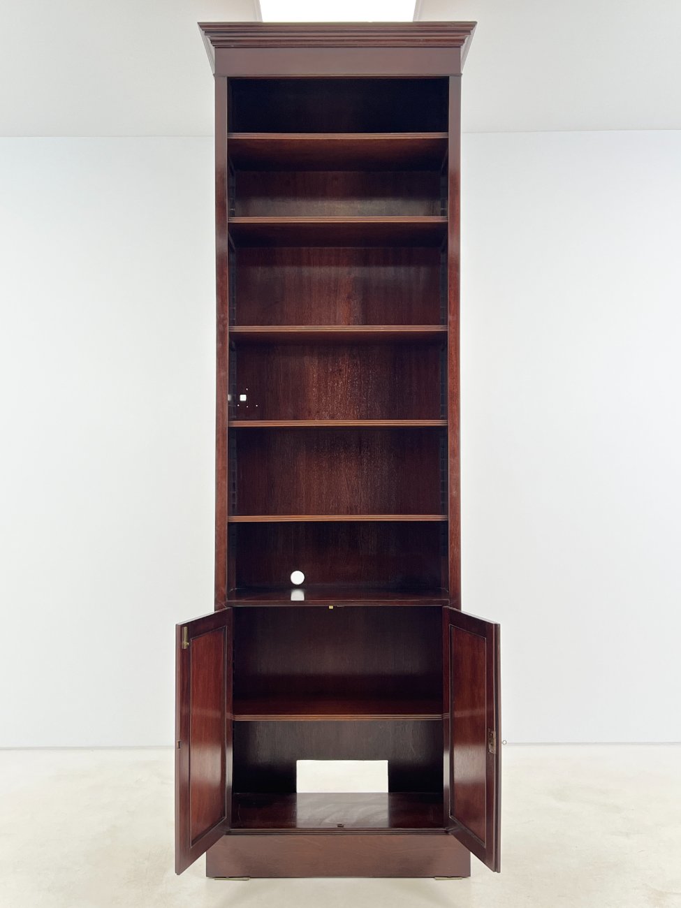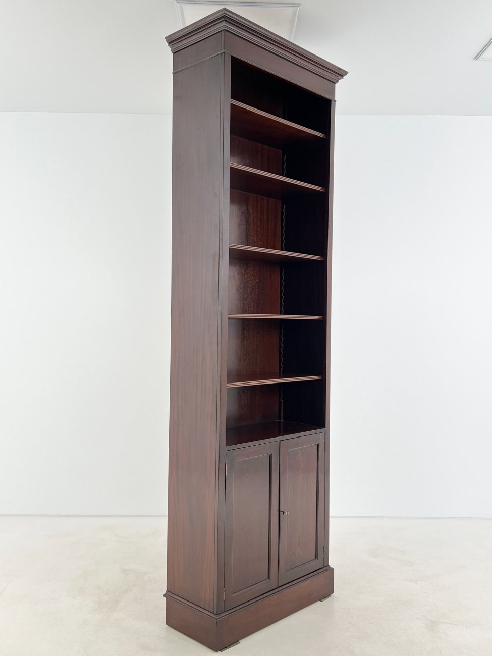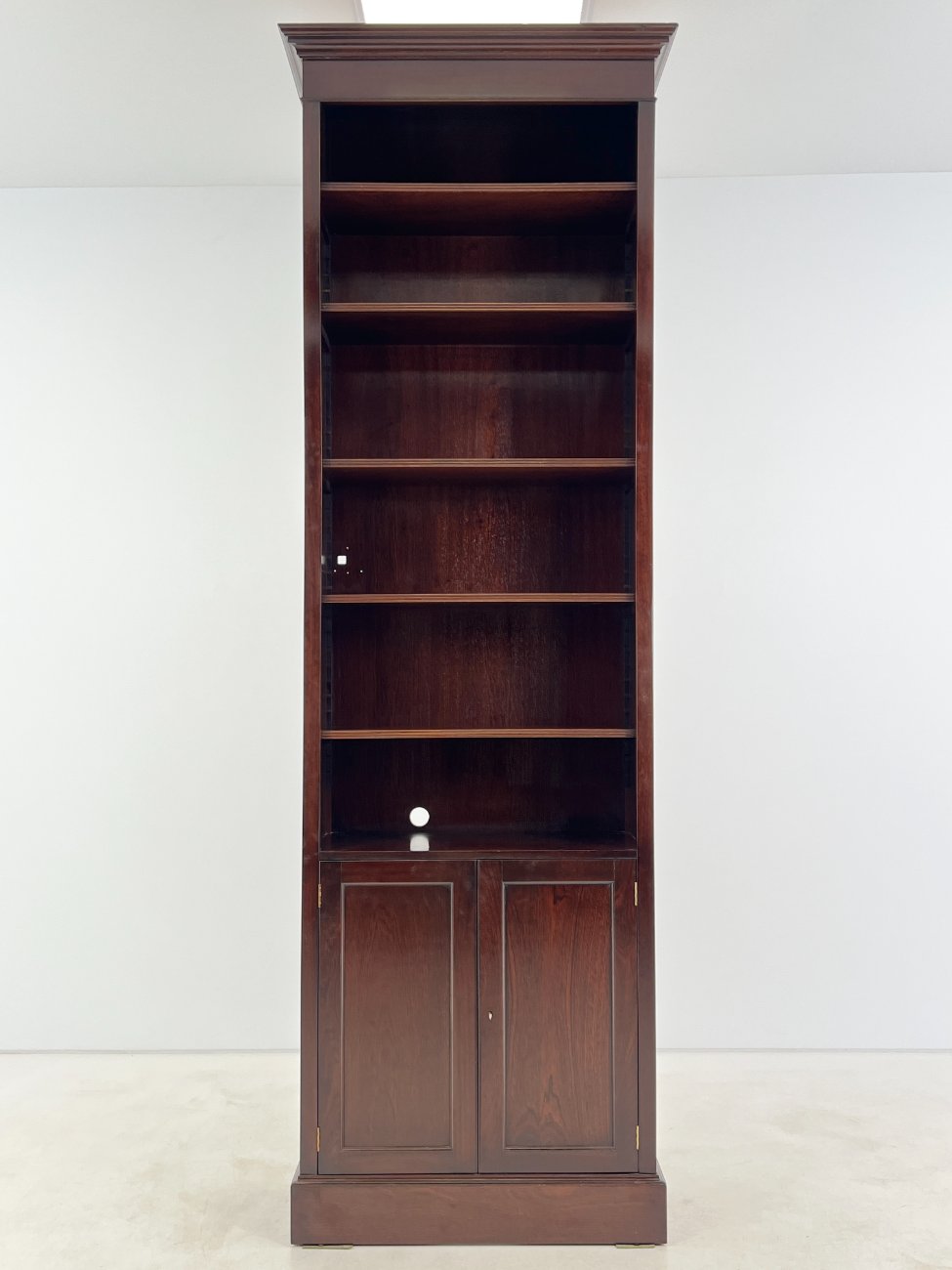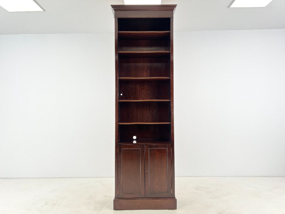Angliško stiliaus aukšta raudonmedžio knygų lentyna.