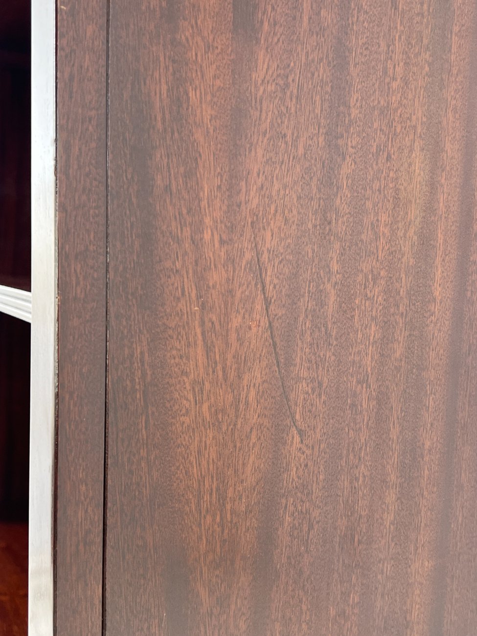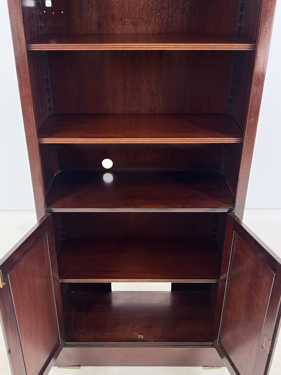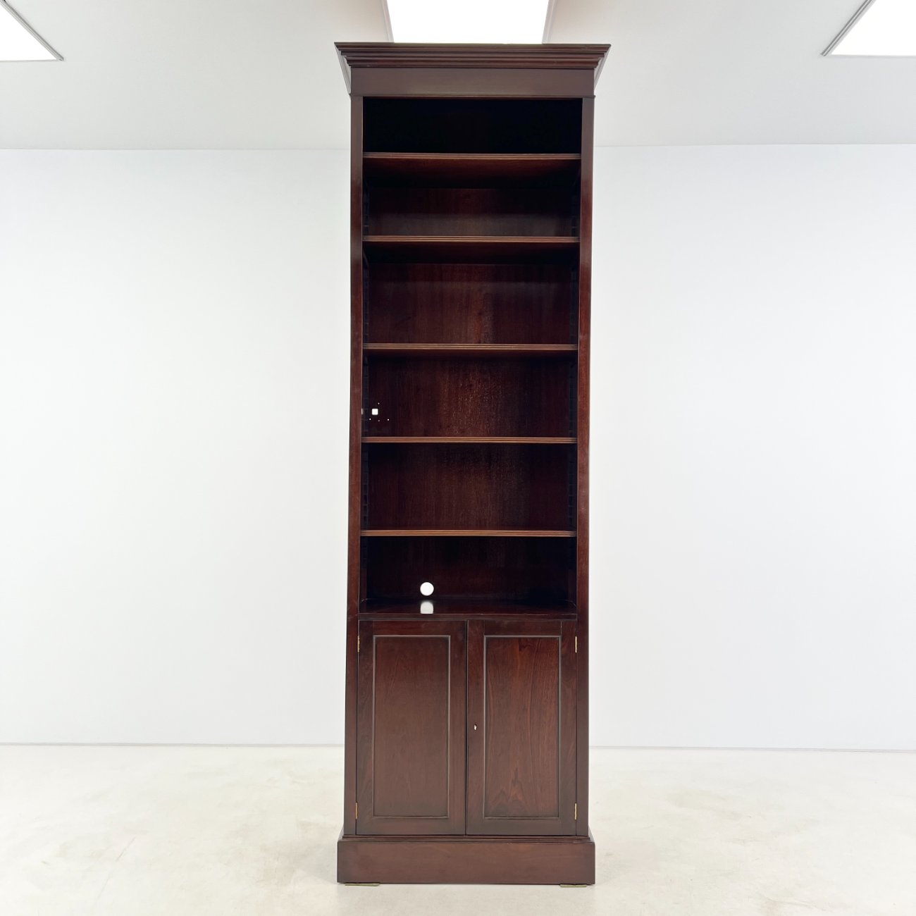 Angliško stiliaus aukšta raudonmedžio knygų lentyna.