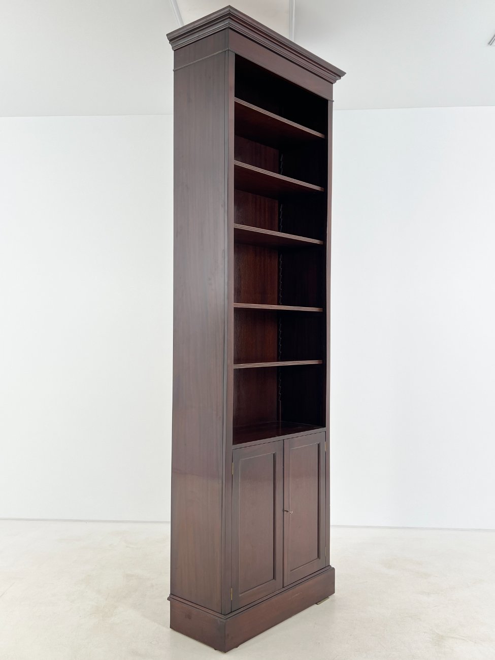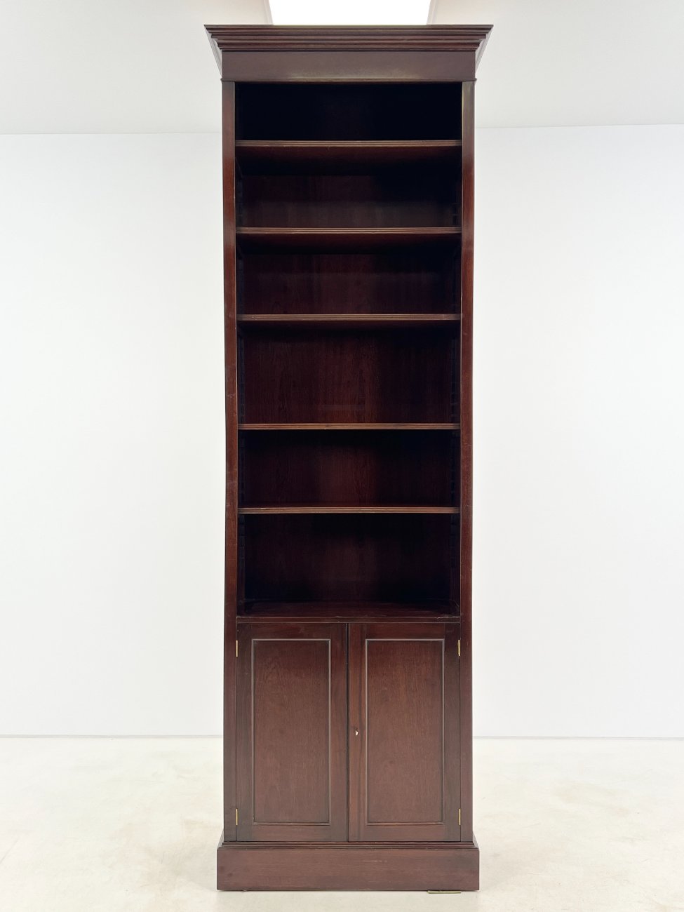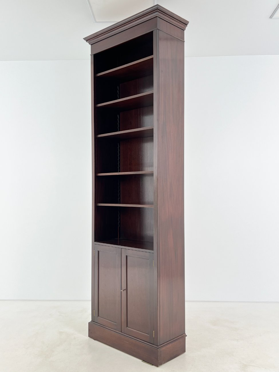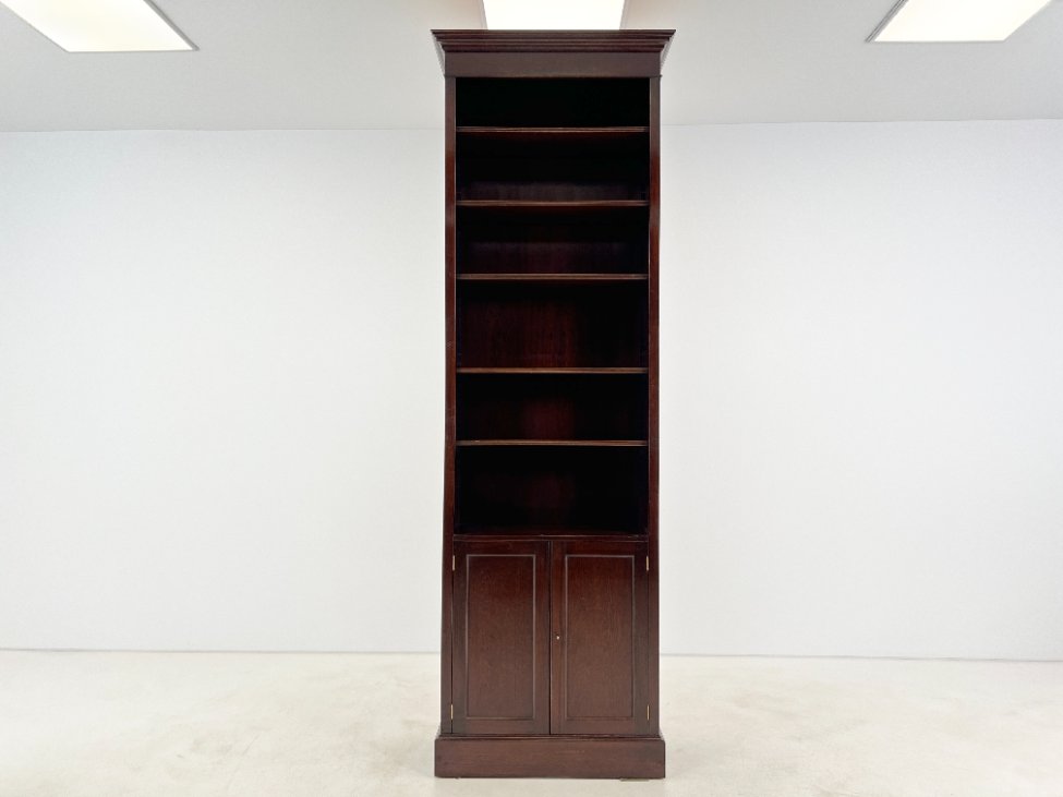 Angliško stiliaus aukšta raudonmedžio knygų lentyna.