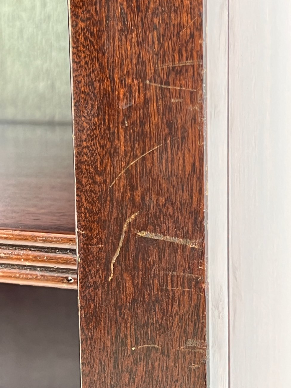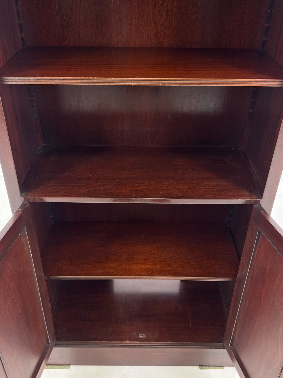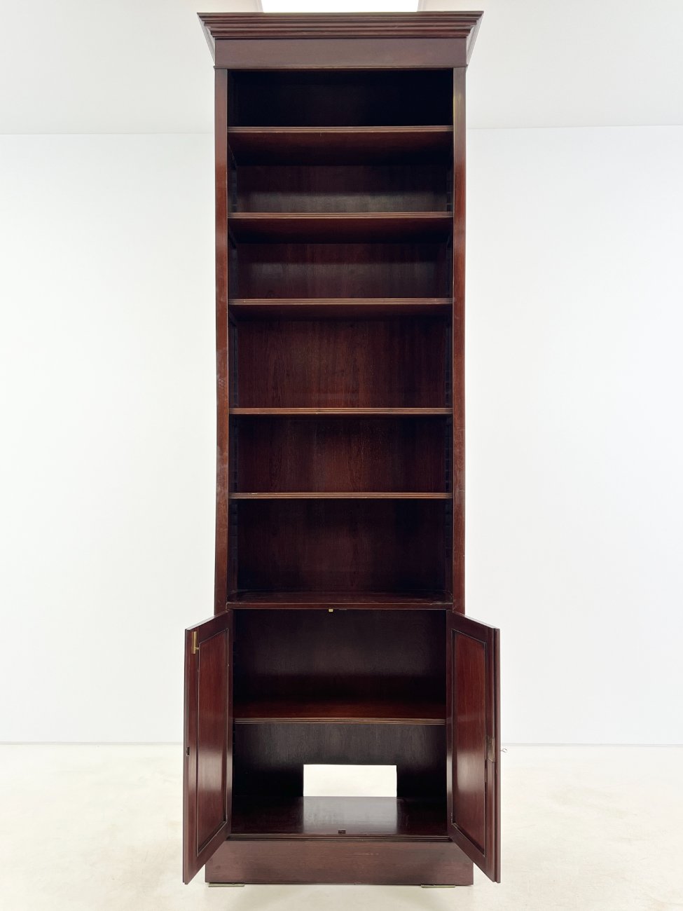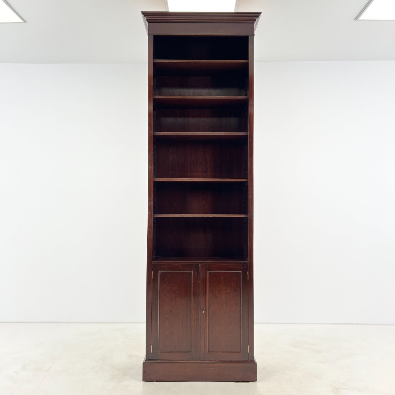 Angliško stiliaus aukšta raudonmedžio knygų lentyna.