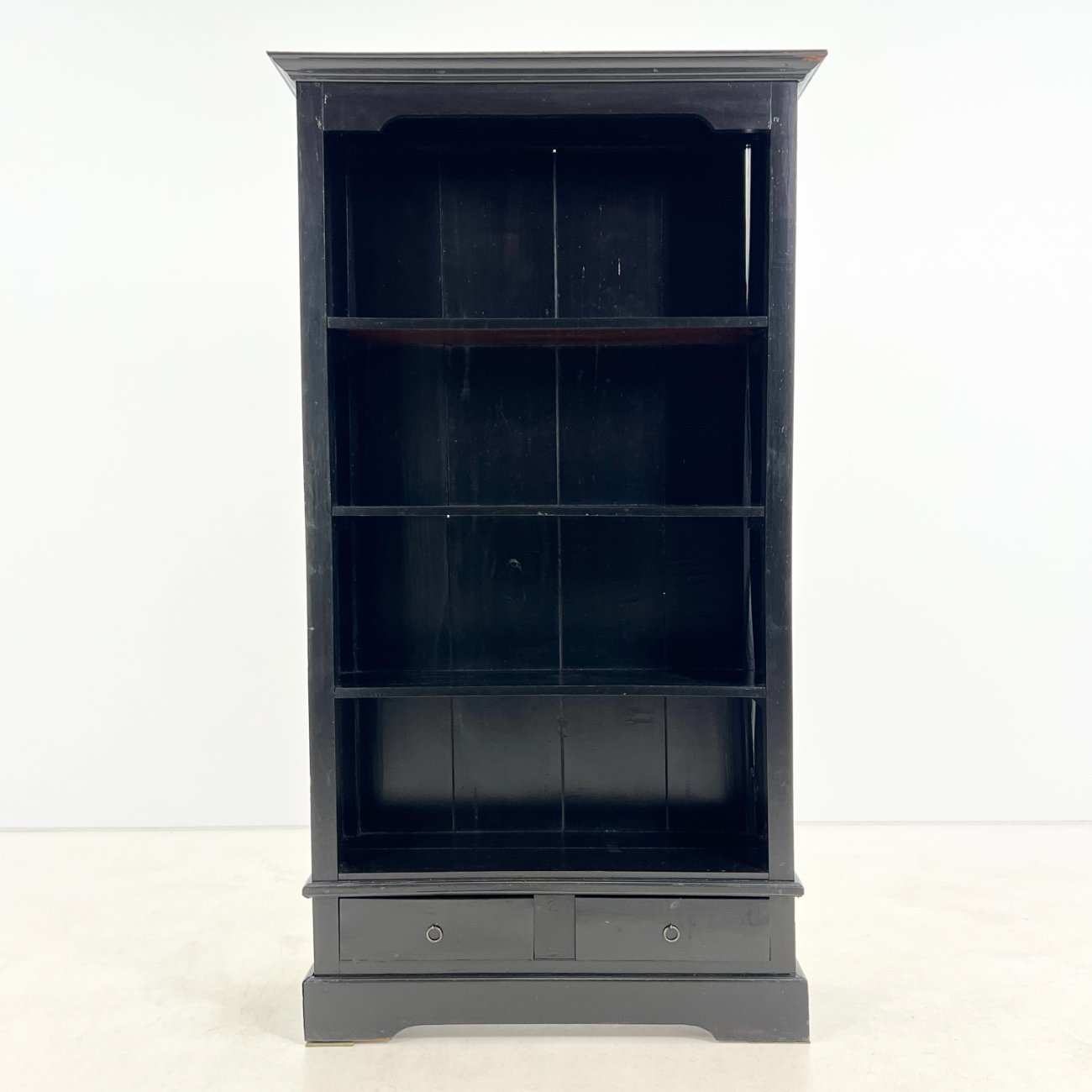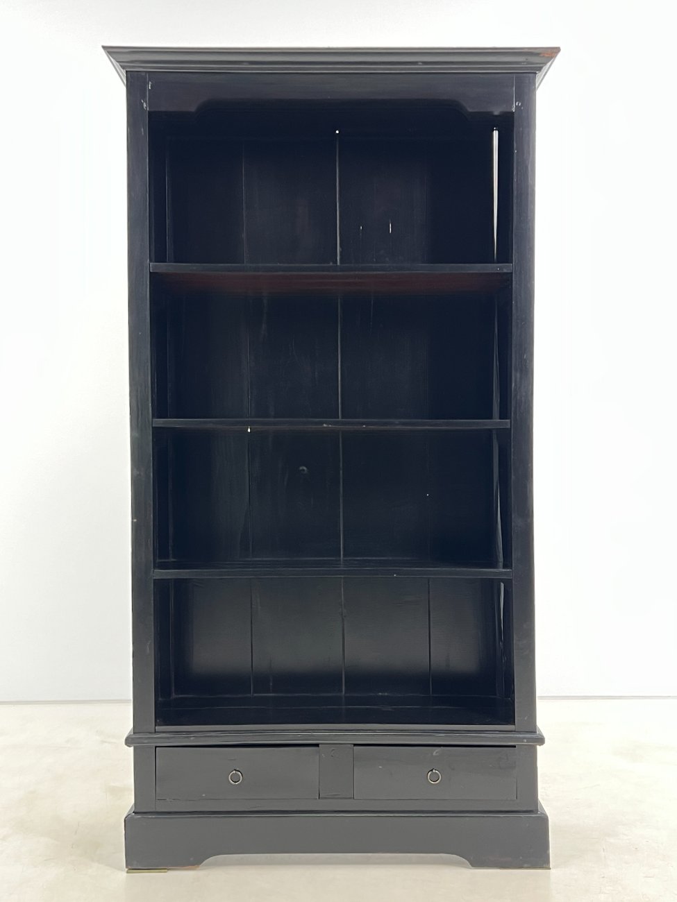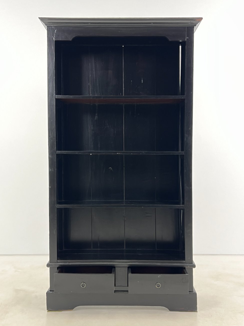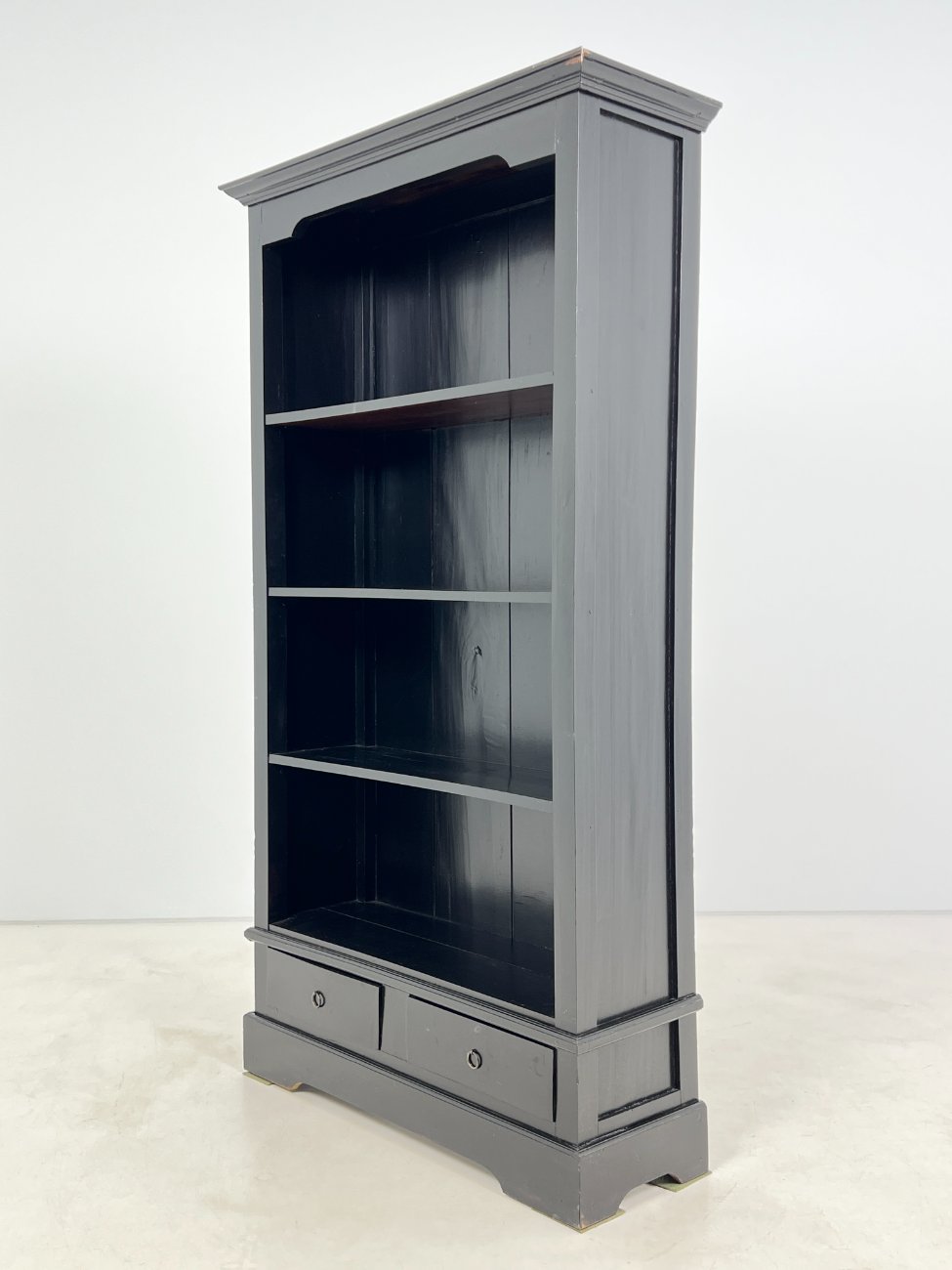 Medinė, pastatoma, juodos spalvos knygų lentyną su stalčiais