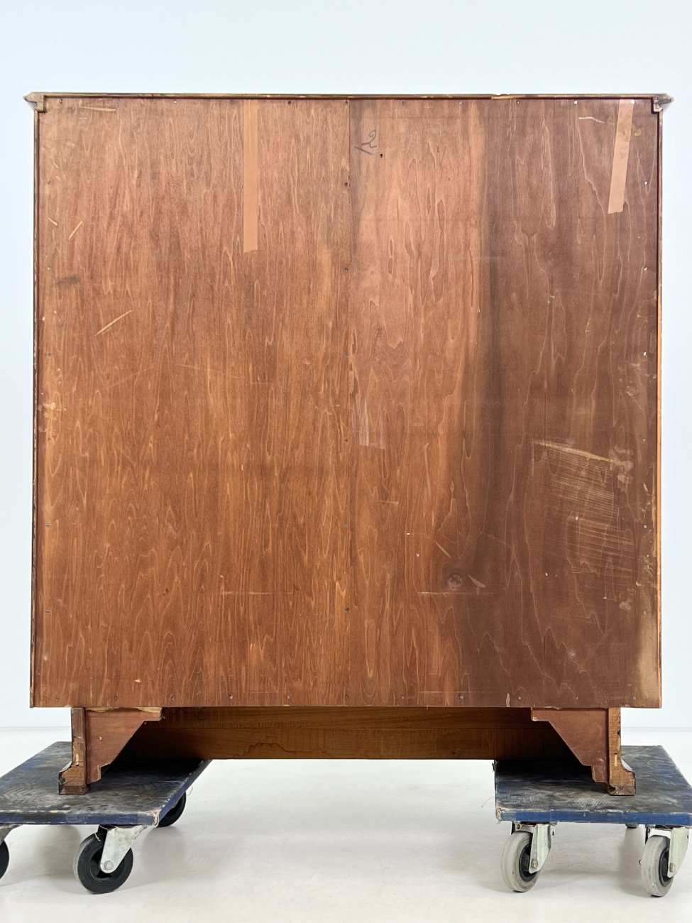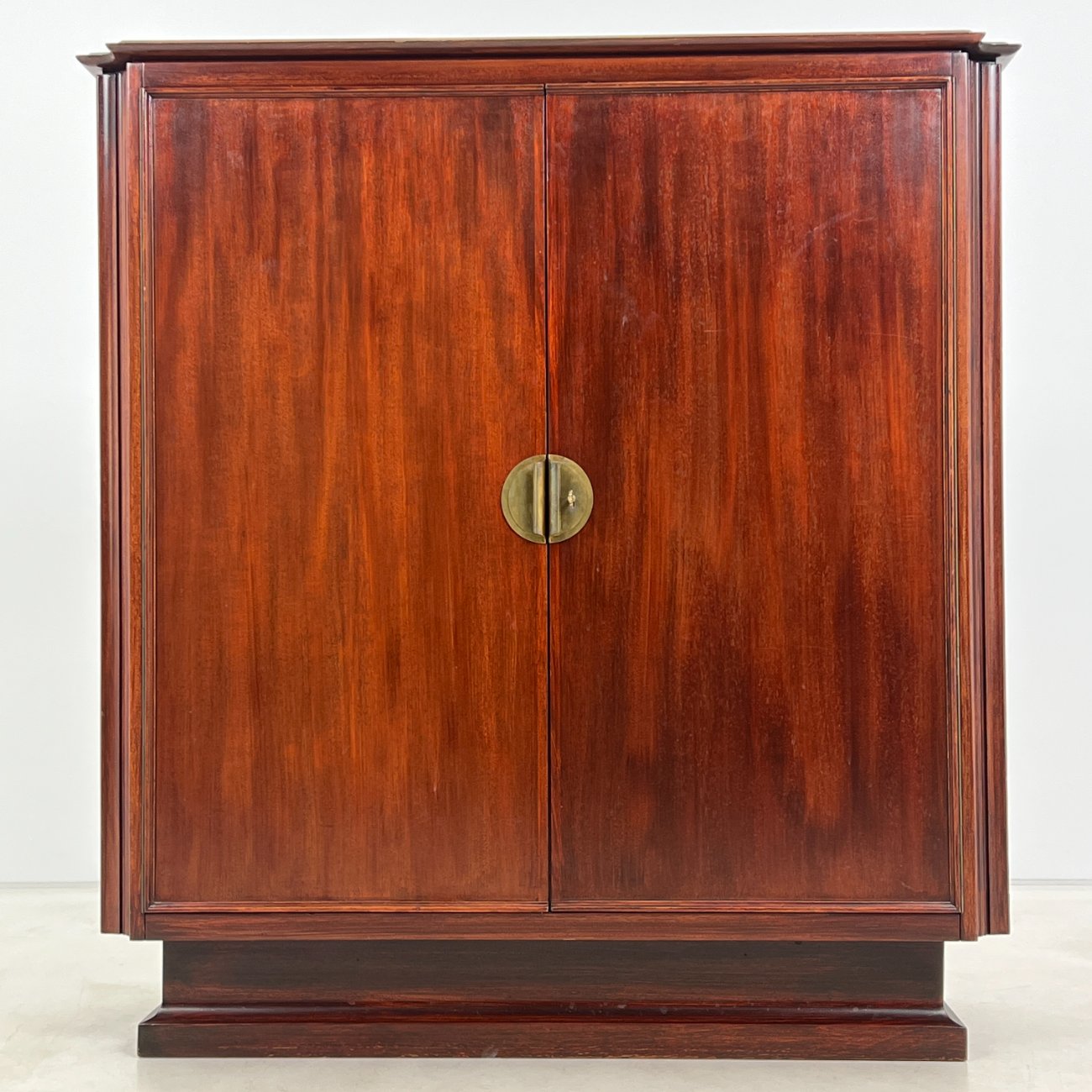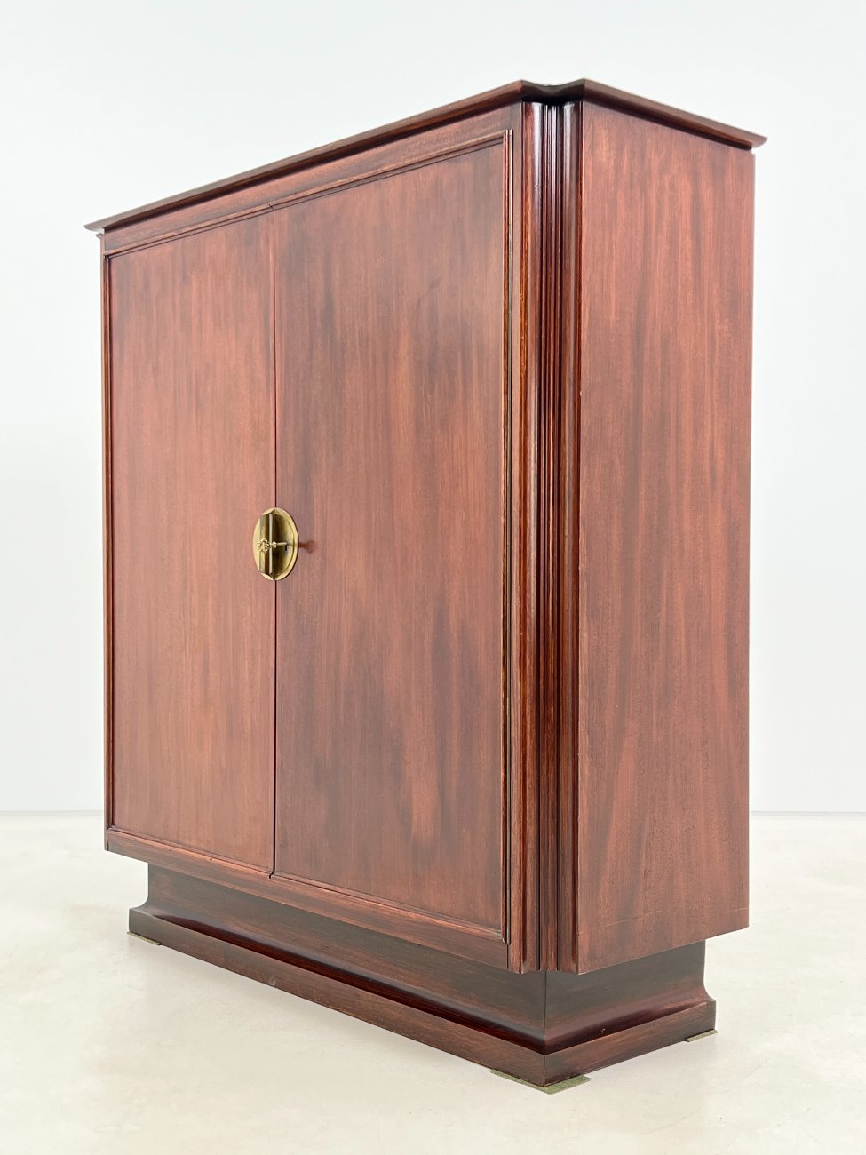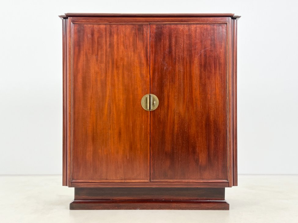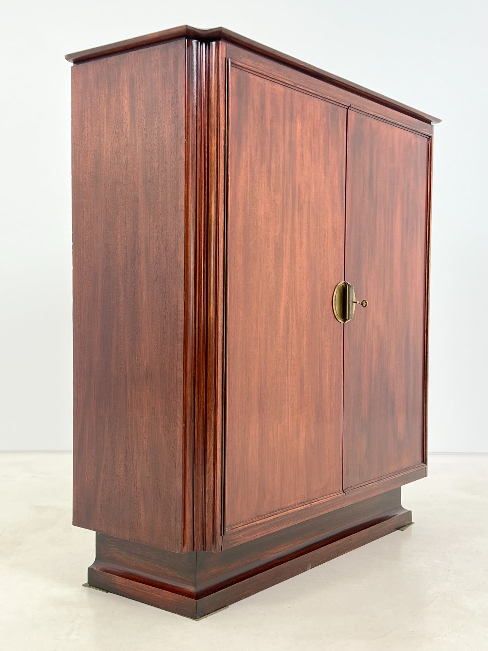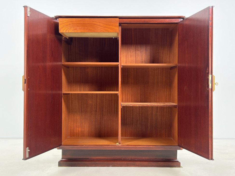 Aukšta dviejų durų raudonmedžio komoda su žalvario rankenomis.