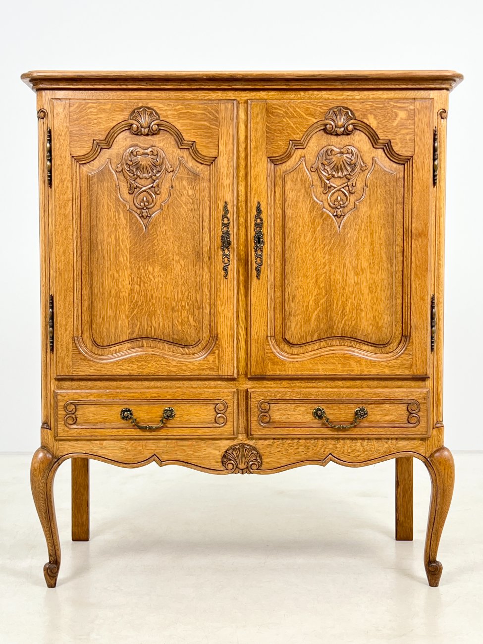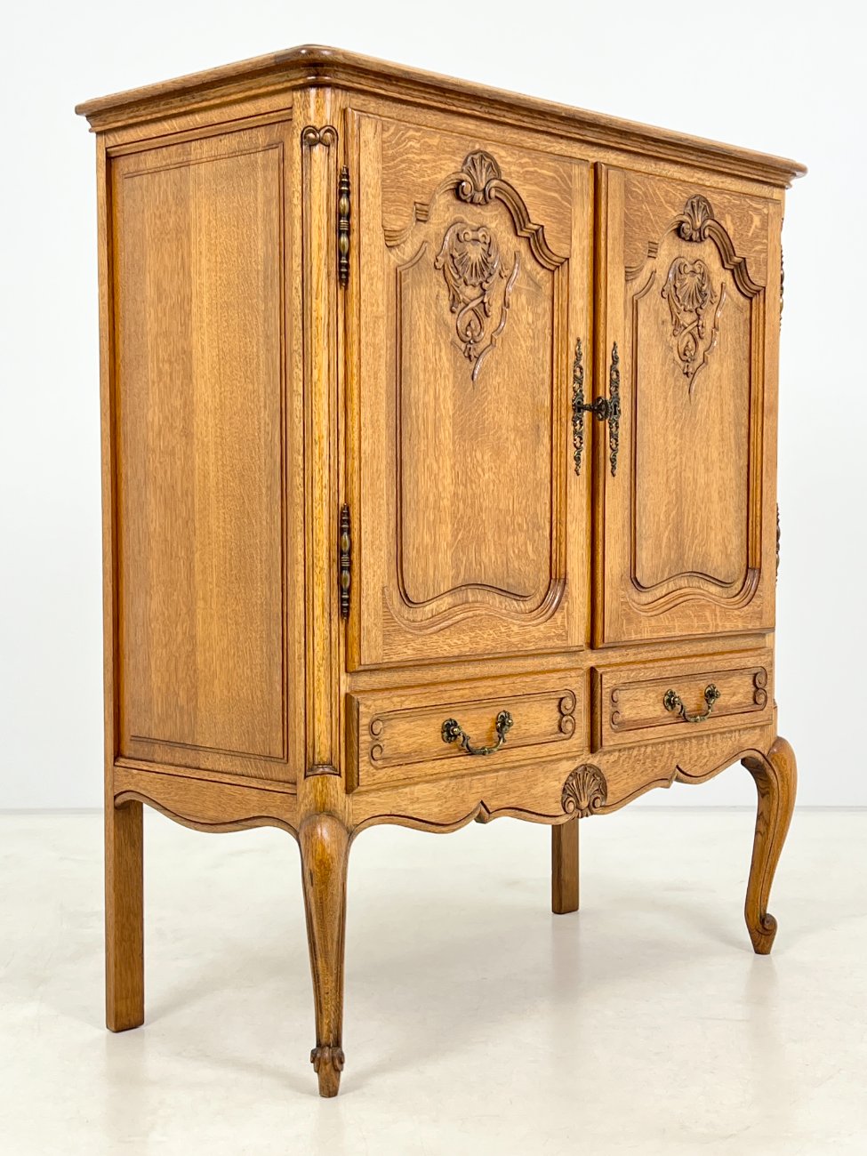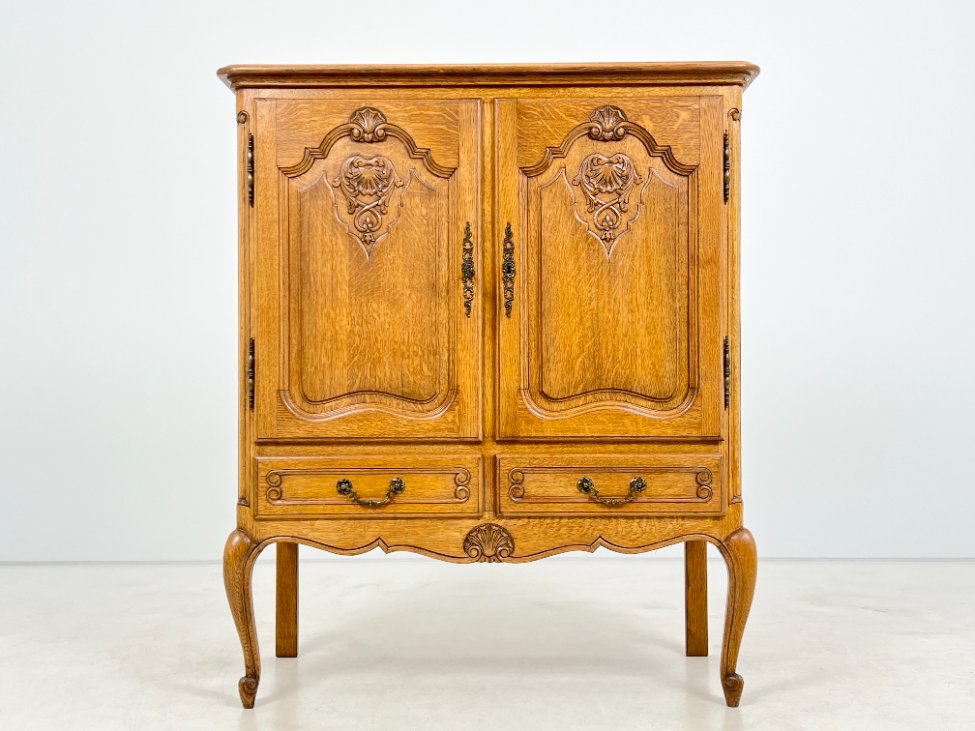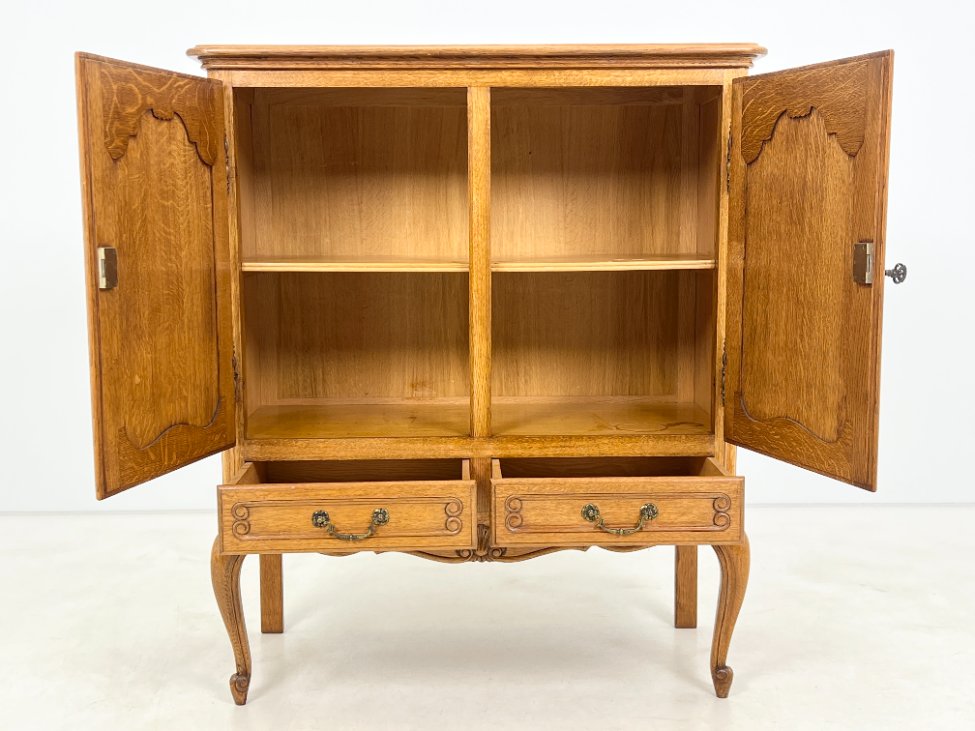 Ąžuolinė dviejų durų ir dviejų stalčių komoda.