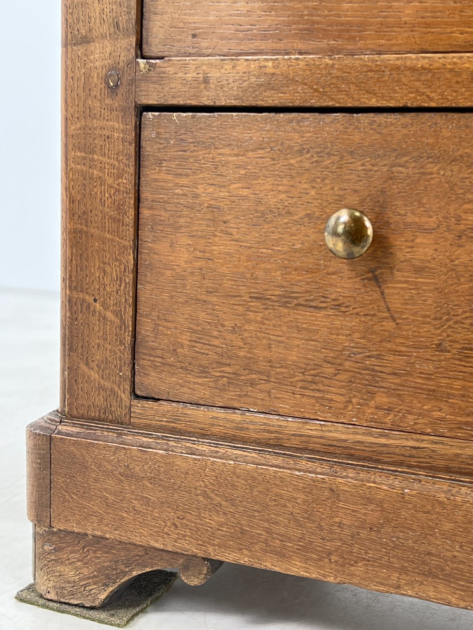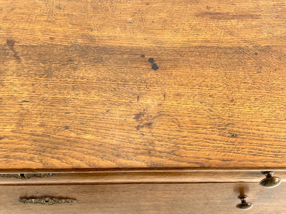 | Papildoma informacija | Matomos amžiaus ir naudojimo žymės, per visą paviršių yra pabraižymų, įmušimų, dėmių. Yra medienos įskilimų tiek išorėje, tiek stalčių dugnuose. Yra kinivarpų pažeidimų. |