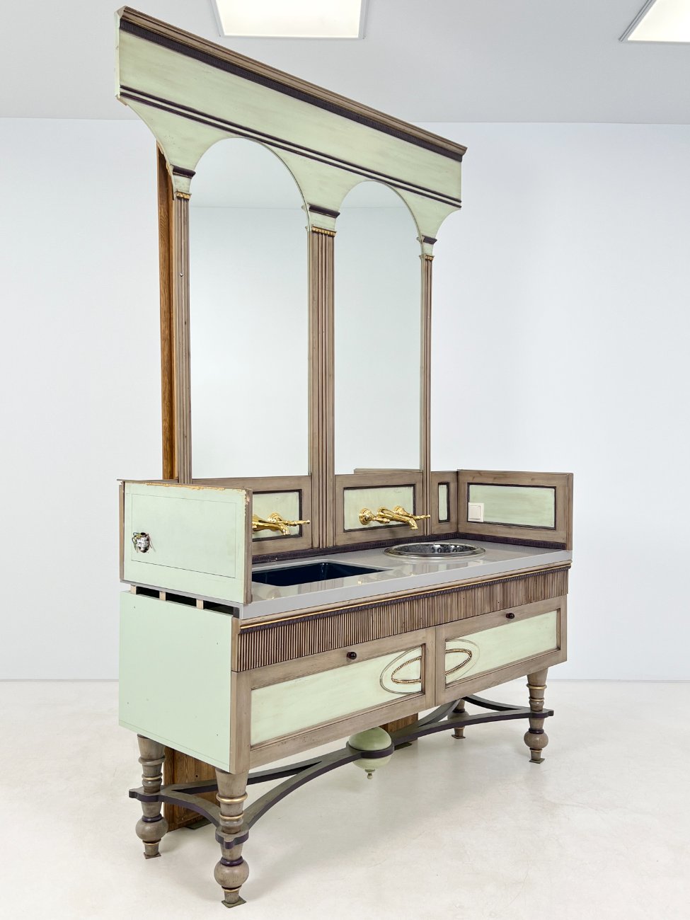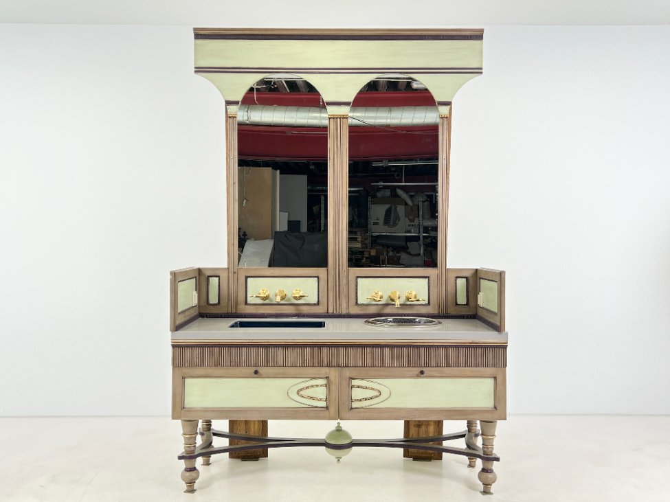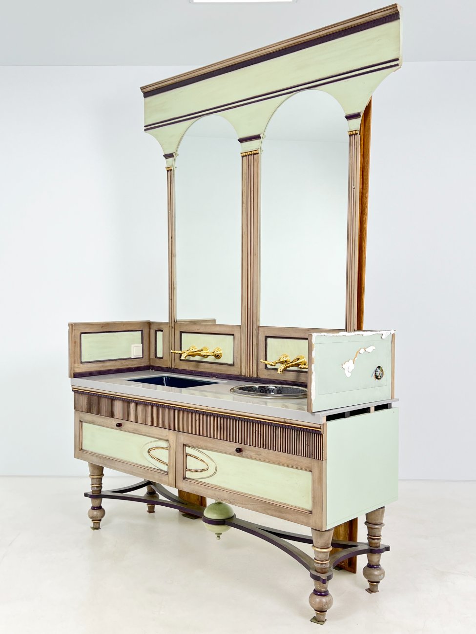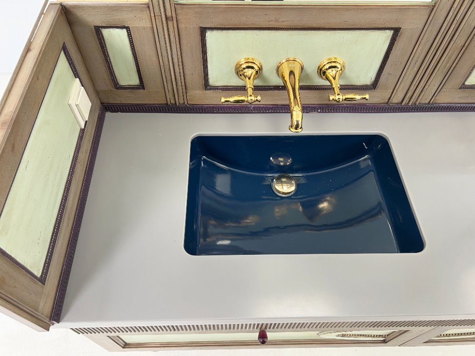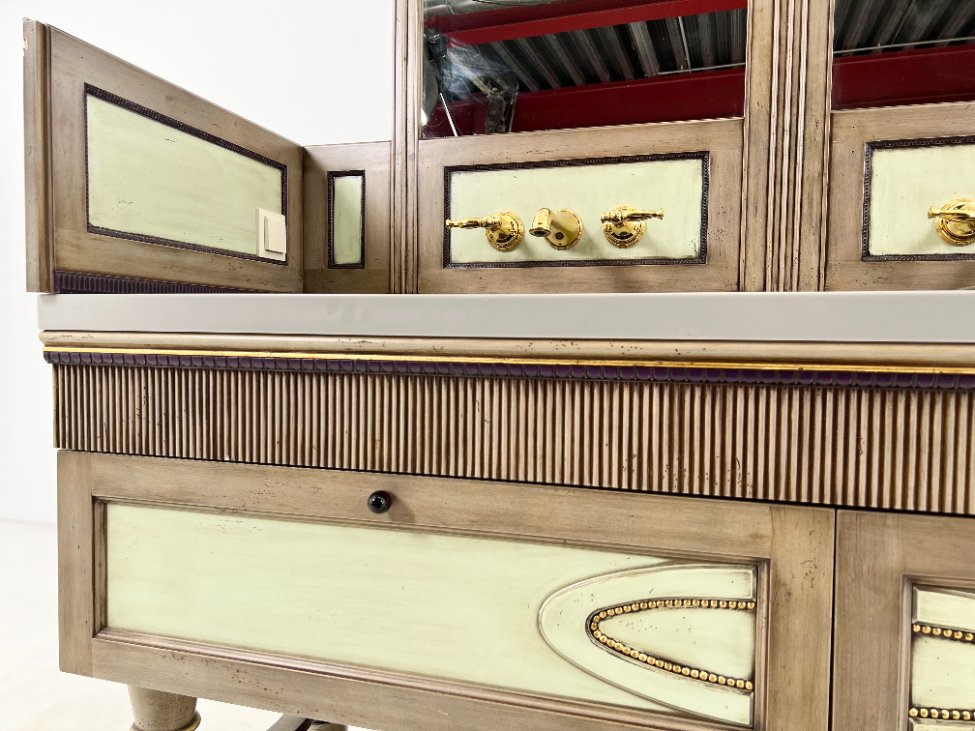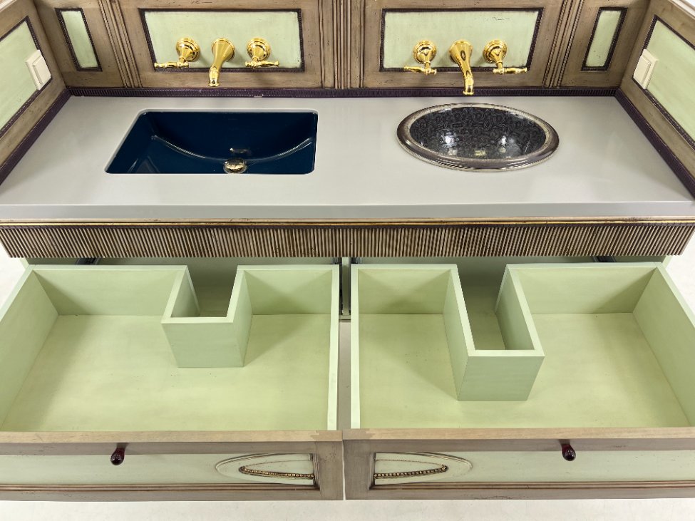 | Papildoma informacija | Matomos naudojimo žymės, vietomis yra pabraižymų, įmušimų, dėmių. Nugarinėje dalyje ir šonų nugarinėse dalyse likę tvirtinimo klijai., Naudota sendinimo technika. Stalviršio aukštis 85 cm. Keramikiniai praustuvai, kairiojo gamintojas "Kohler", žalvariniai maišytuvai "Graff", epoksidinis stalviršis. |