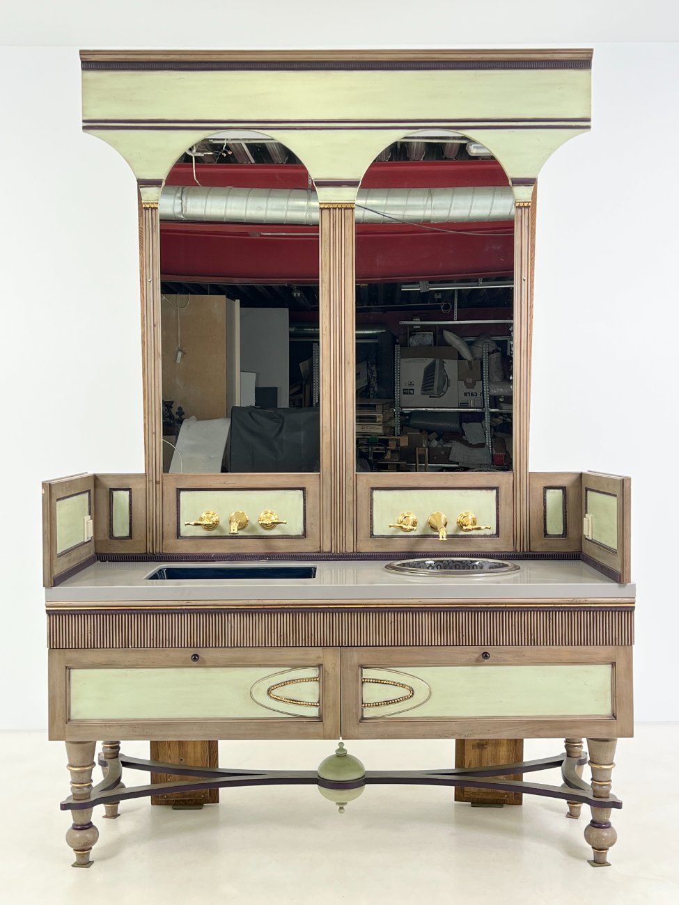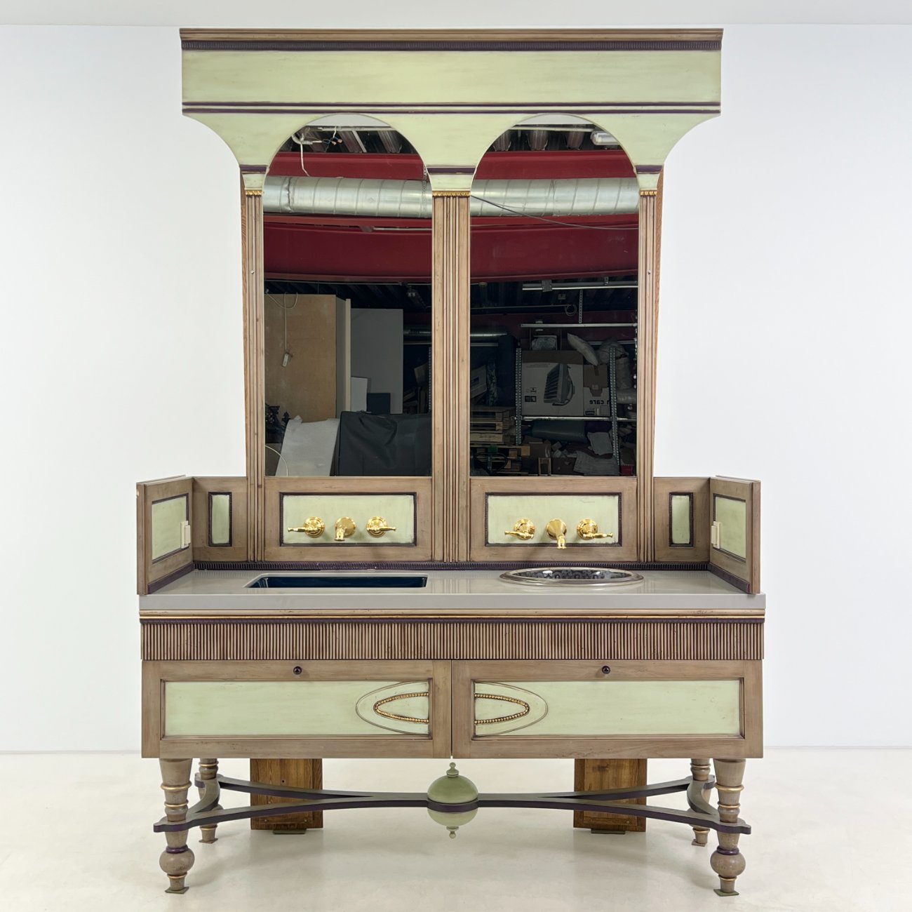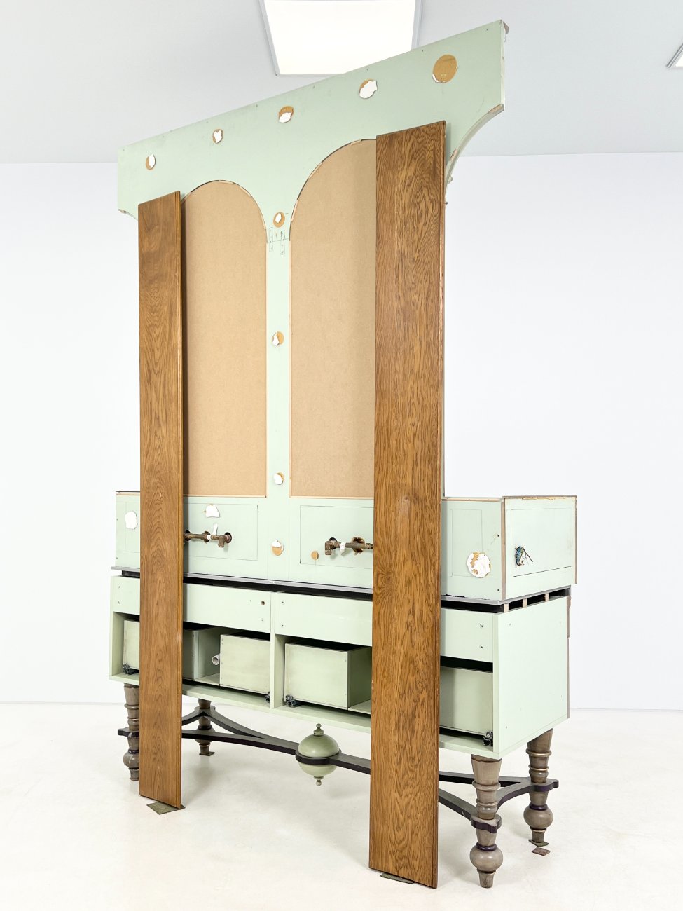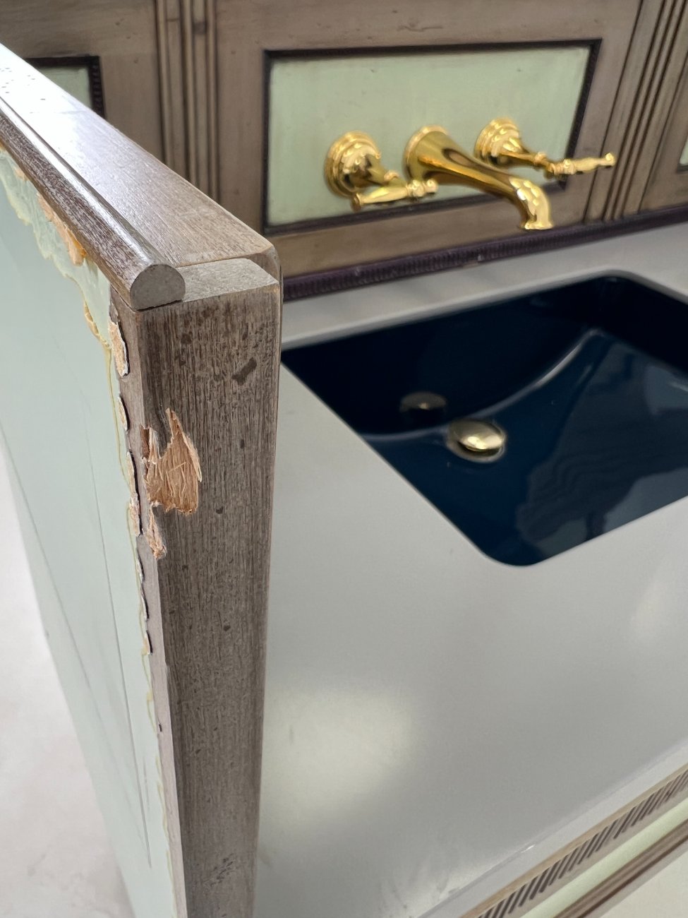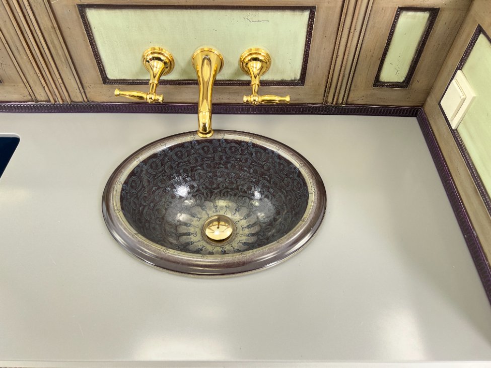 | Papildoma informacija | Matomos naudojimo žymės, vietomis yra pabraižymų, įmušimų, dėmių. Nugarinėje dalyje ir šonų nugarinėse dalyse likę tvirtinimo klijai., Naudota sendinimo technika. Stalviršio aukštis 85 cm. Keramikiniai praustuvai, kairiojo gamintojas "Kohler", žalvariniai maišytuvai "Graff", epoksidinis stalviršis. |