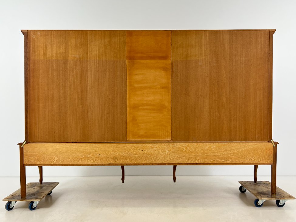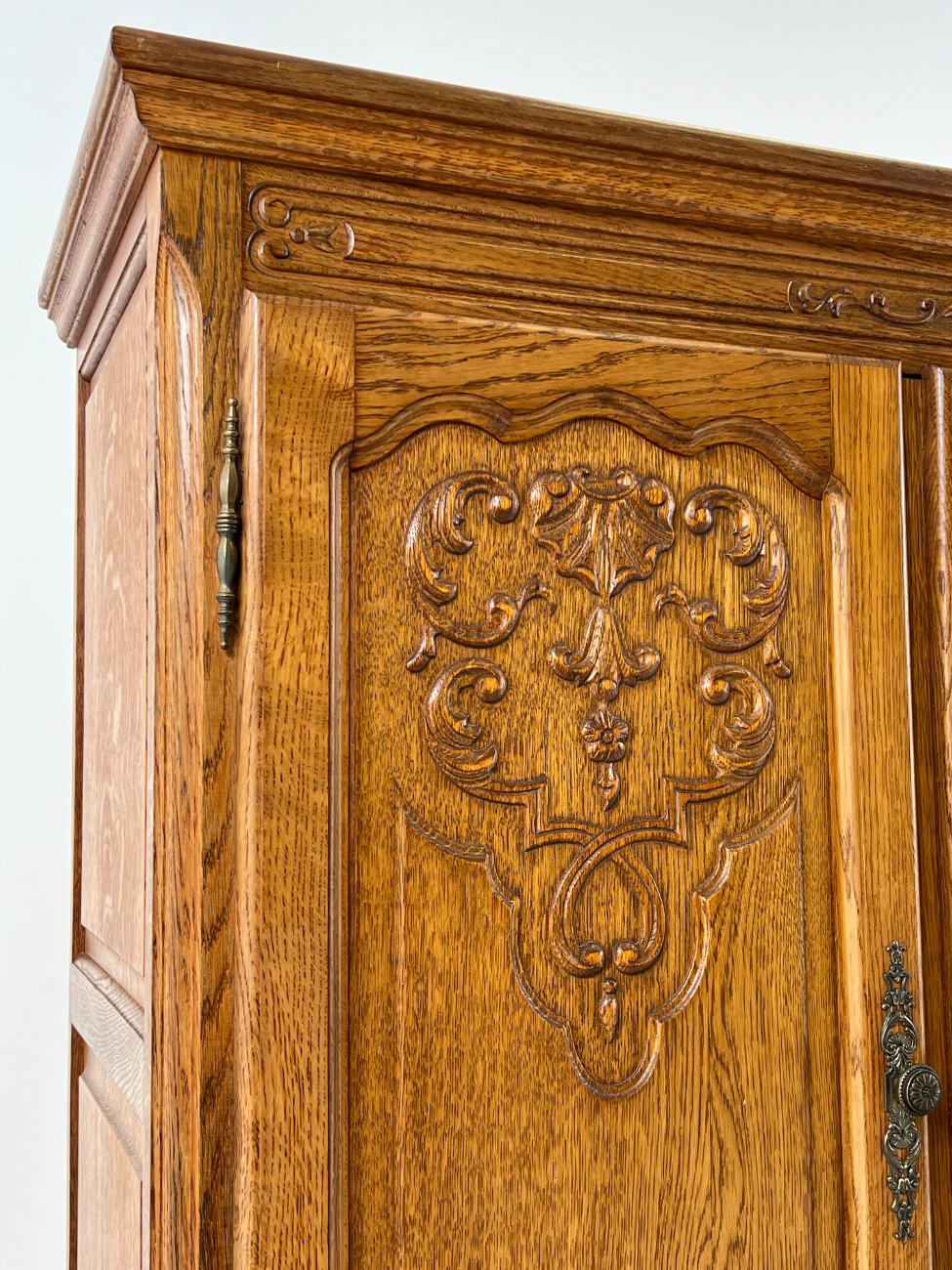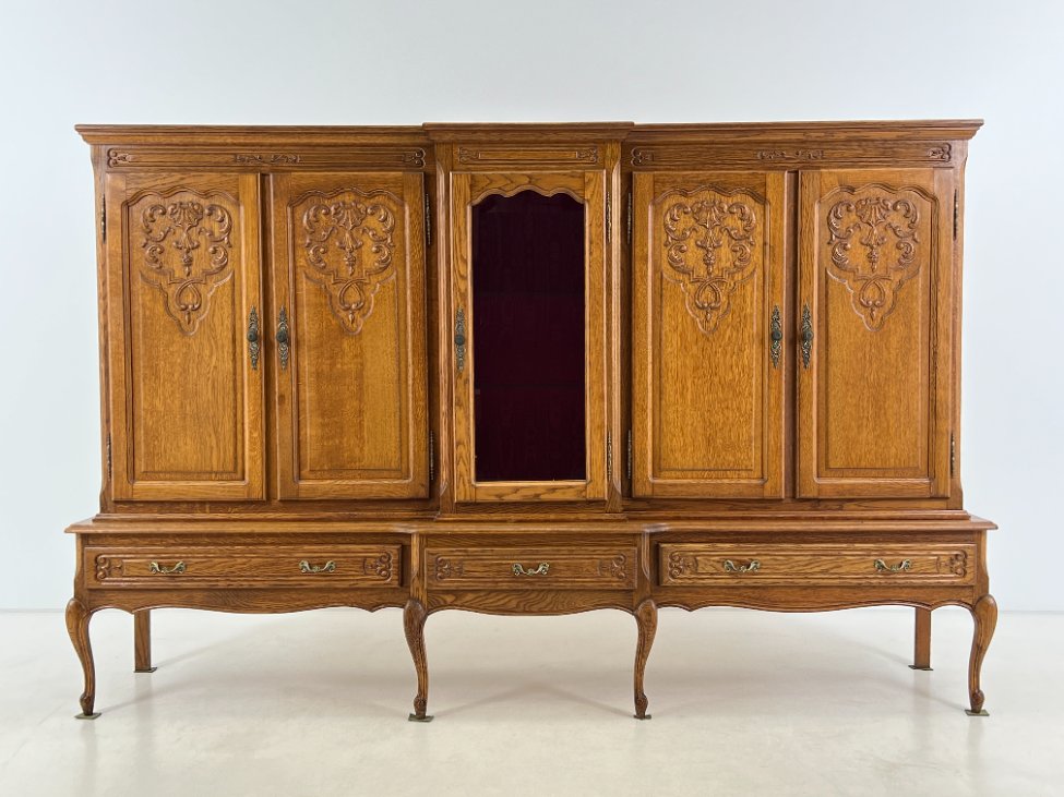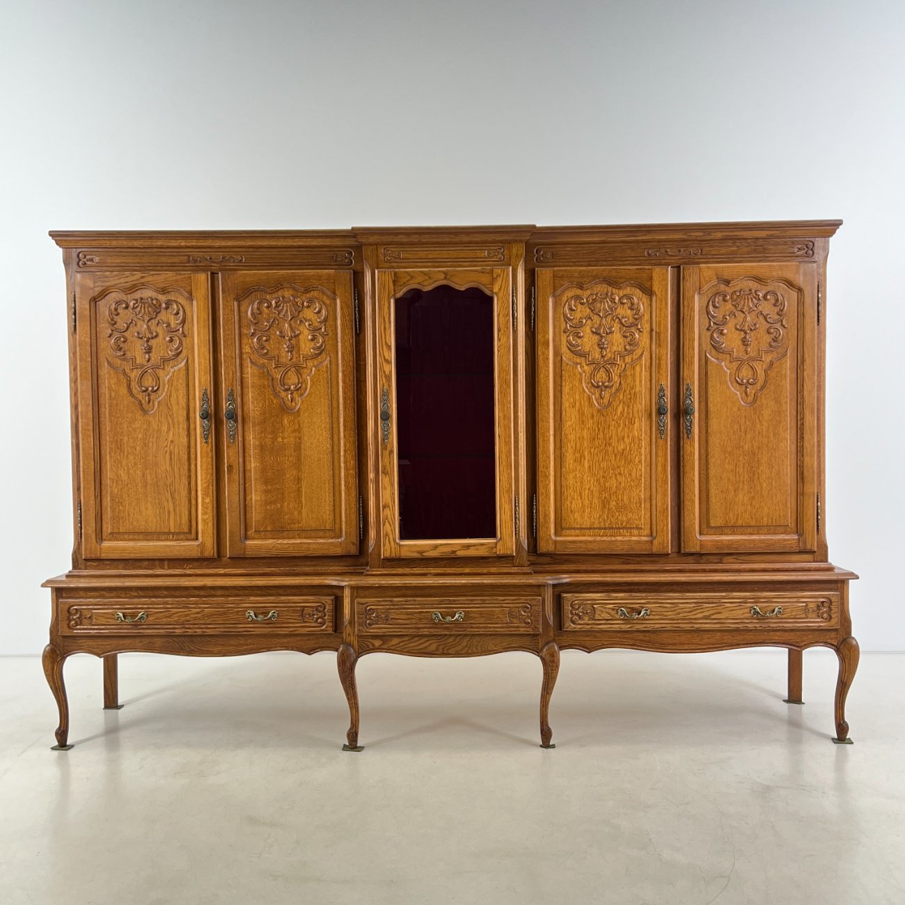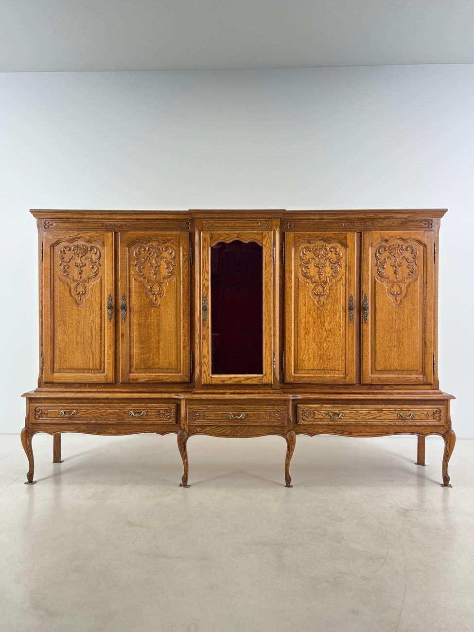Ilga drožinėta dviejų dalių ąžuolinė penkių durų ir trijų stalčių komoda su įstiklintomis centrinėmis durimis.