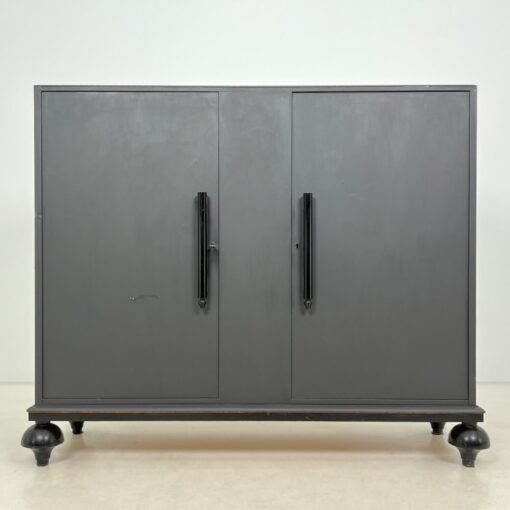 Industrinio stiliaus pilka dviejų durų komoda.