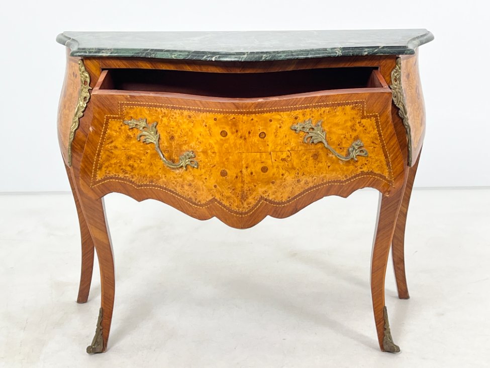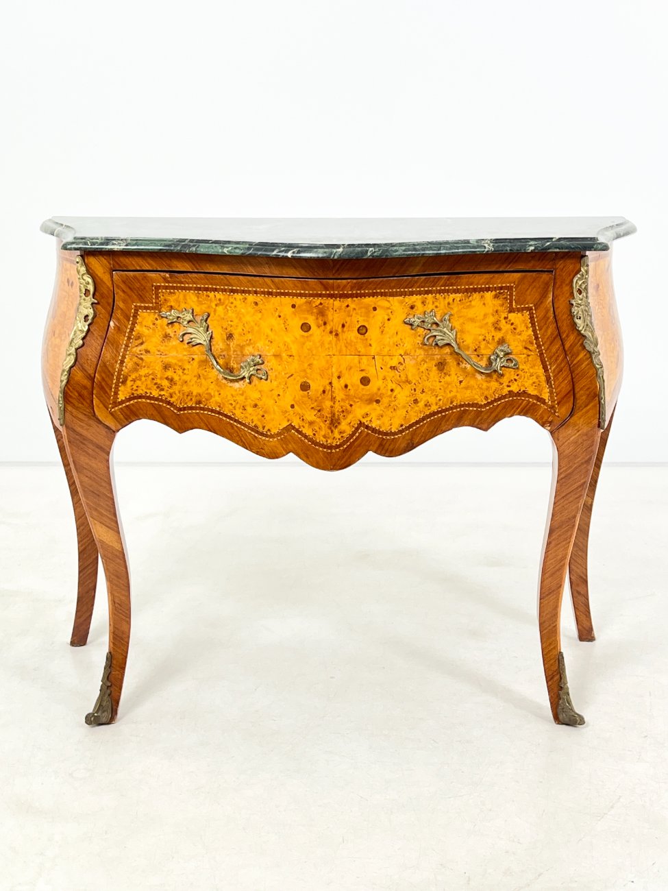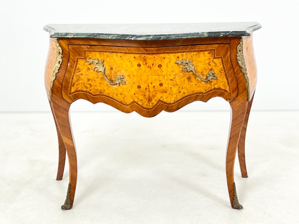 Liudviko XV laikotarpio stiliaus inkrustuota komoda su marmuru ir žalvario detalėmis.