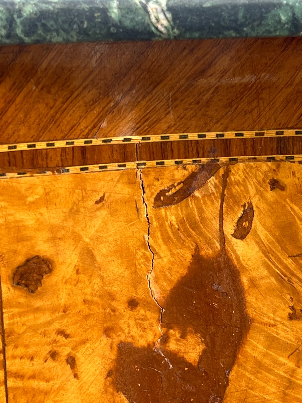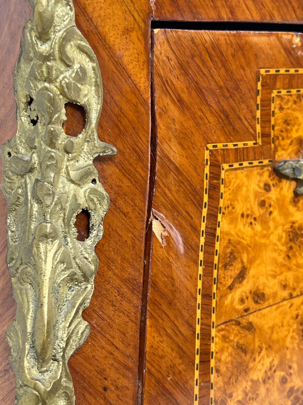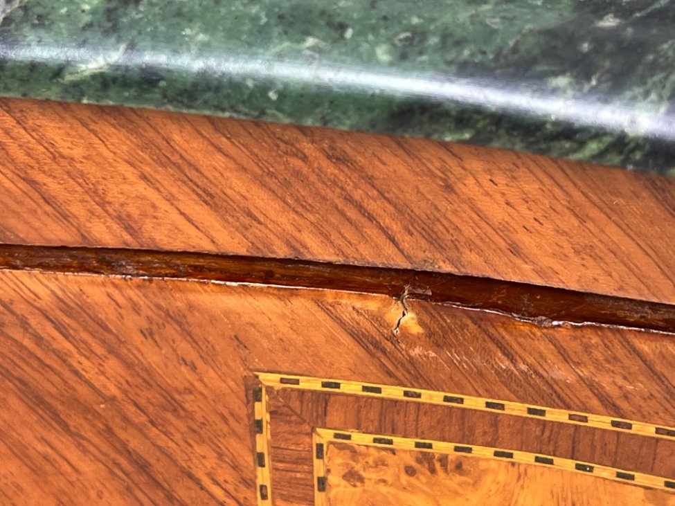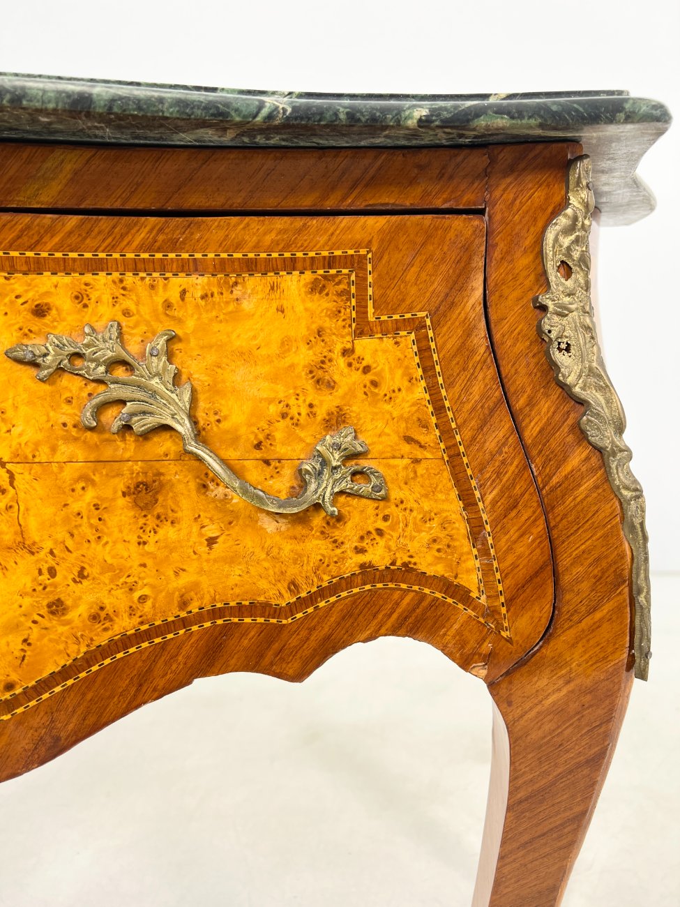 Liudviko XV laikotarpio stiliaus inkrustuota komoda su marmuru ir žalvario detalėmis 45x103x78,5 cm
