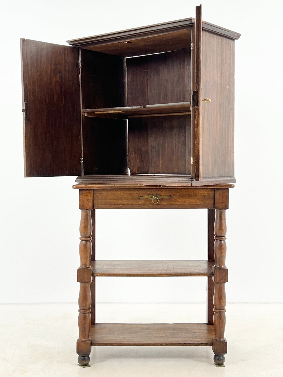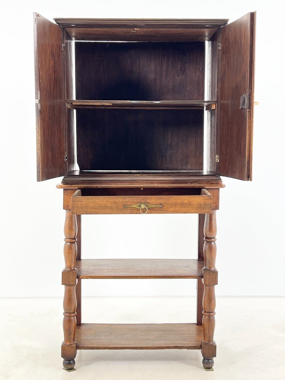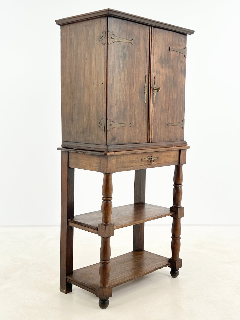 Medinė dviejų durų komoda su stalčiumi ir lentynomis.