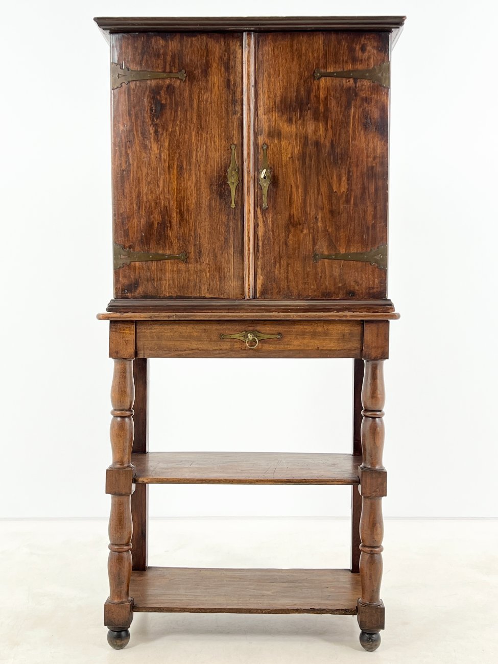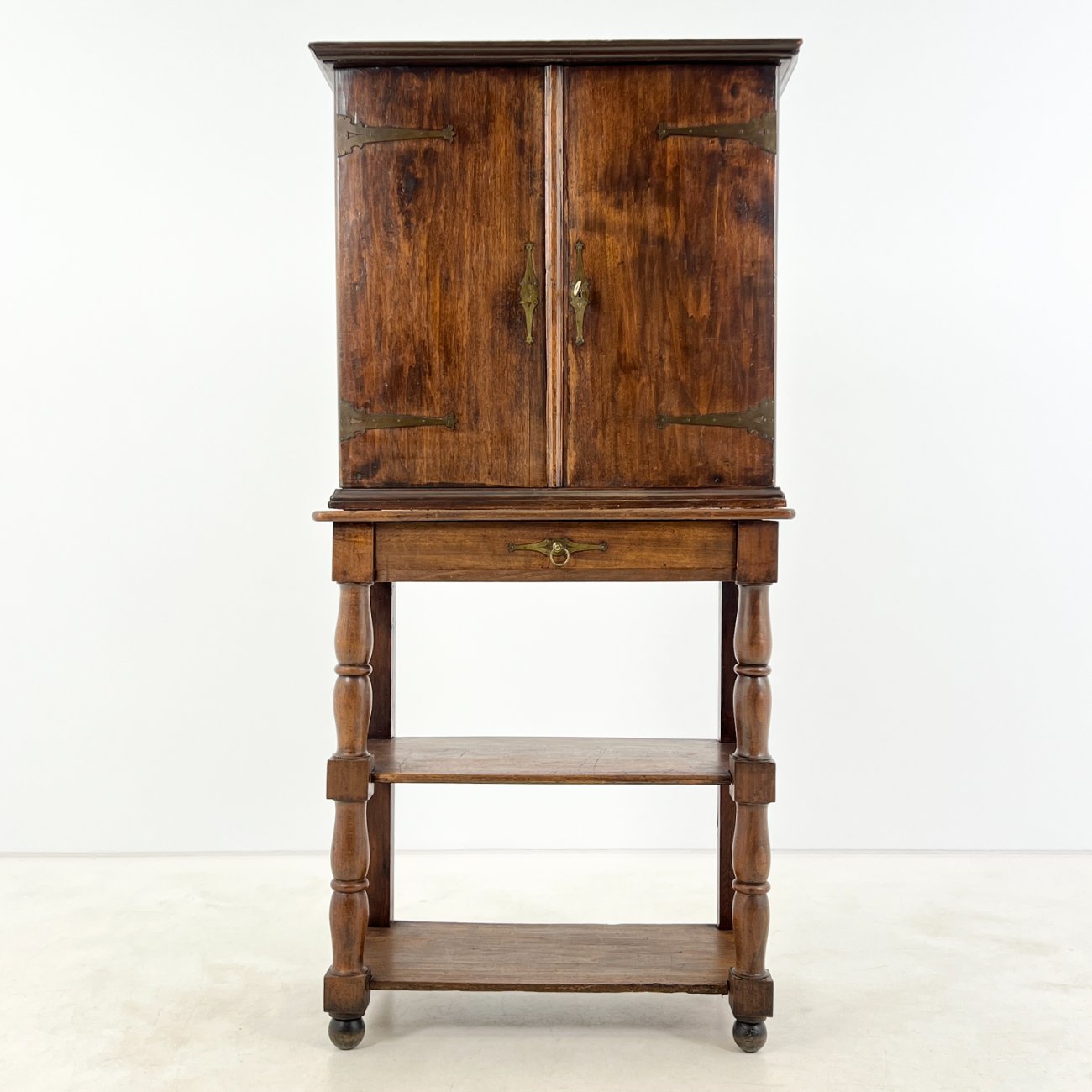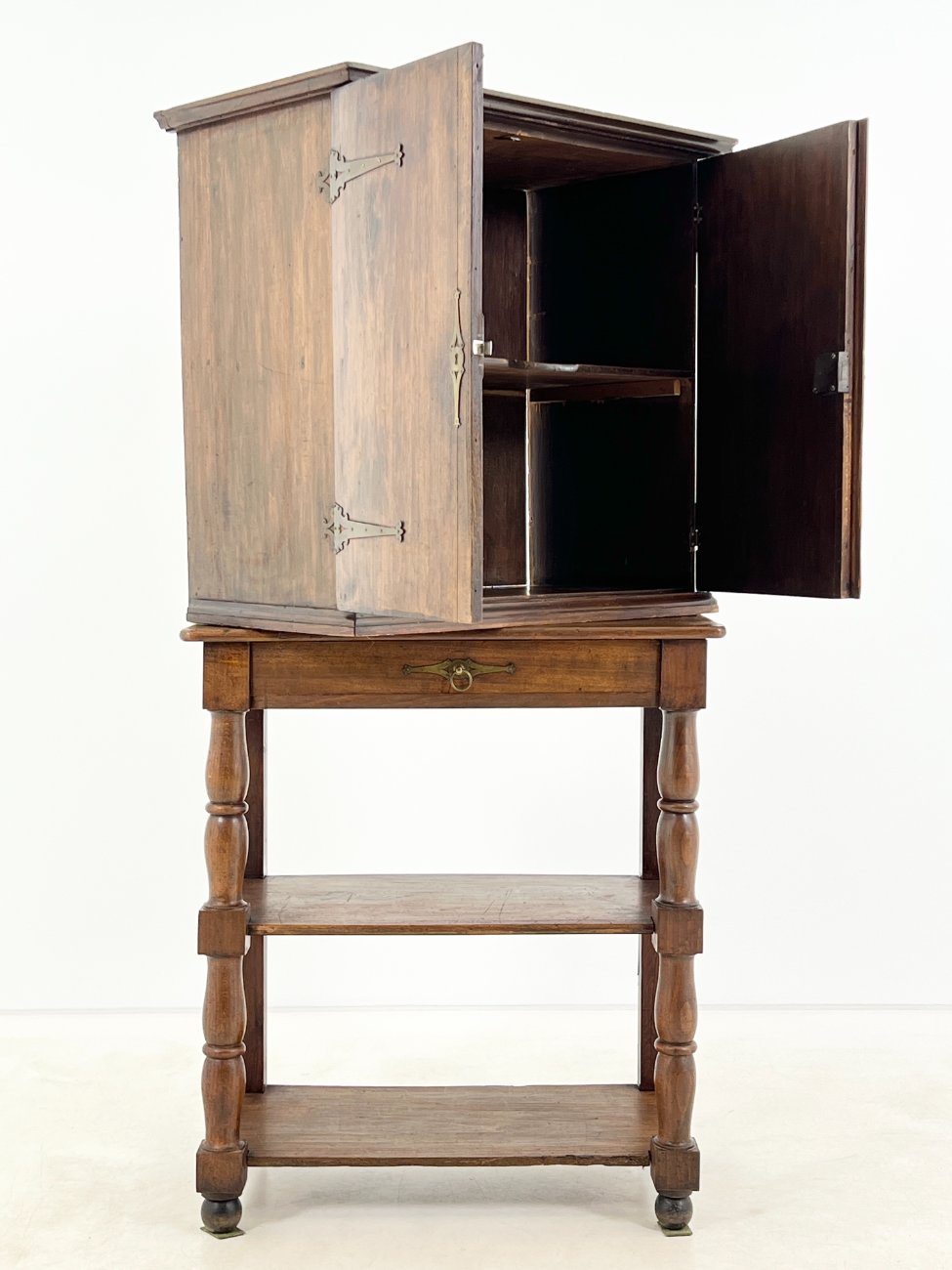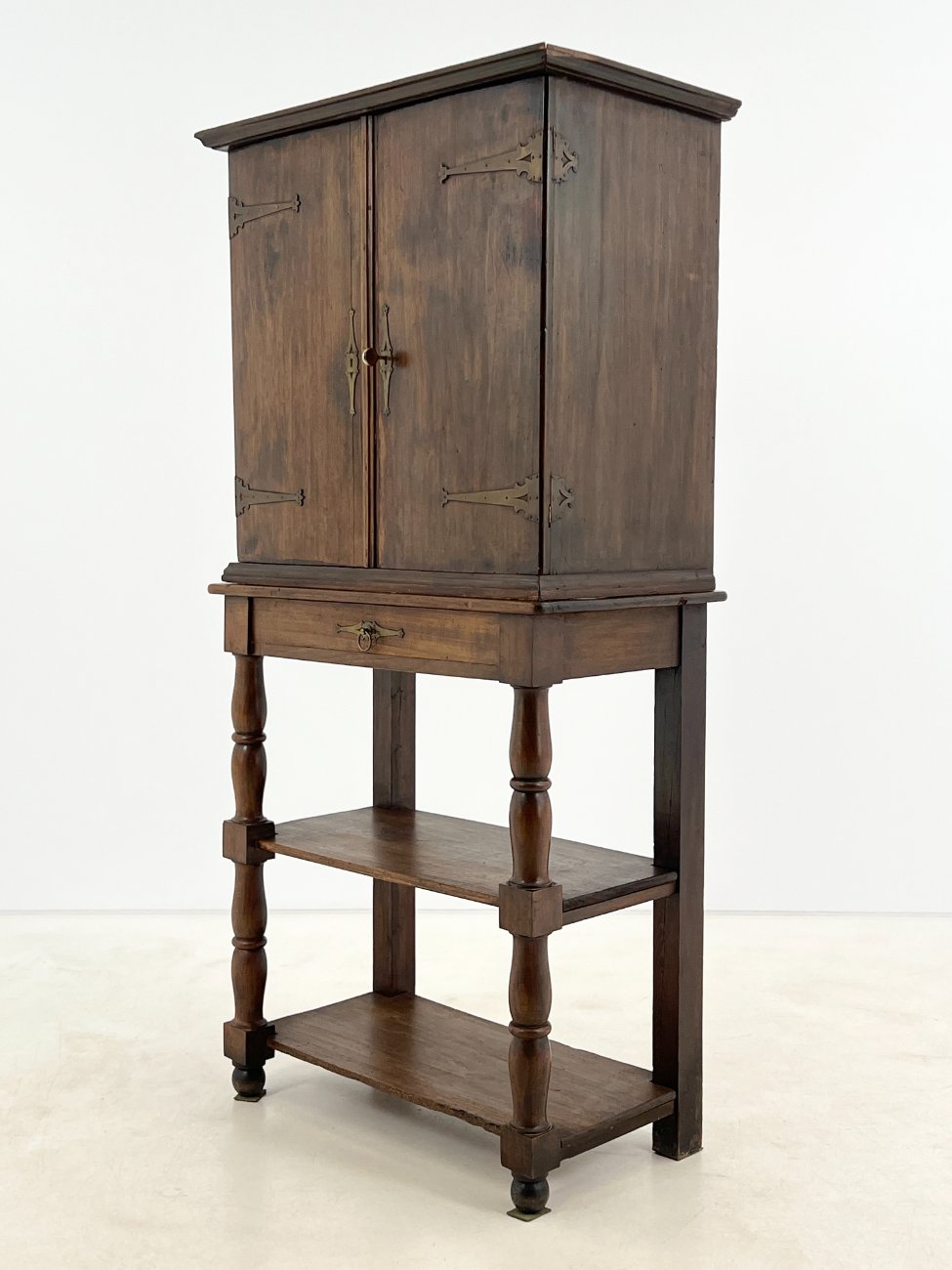 Medinė dviejų durų komoda su stalčiumi ir lentynomis.