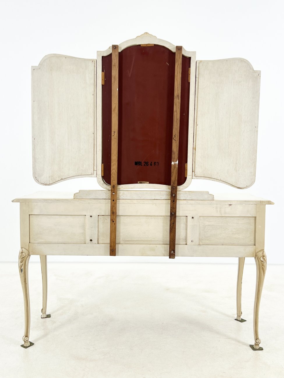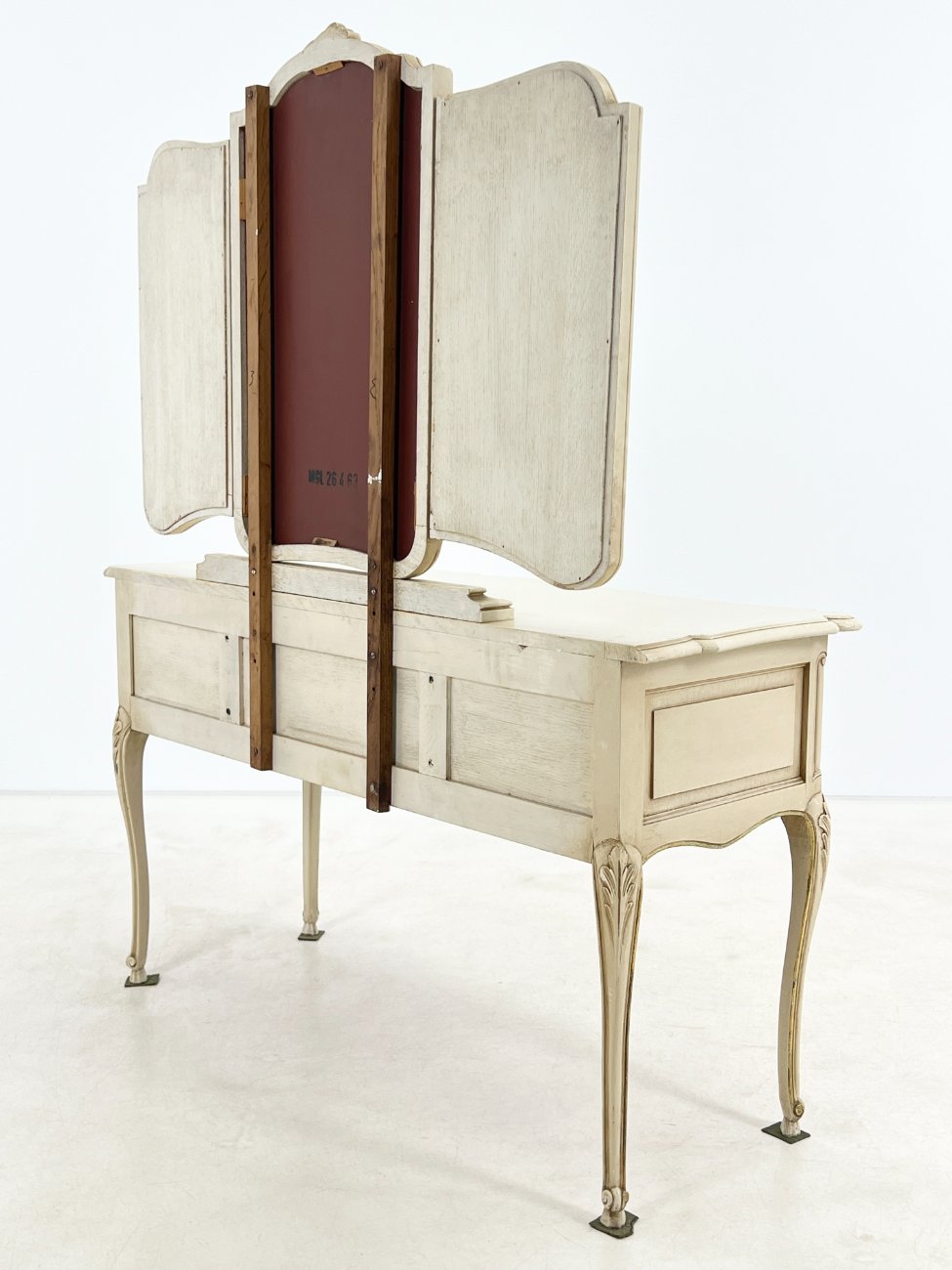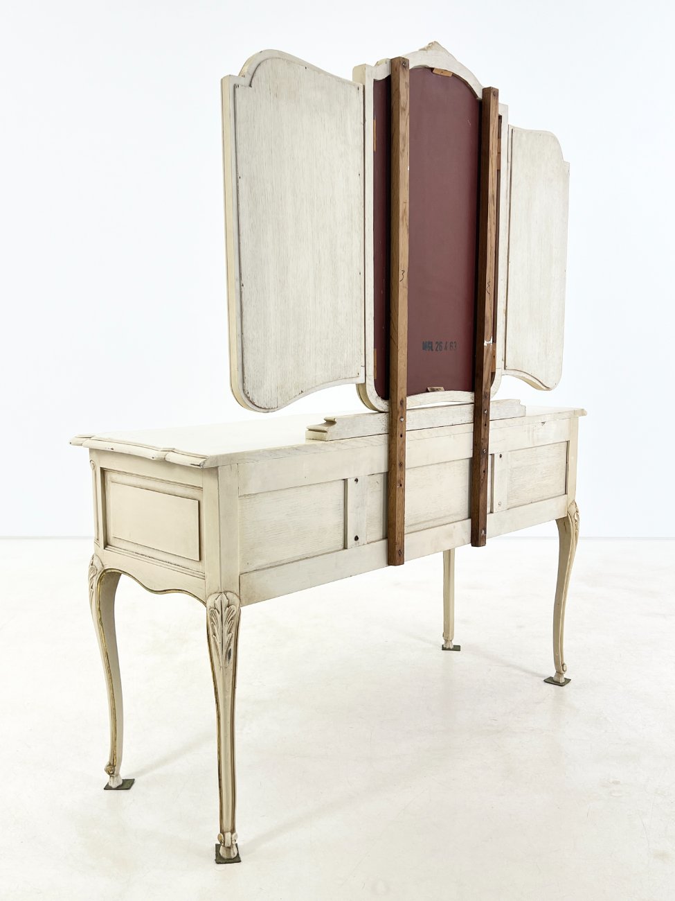 | Papildoma informacija | Matomos naudojimo žymės, per visą paviršių yra pabraižymų, dažų pažeidimų. Ant centrinio veidrodžio yra stiklo gaminimo broko. |