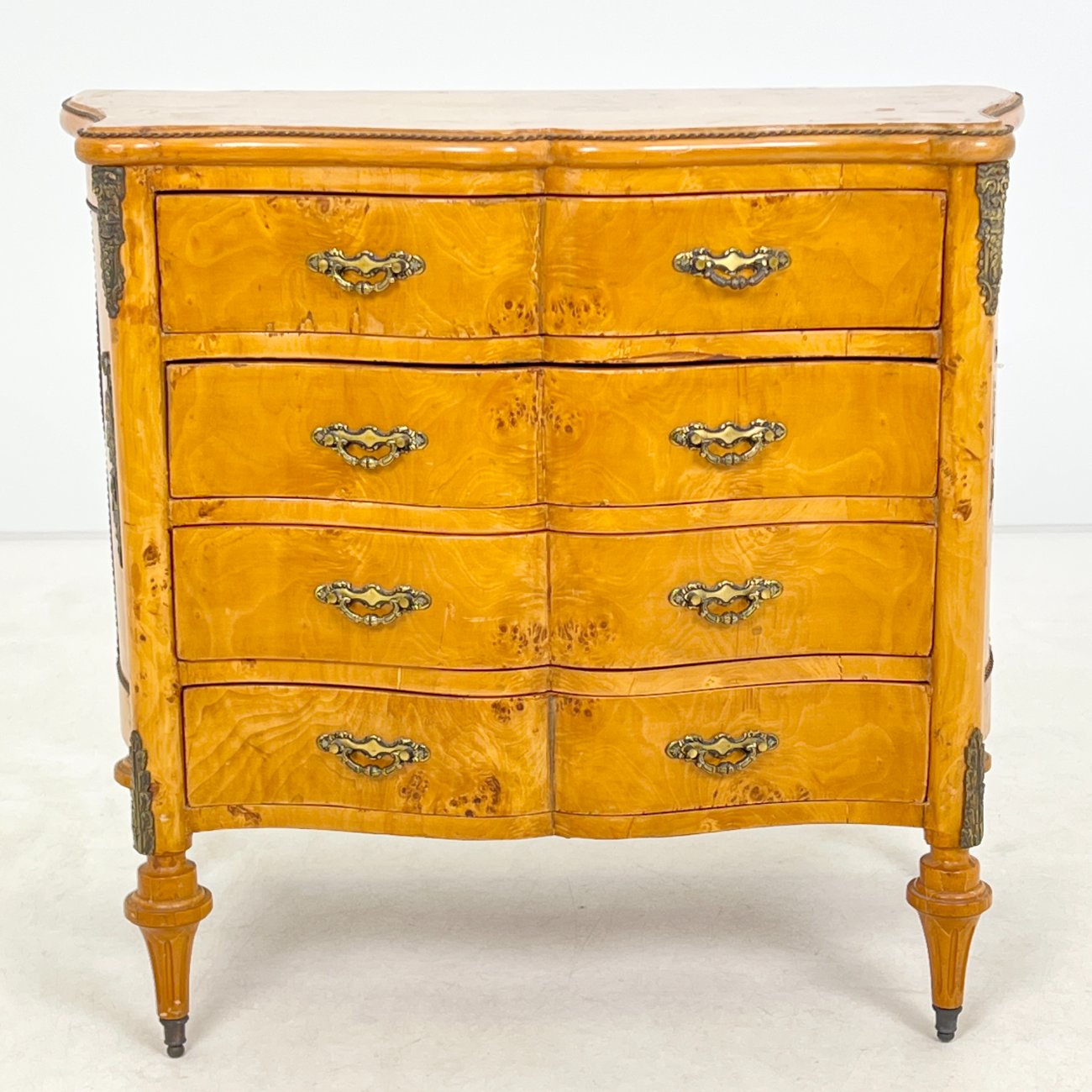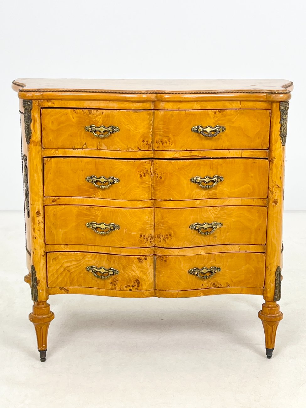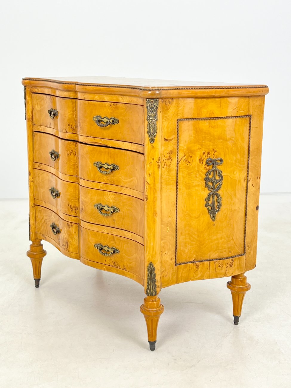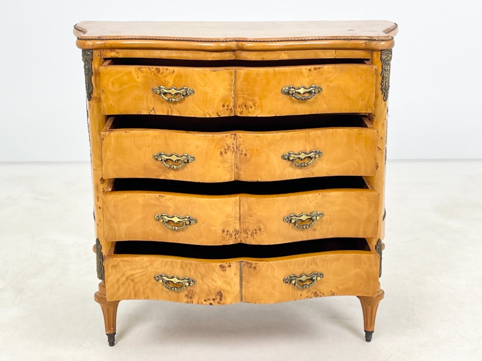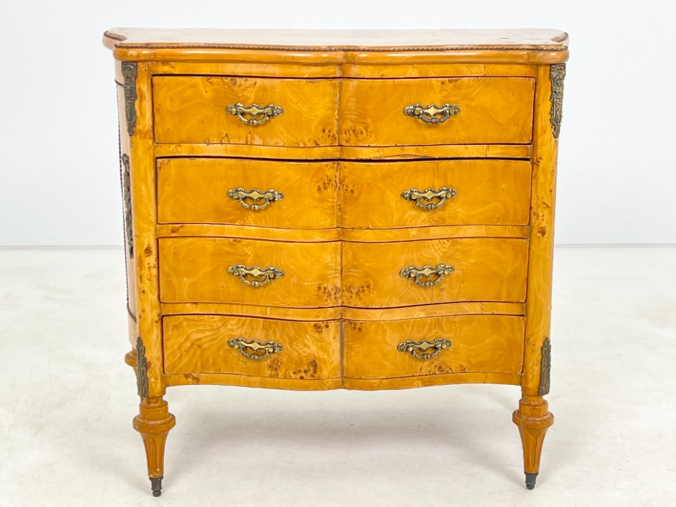Riešutmedžio lukšto keturių stalčių komoda su žalvario apdailomis.
