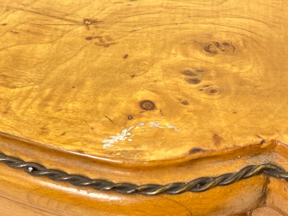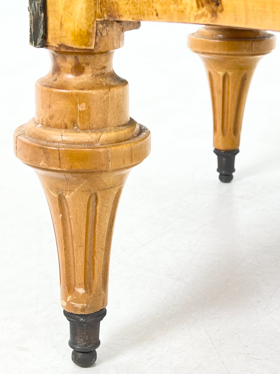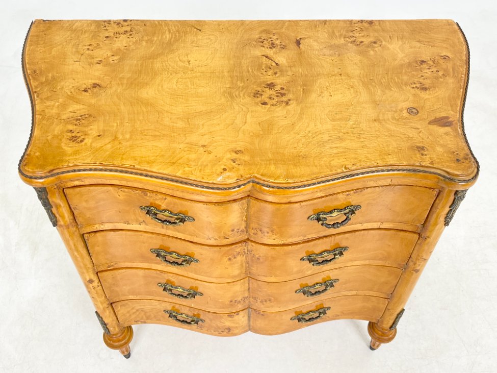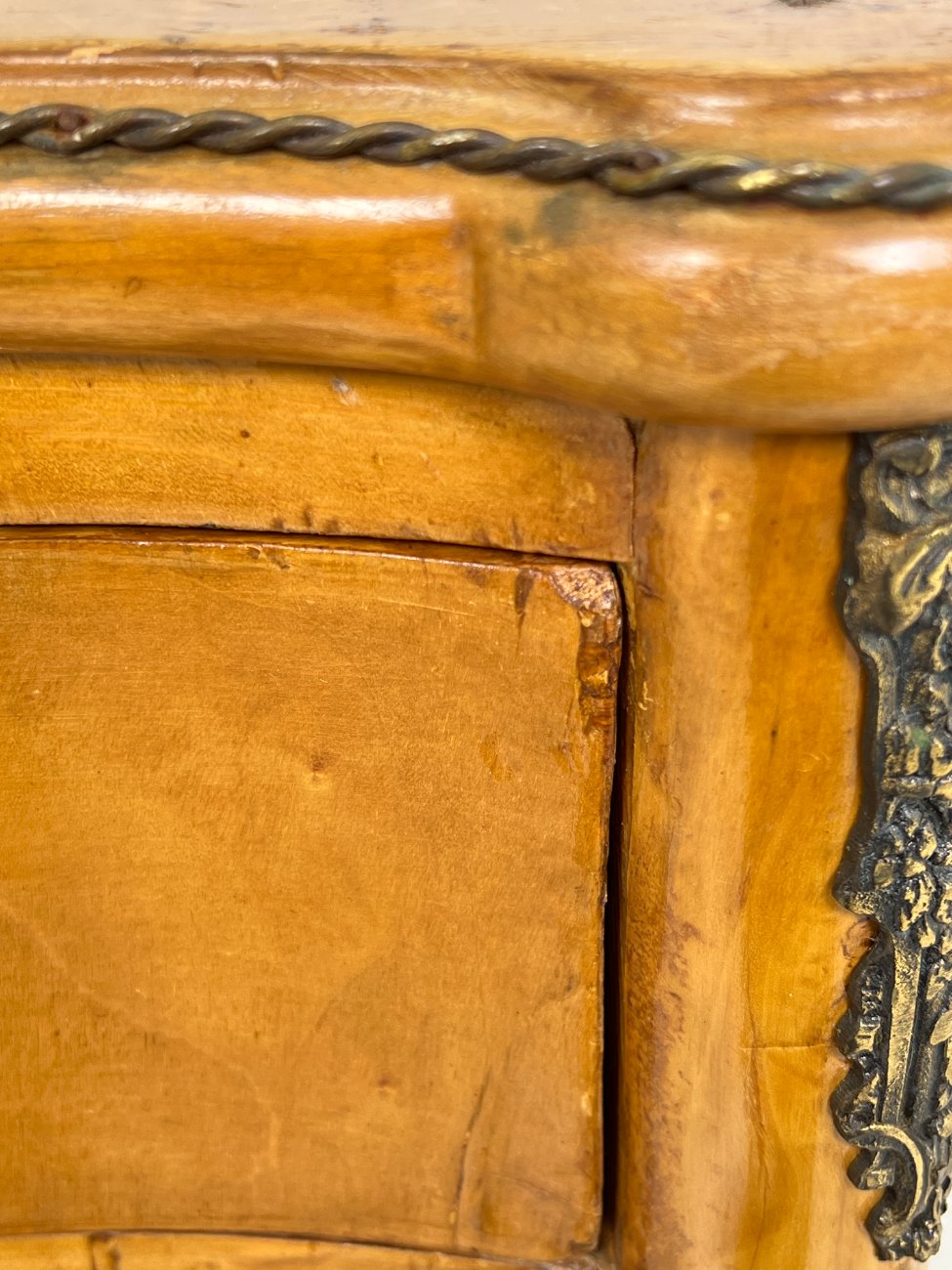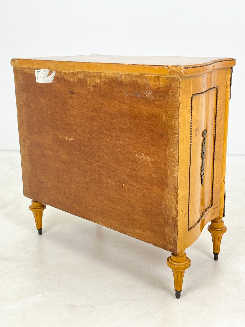 Riešutmedžio lukšto keturių stalčių komoda su žalvario apdailomis.