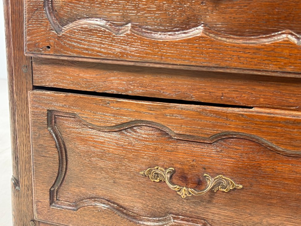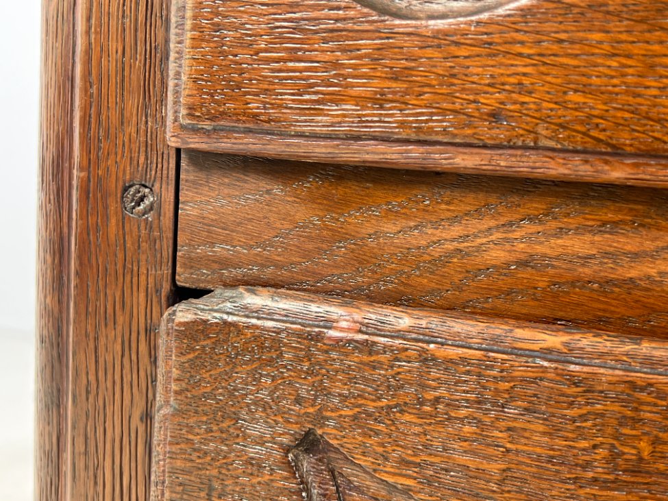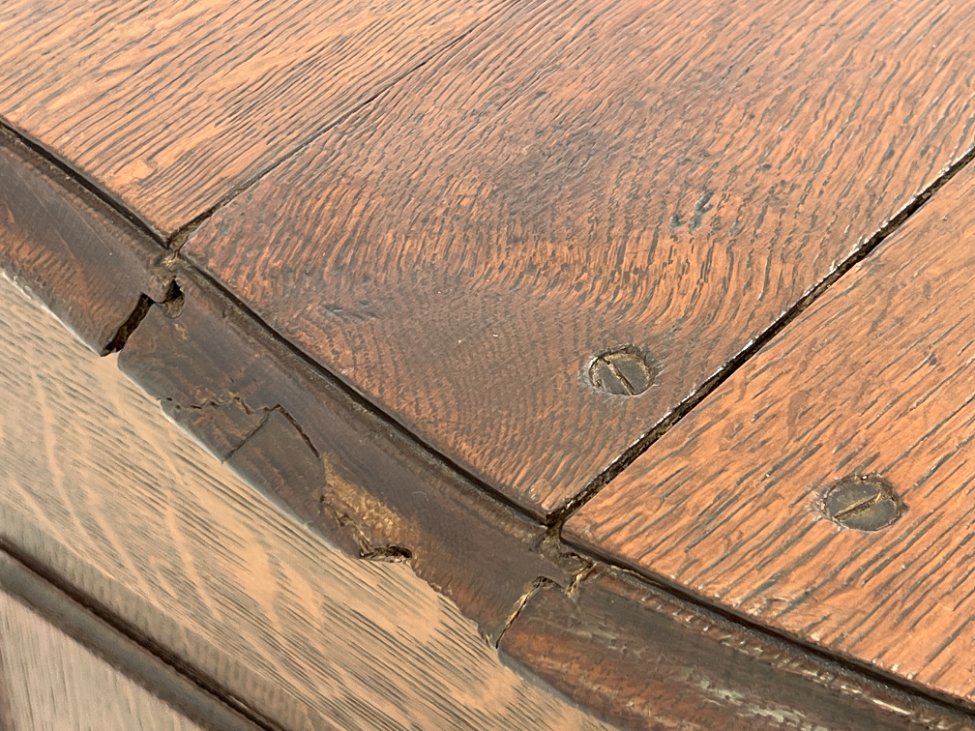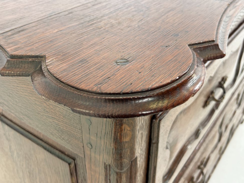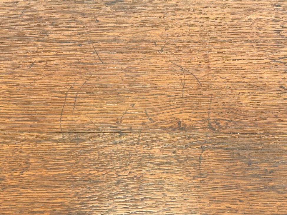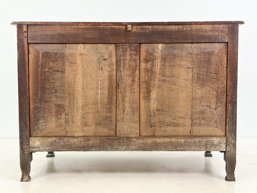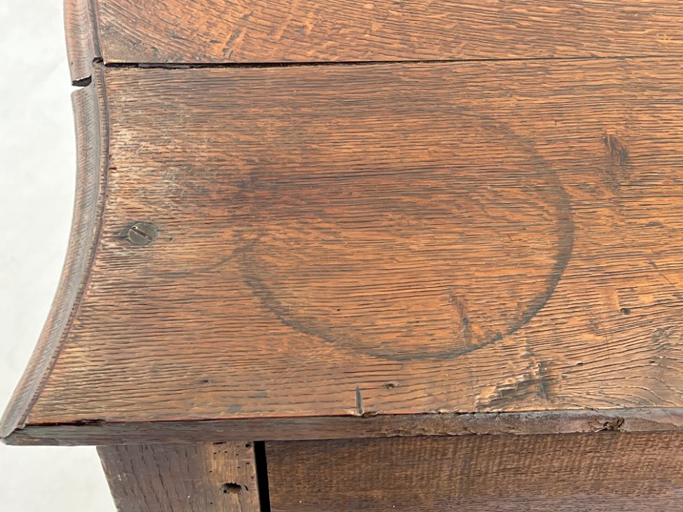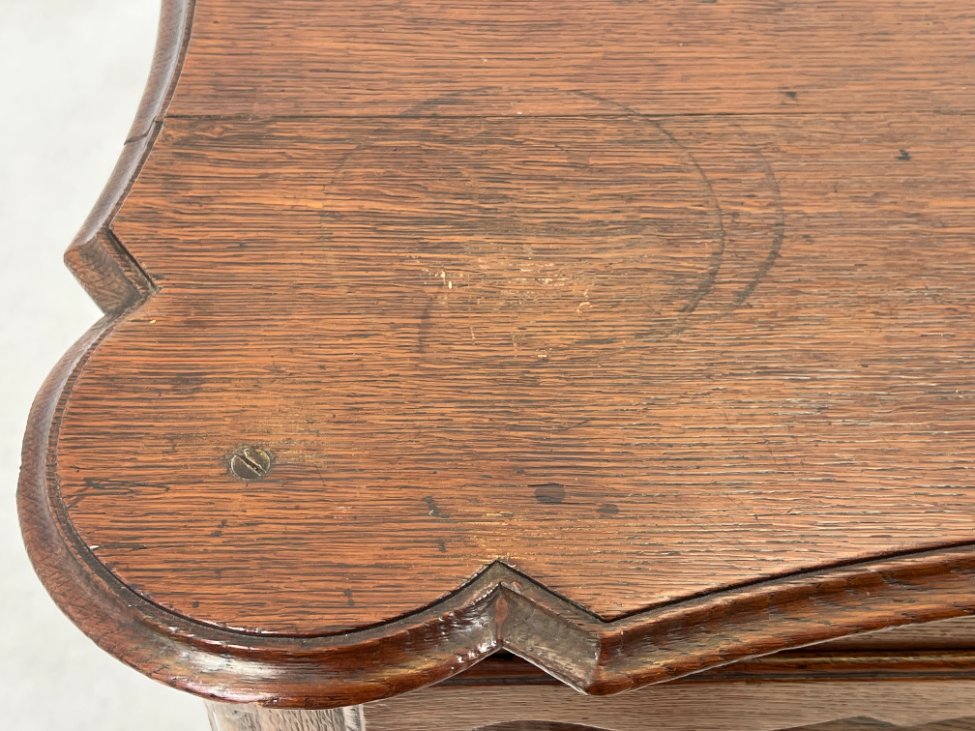 | Papildoma informacija | Matomos naudojimo ir amžiaus žymės, per visą paviršių yra pabraižymų, įmušimų, dėmių, medienos įtrūkimų. Yra kinivarpų pažeidimų. Vietomis aplaužyta mediena, aplaužyti kojų galiukai, stalčių kraštinės, Vietomis trūksta medinių tvirtinimo kaiščių. |