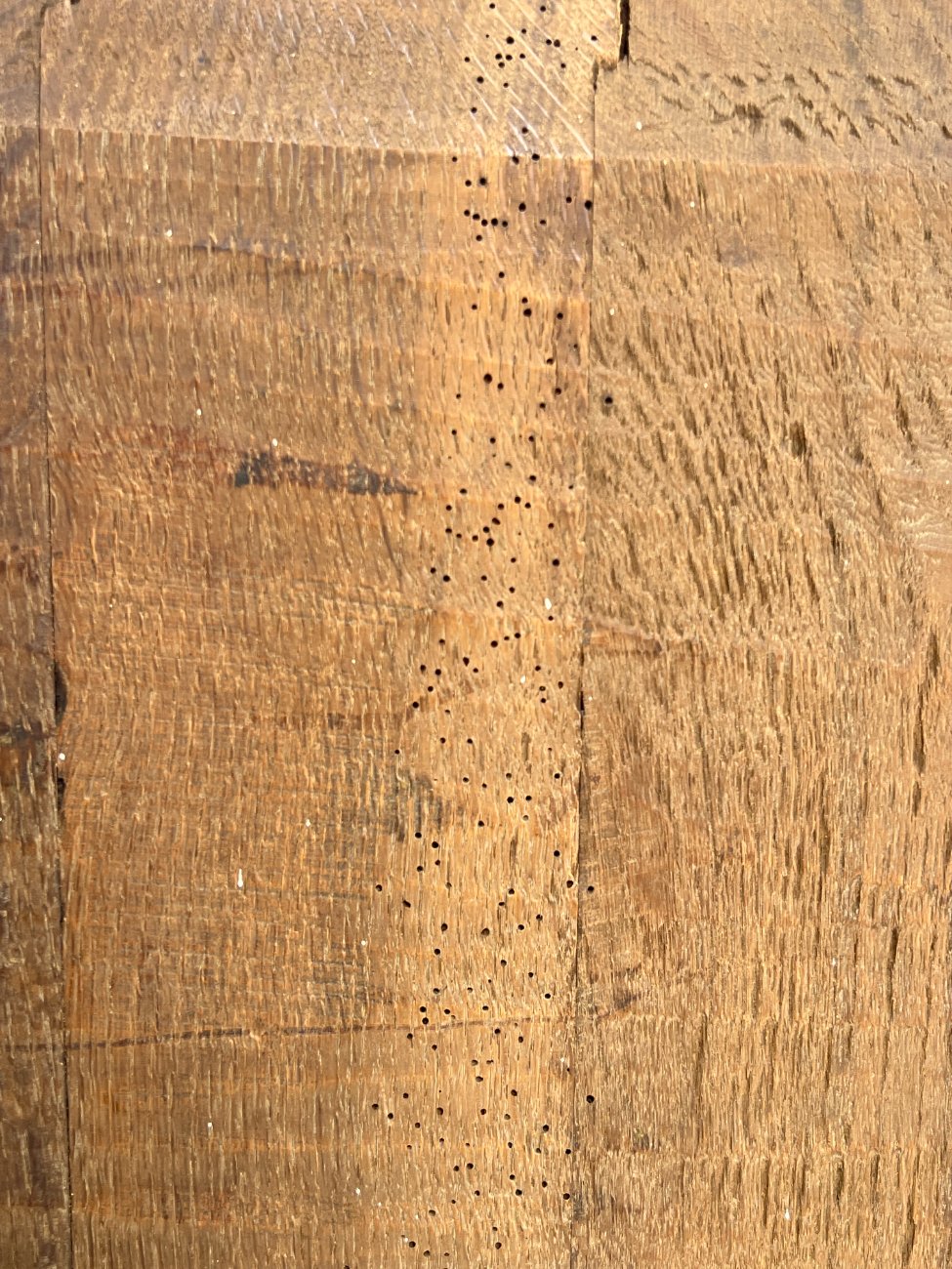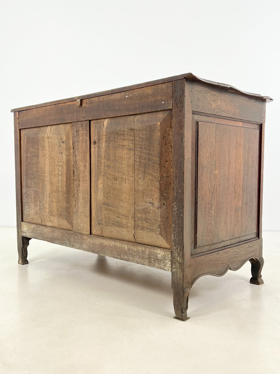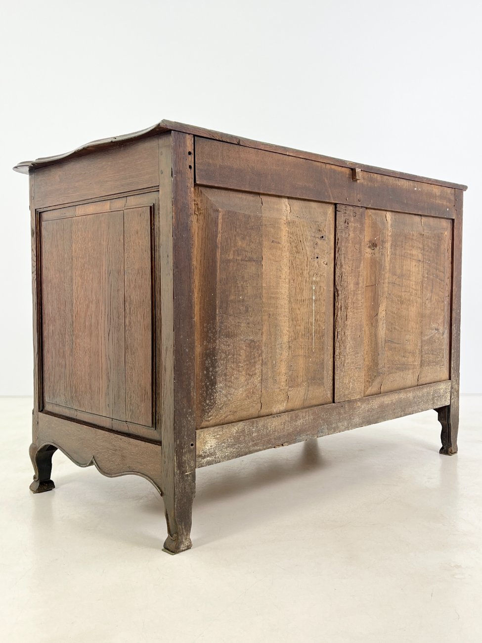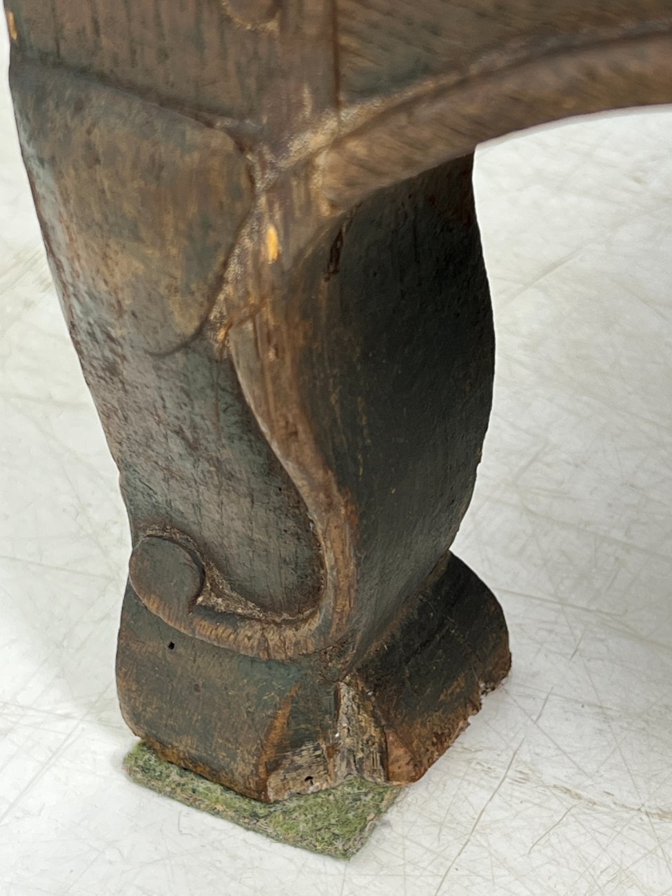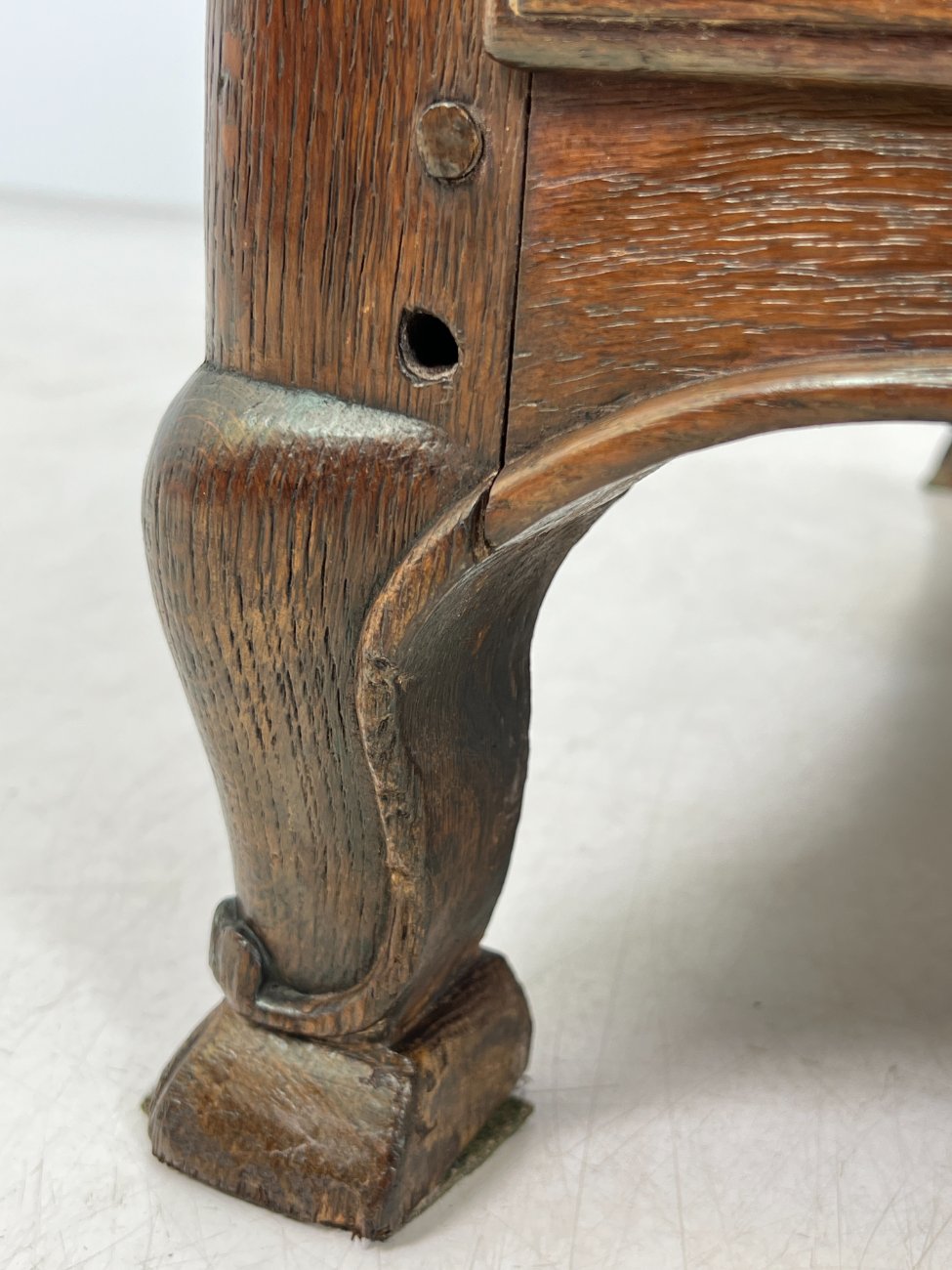 | Papildoma informacija | Matomos naudojimo ir amžiaus žymės, per visą paviršių yra pabraižymų, įmušimų, dėmių, medienos įtrūkimų. Yra kinivarpų pažeidimų. Vietomis aplaužyta mediena, aplaužyti kojų galiukai, stalčių kraštinės, Vietomis trūksta medinių tvirtinimo kaiščių. |