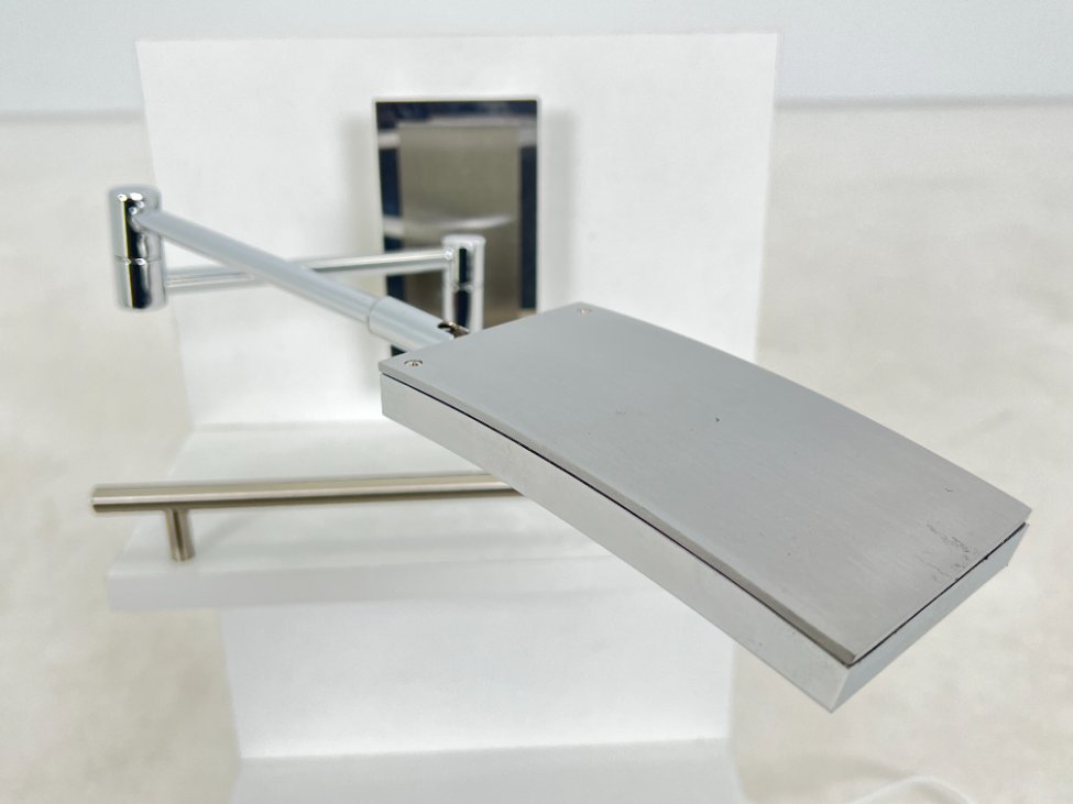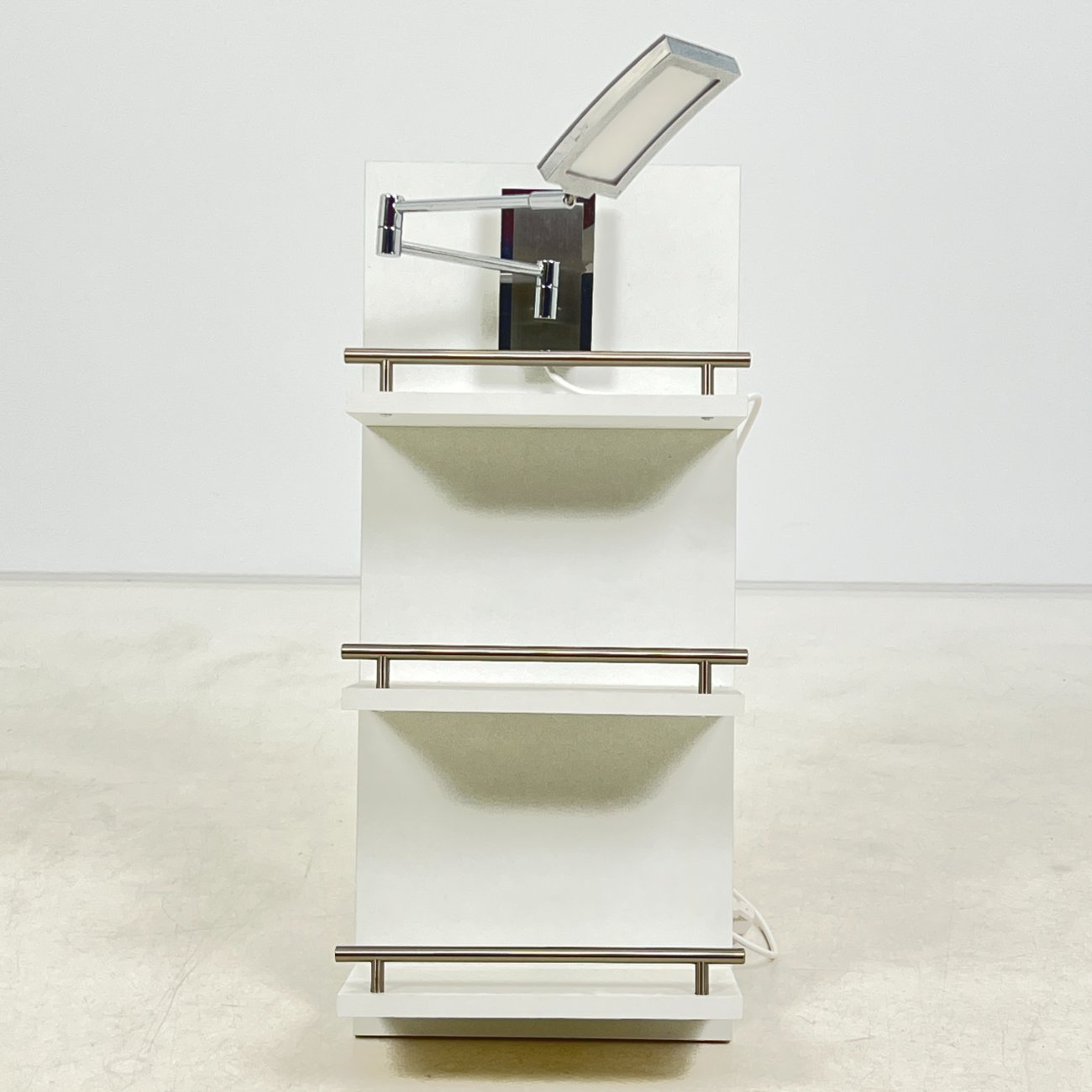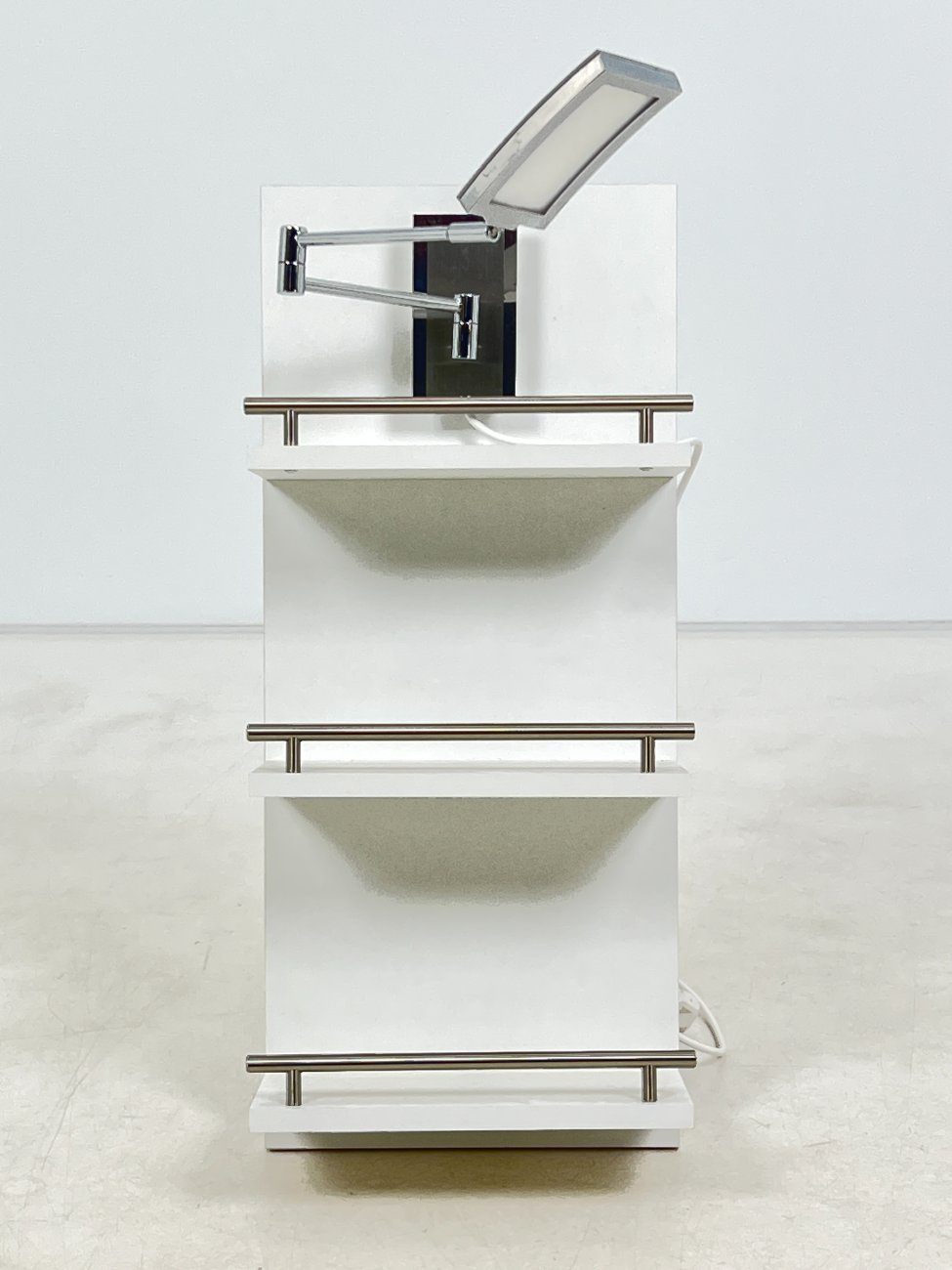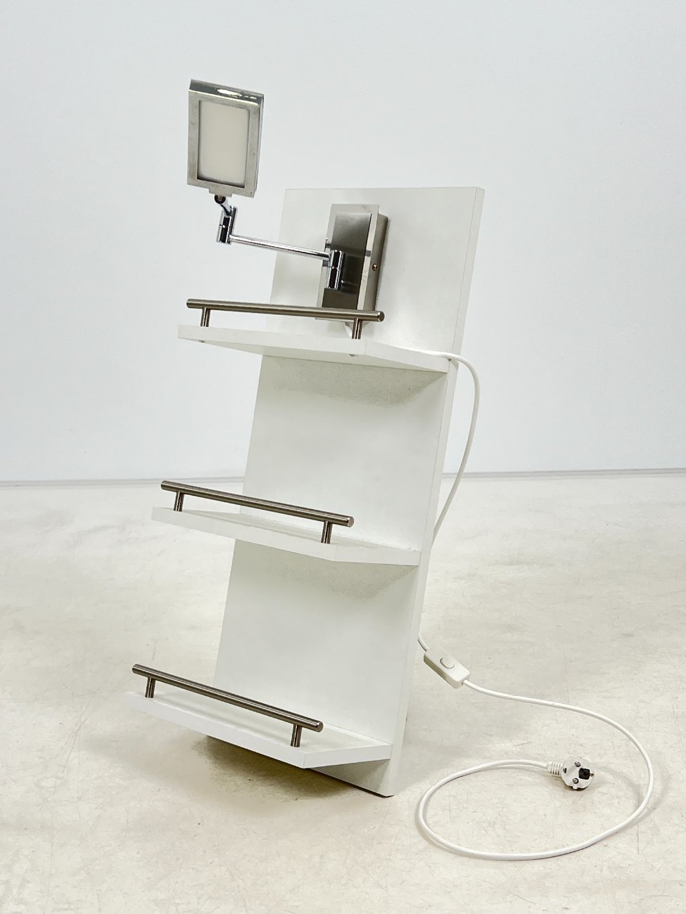 Pakabinama baltos spalvos lentyna su apšvietimu.