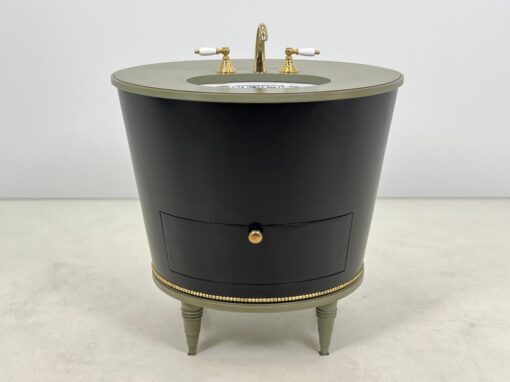 Apvali vonios spintelė su keramikiniu praustuvu ir žalvariniu maišytuvu.