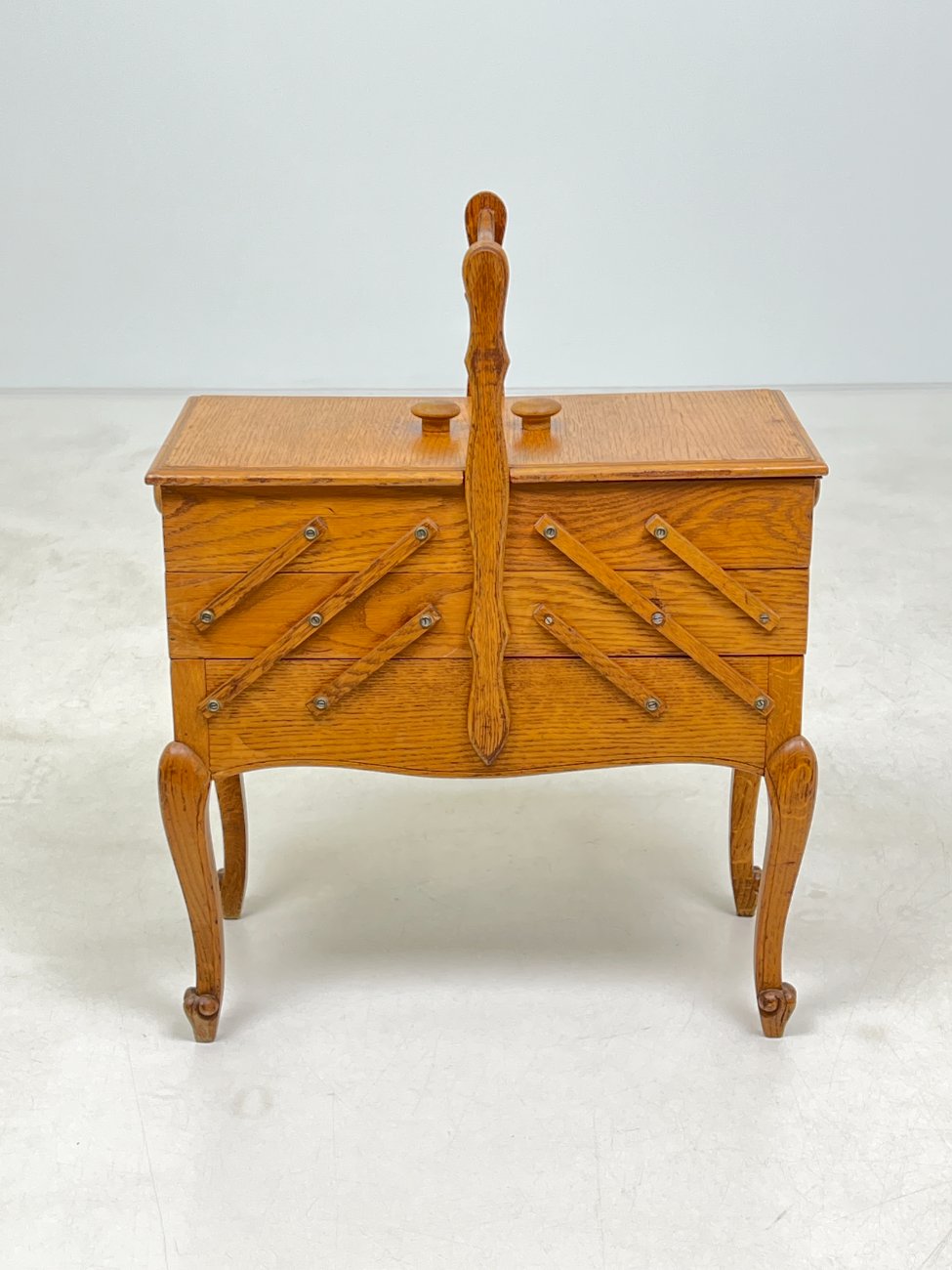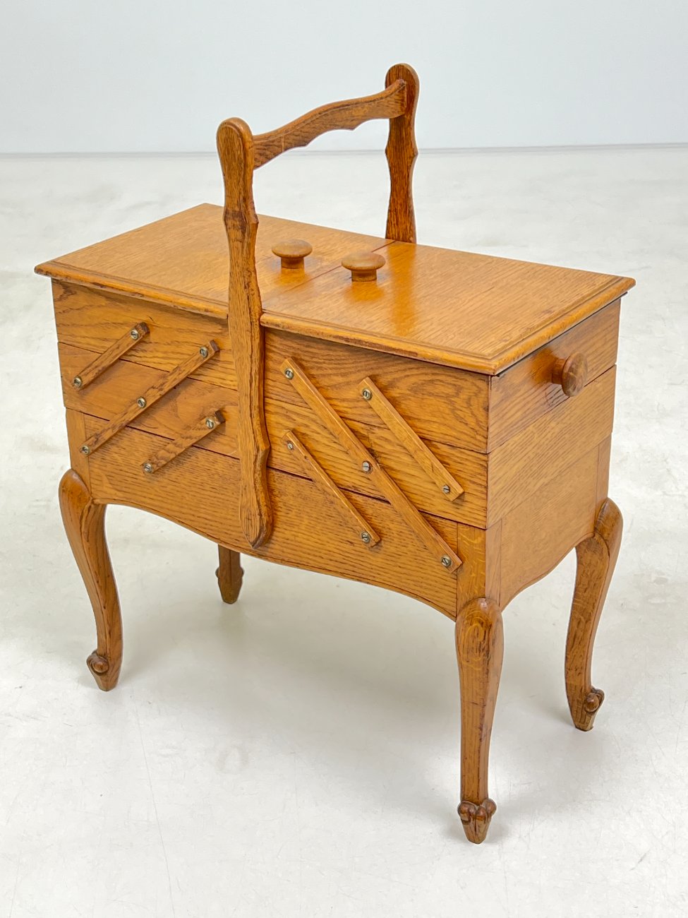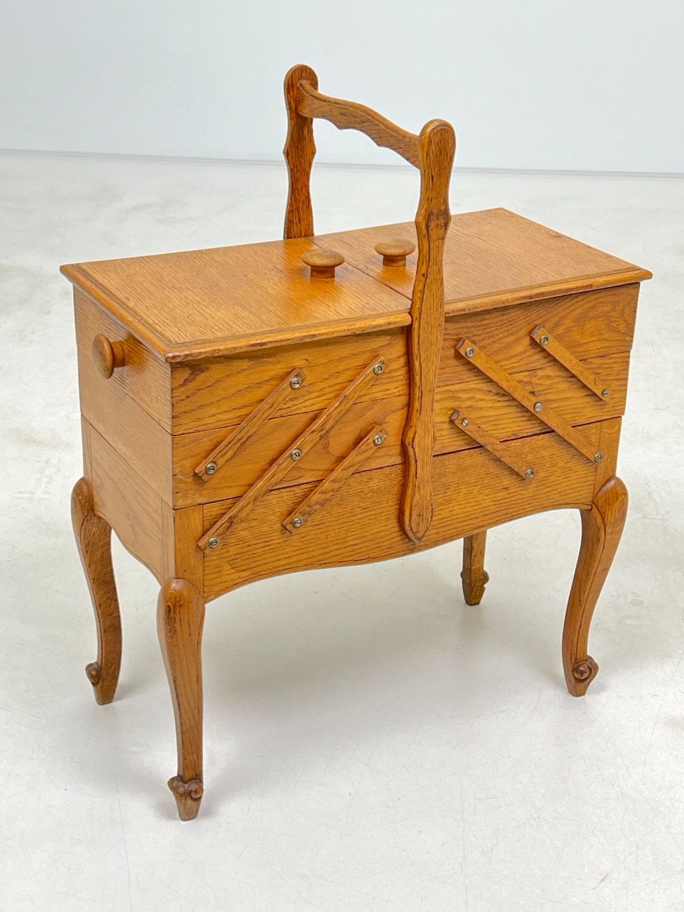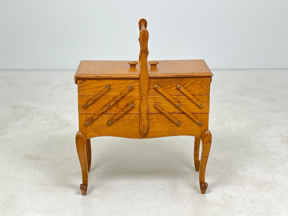 Ąžuolinė siuvinėjimo reikmenų spintelė.