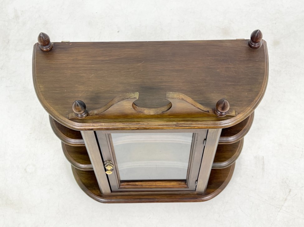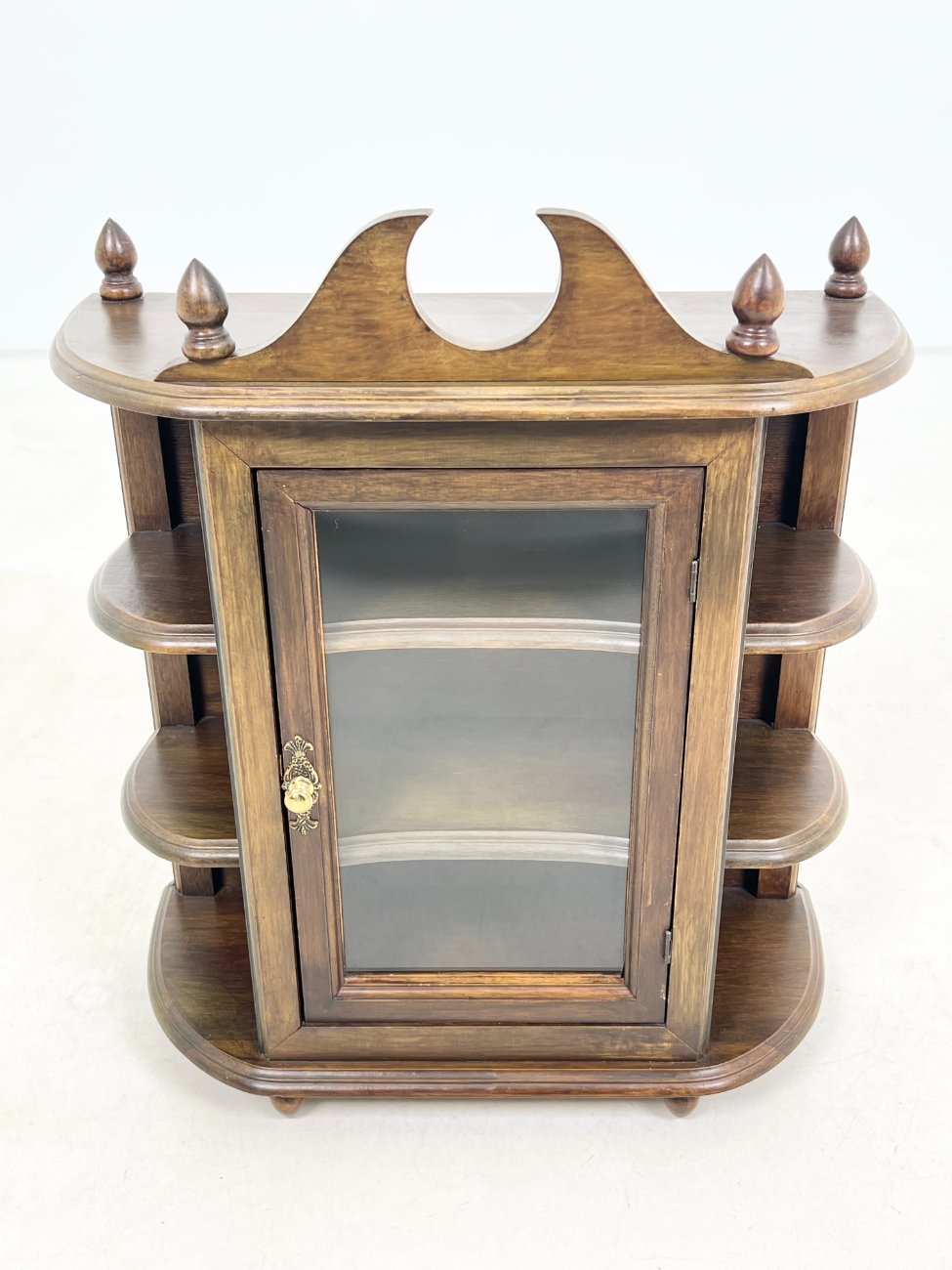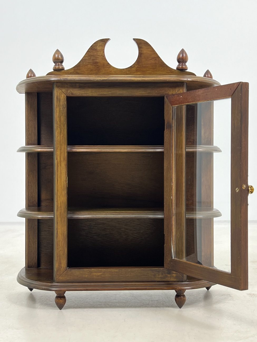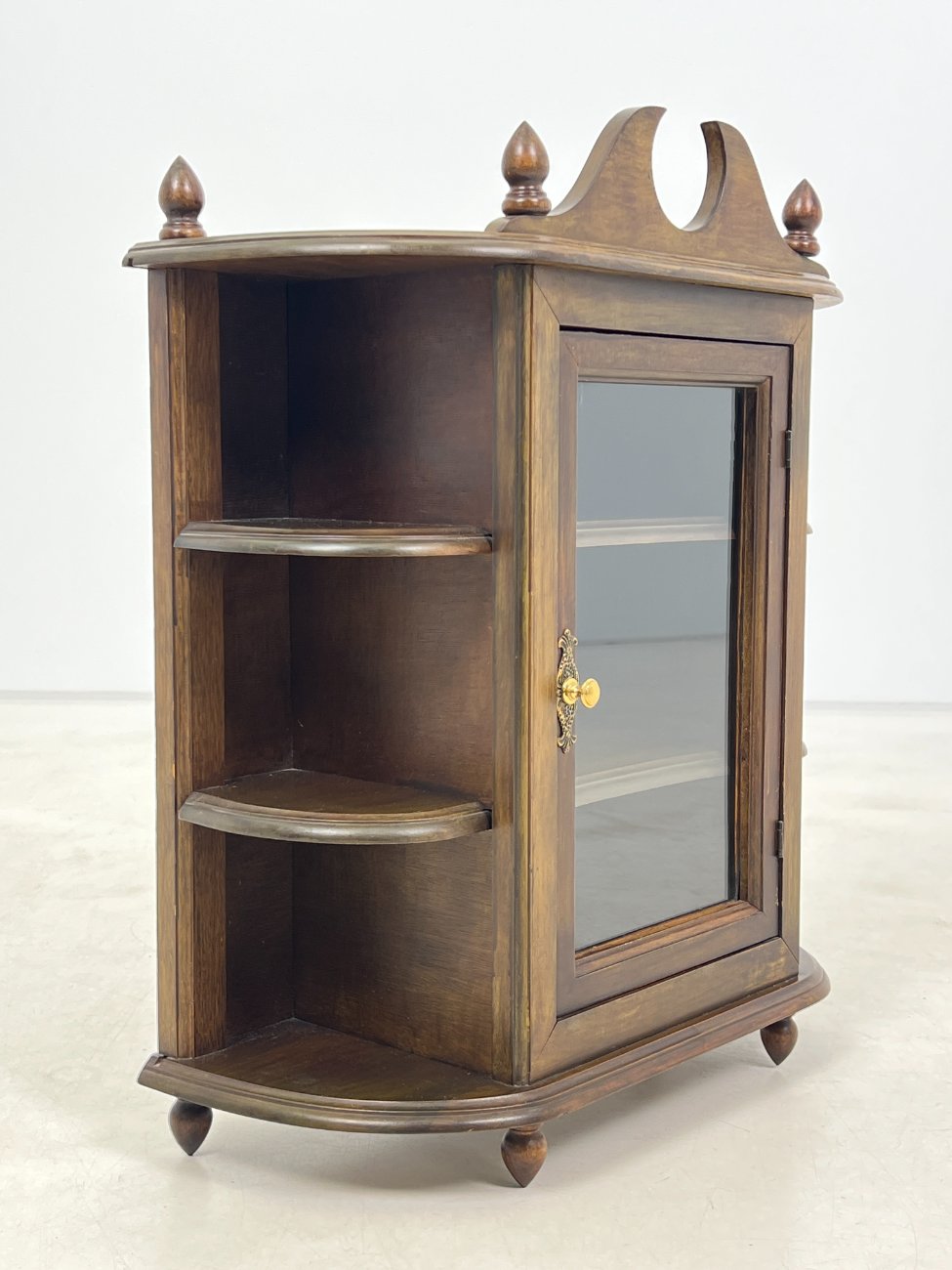 Pakabinama riešutmedžio spintelė su stiklu ir lentynėlėmis.