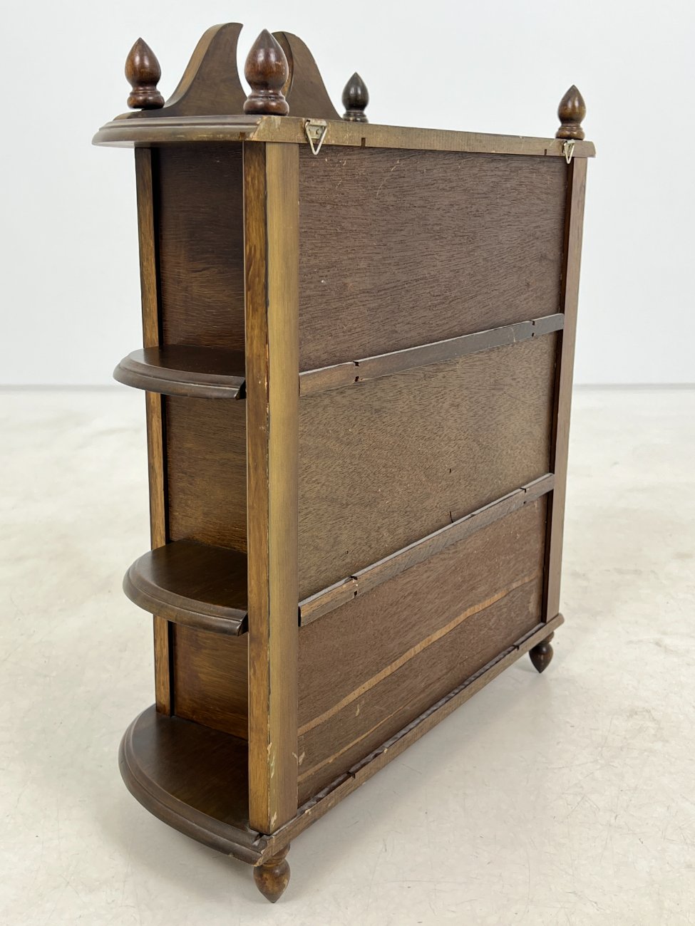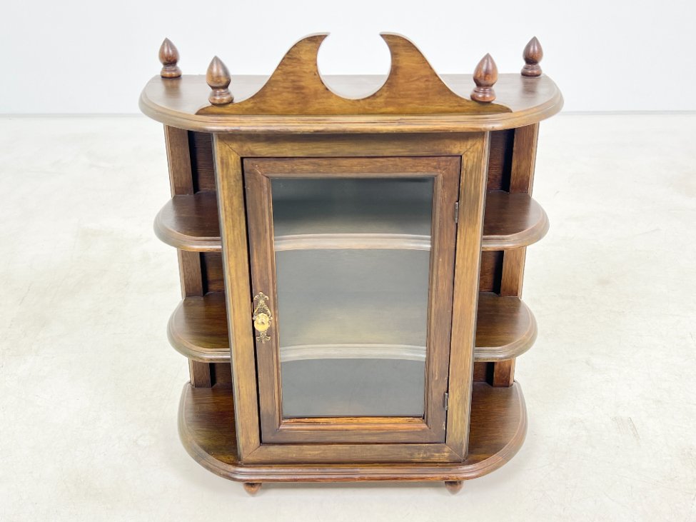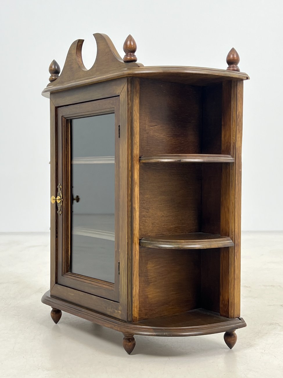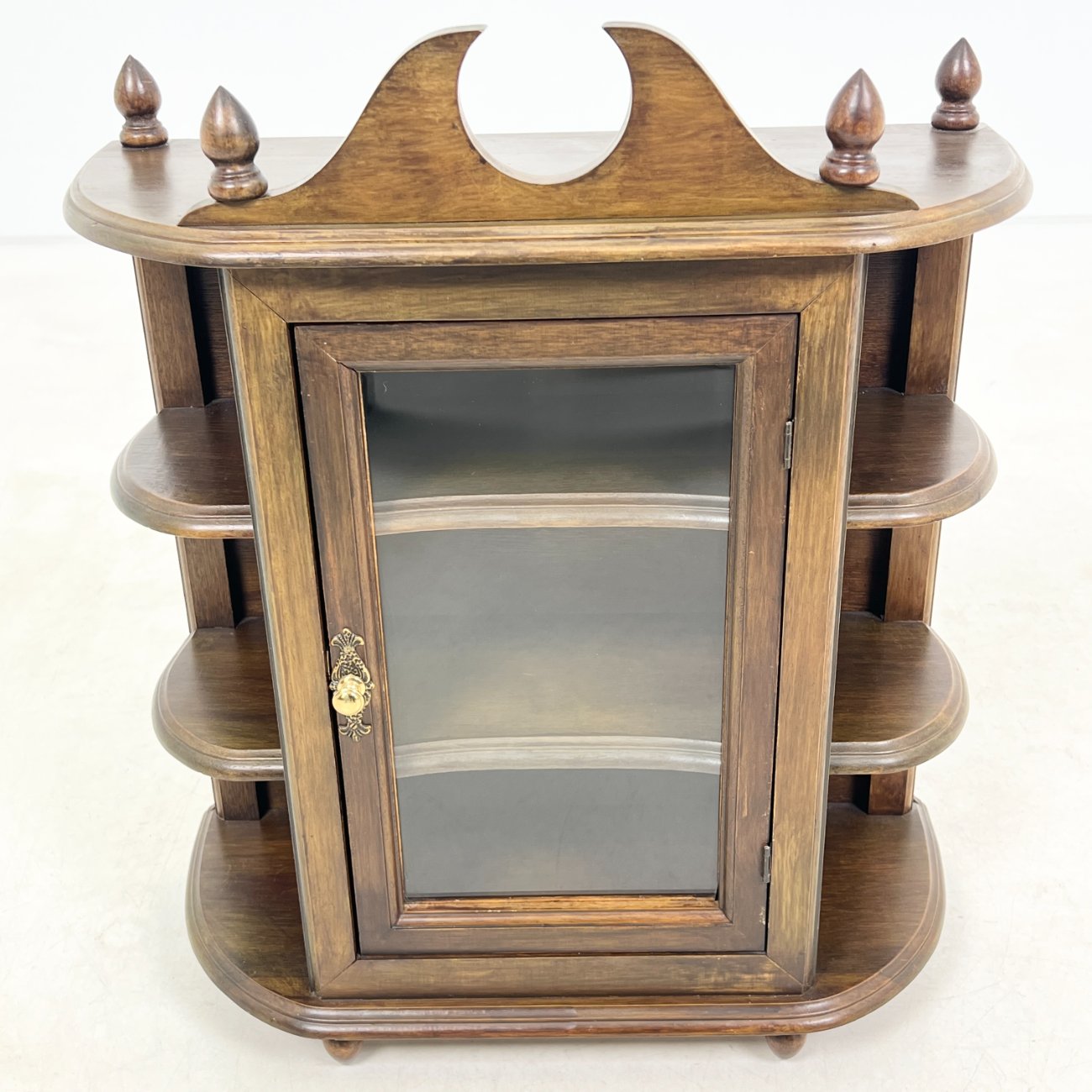 Pakabinama riešutmedžio spintelė su stiklu ir lentynėlėmis.