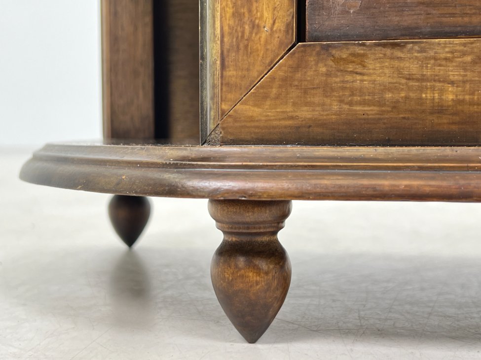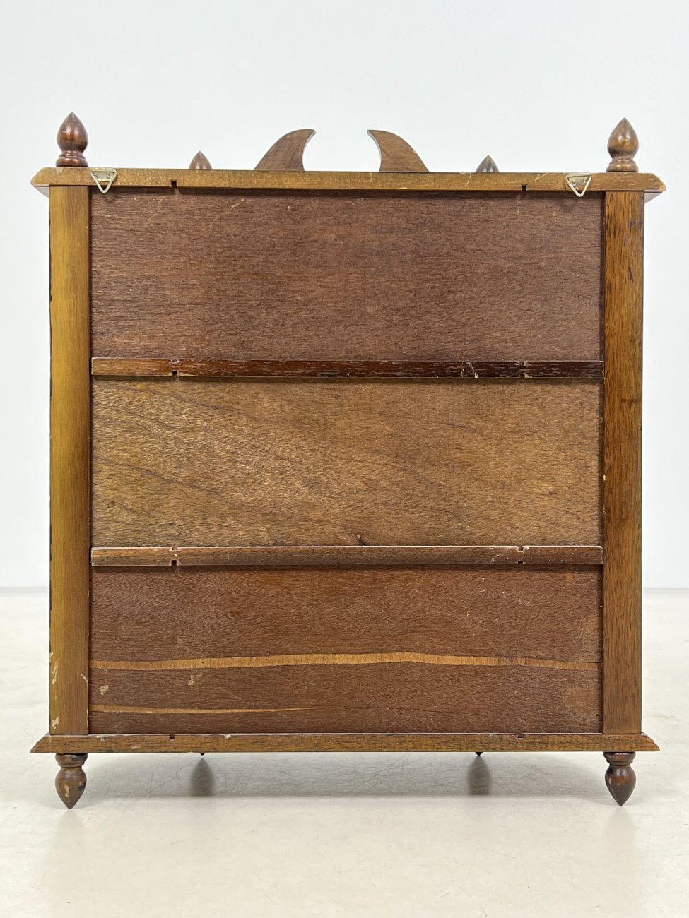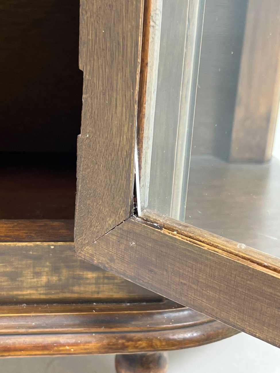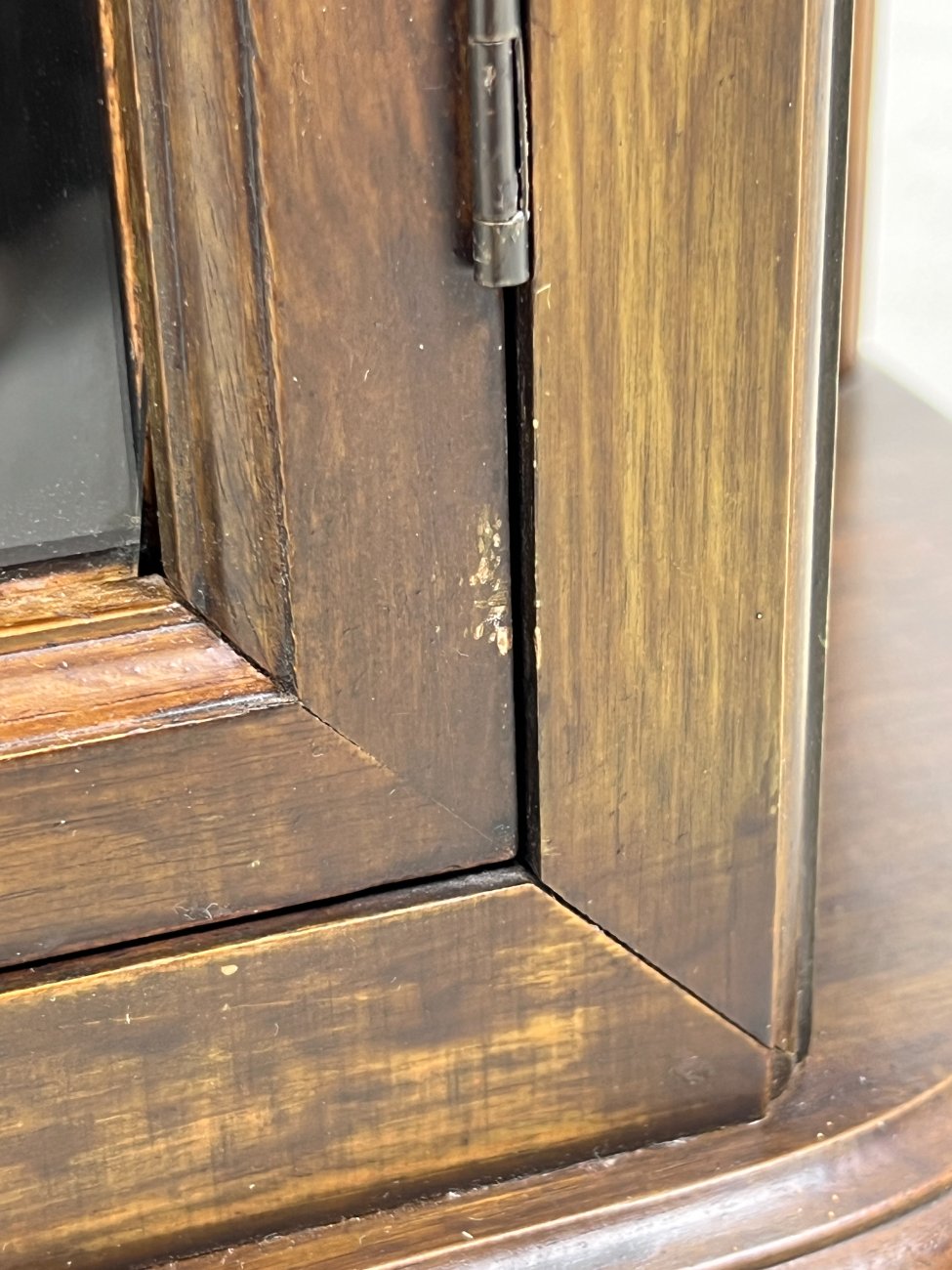 Pakabinama riešutmedžio spintelė su stiklu ir lentynėlėmis.