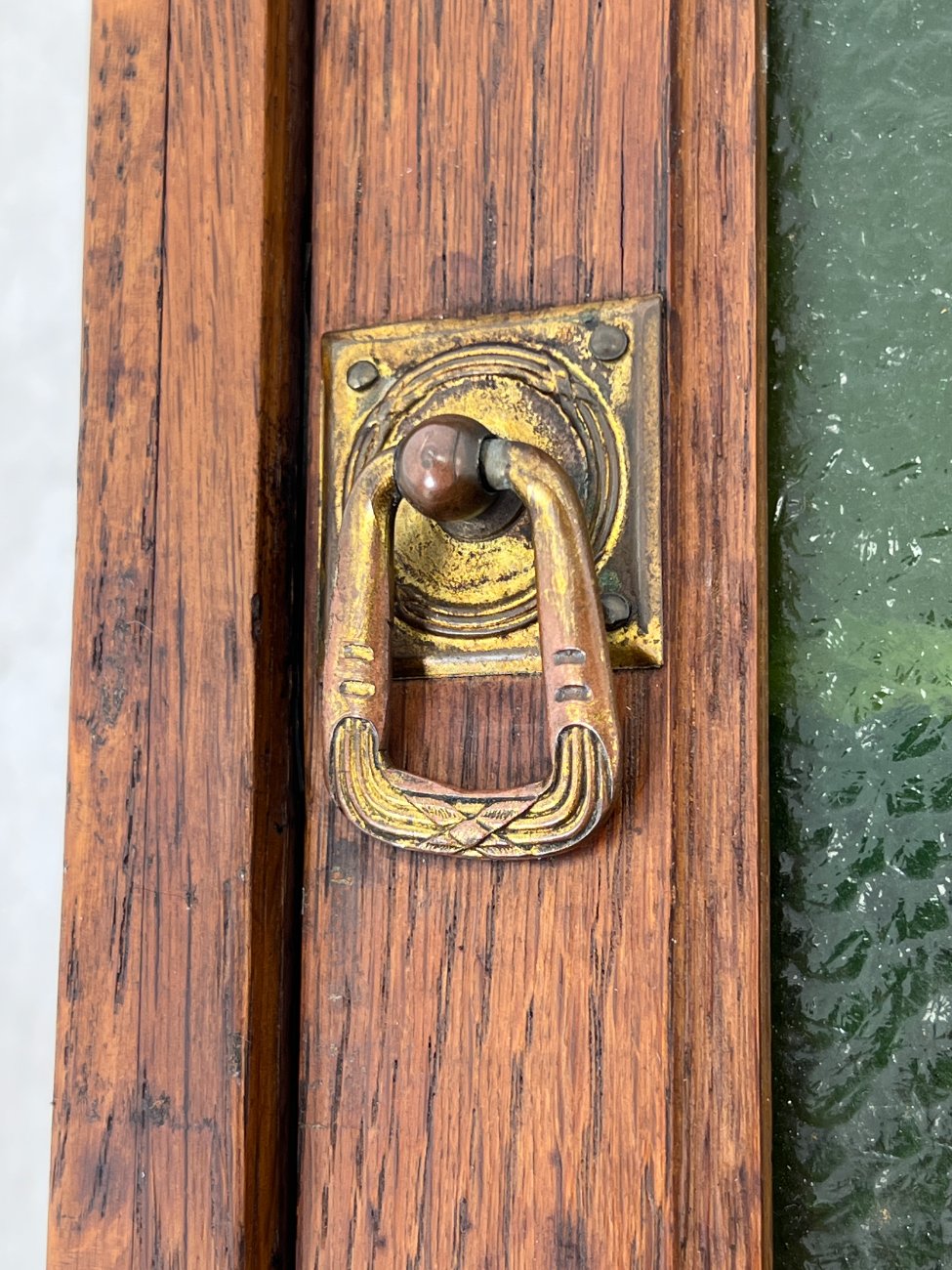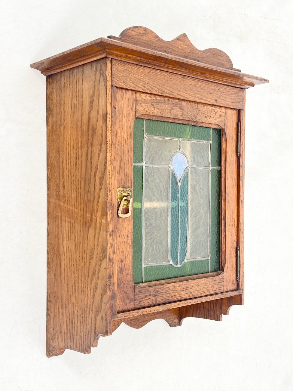 Senovinė ąžuolinė pakabinama spintelė su vitražu.