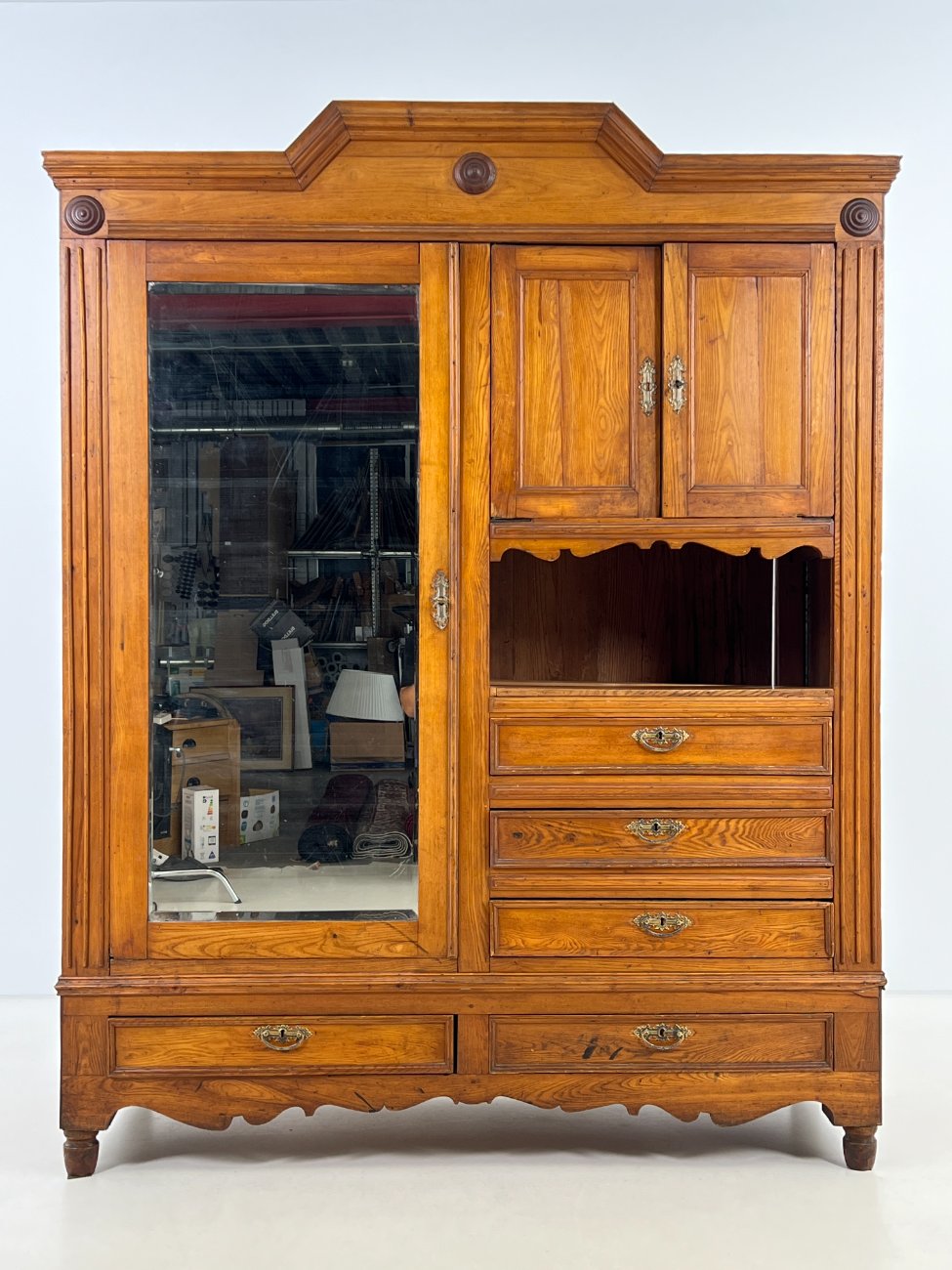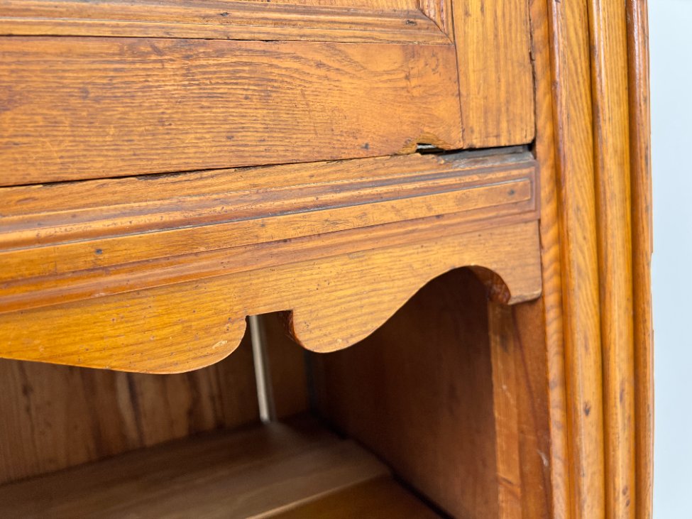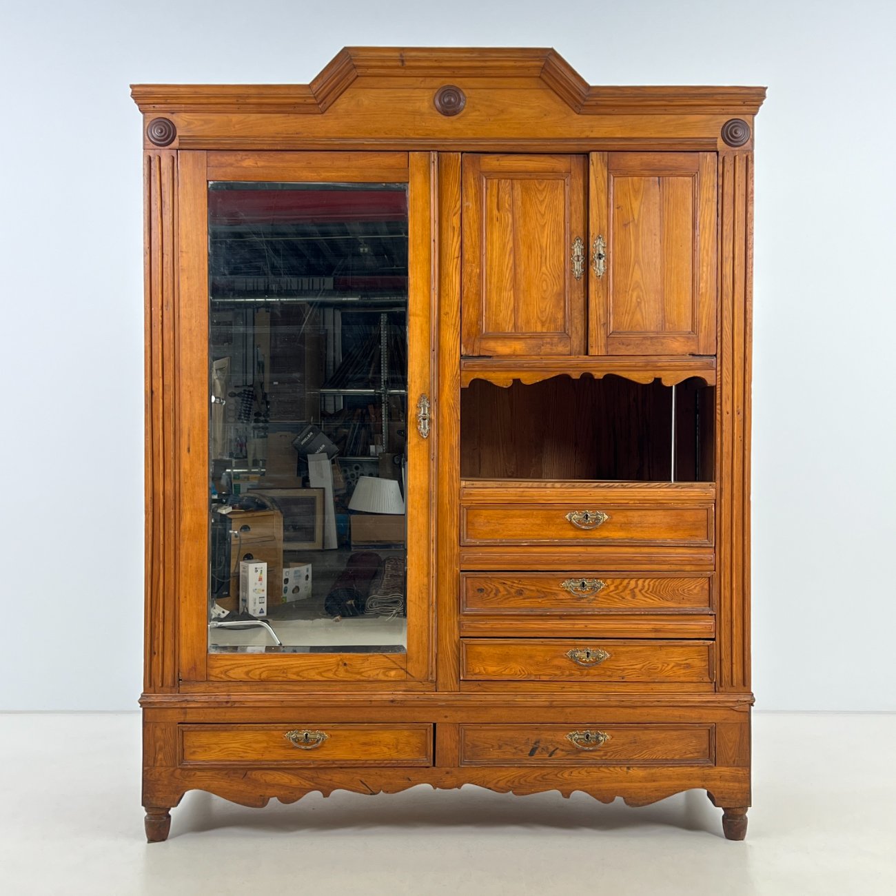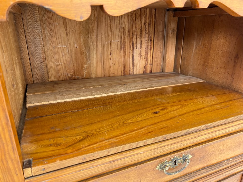 | Papildoma informacija | tarp lentynos ir spintos stalčių neorginali lenta , ant veidrodžio yra senėjimo žymių bei pabraižymų, stalčiuose yra dėmių, dešiniame kampe ties briauna-įmušimas, ant kairių durų trūksta medienos |