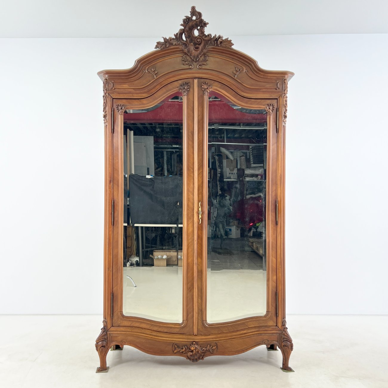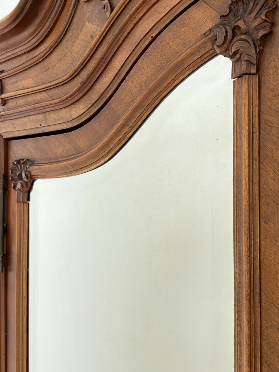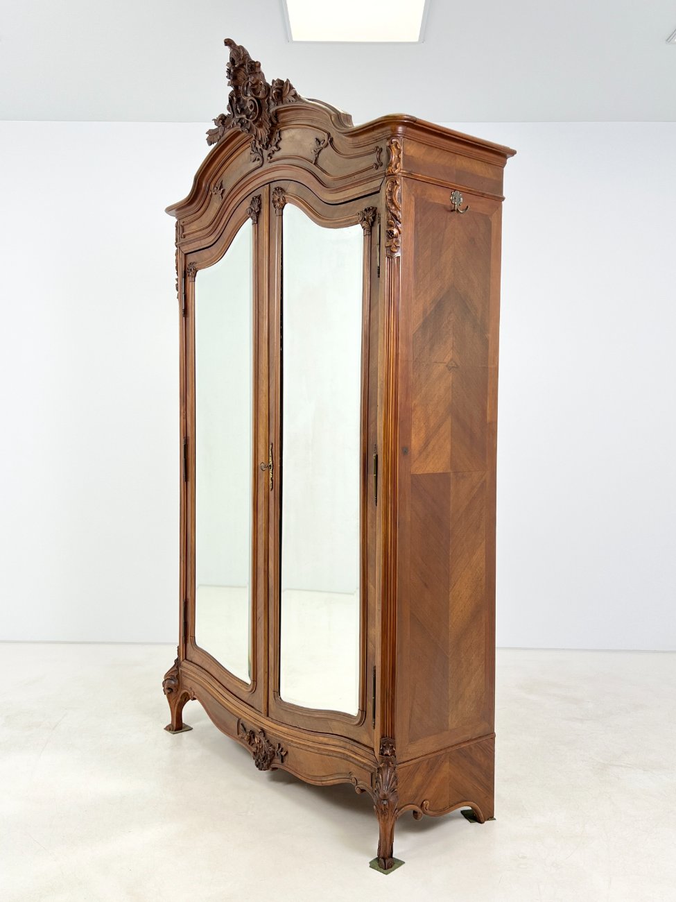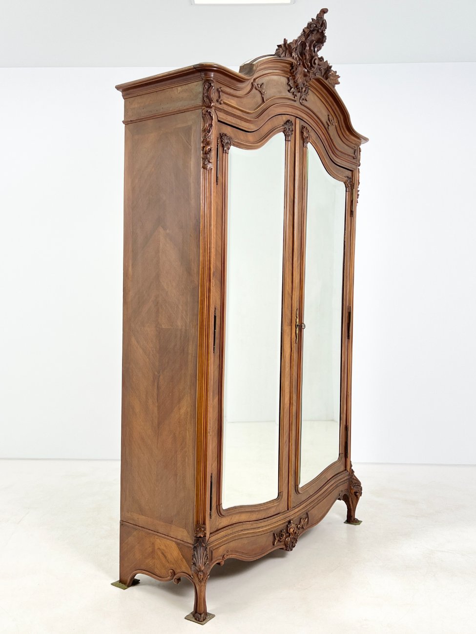 Barokinio stiliaus riešutmedžio dviejų durų spinta su veidrodžiais.