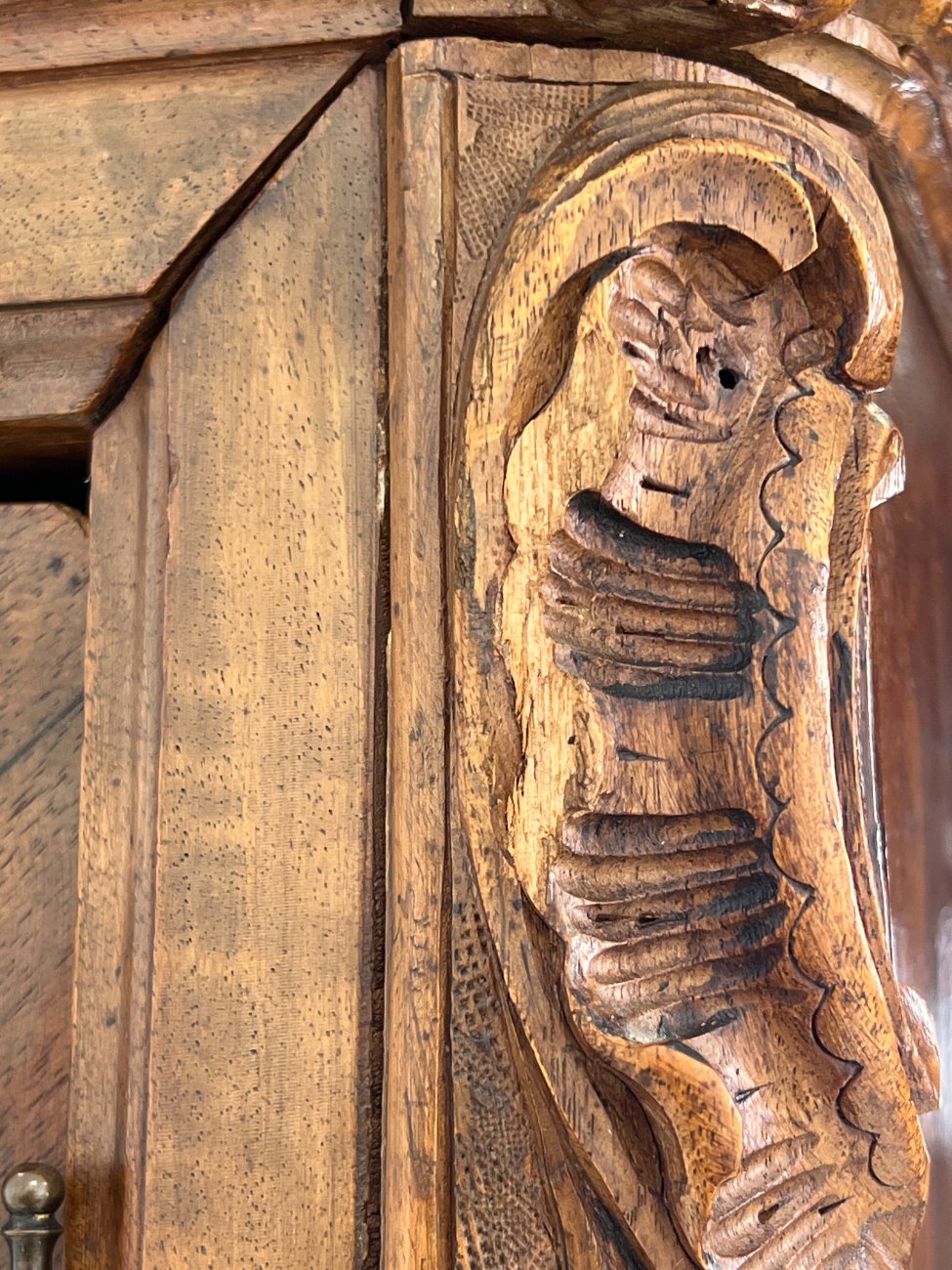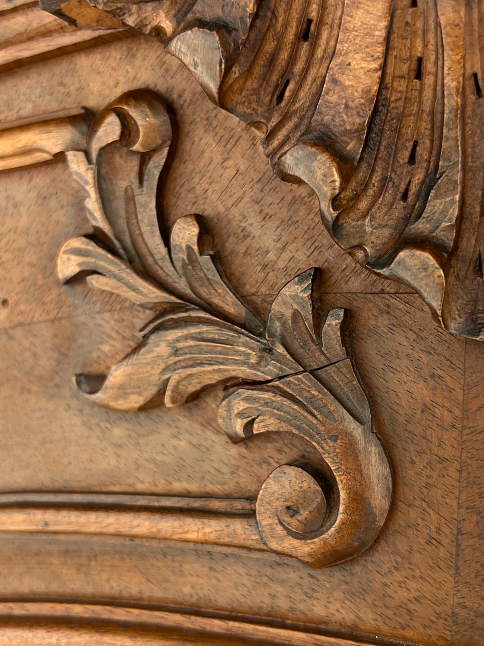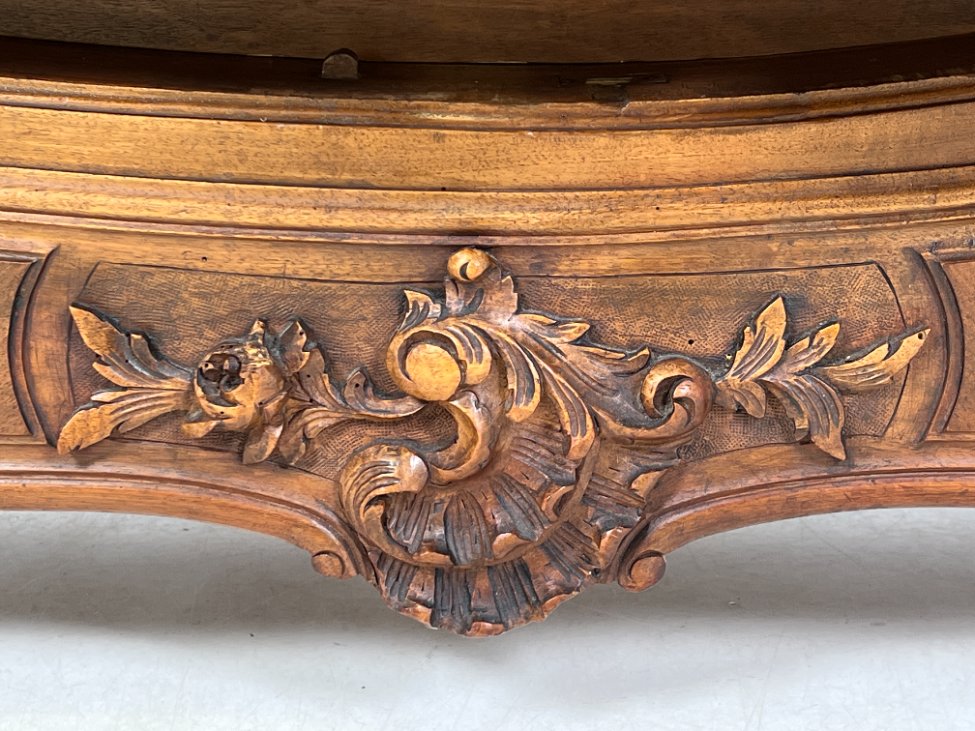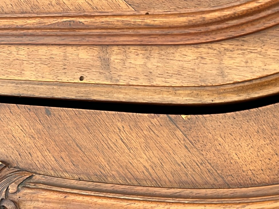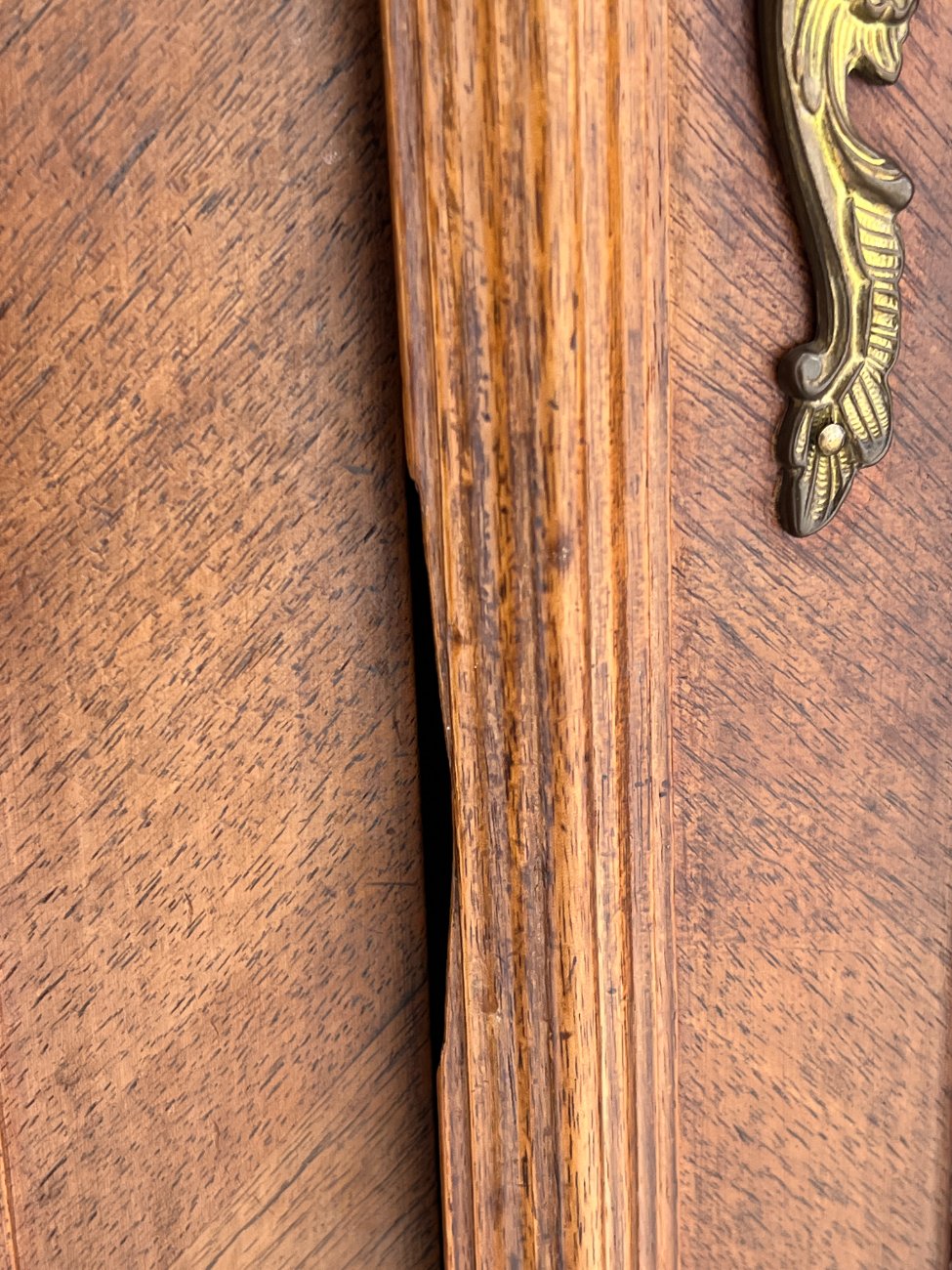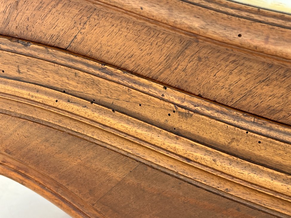 | Papildoma informacija | Aplaužyta ir klijuota centrinė karūnos dalis. Aplaužytas viršutinis drožinys tarp priekio ir dešiniojo šono., Matomos naudojimo ir amžiaus žymės, per visą paviršių yra pabraižymų, įmušimų, dėmių, faneruotės įtrūkimų. Ant veidrodžių yra senėjimo dėmelių. Aplūžinėjusios kojų apačios. Yra kinivarpų pažeidimų. |